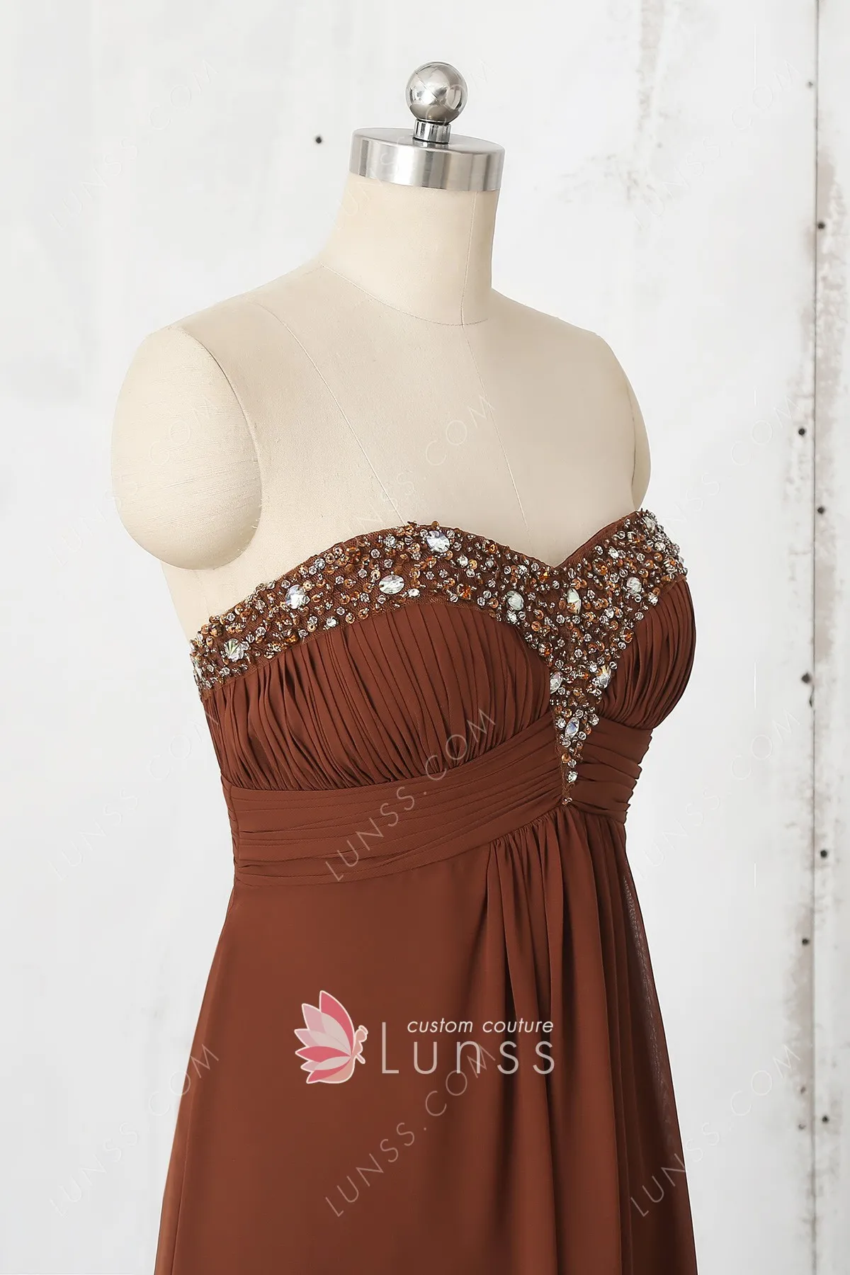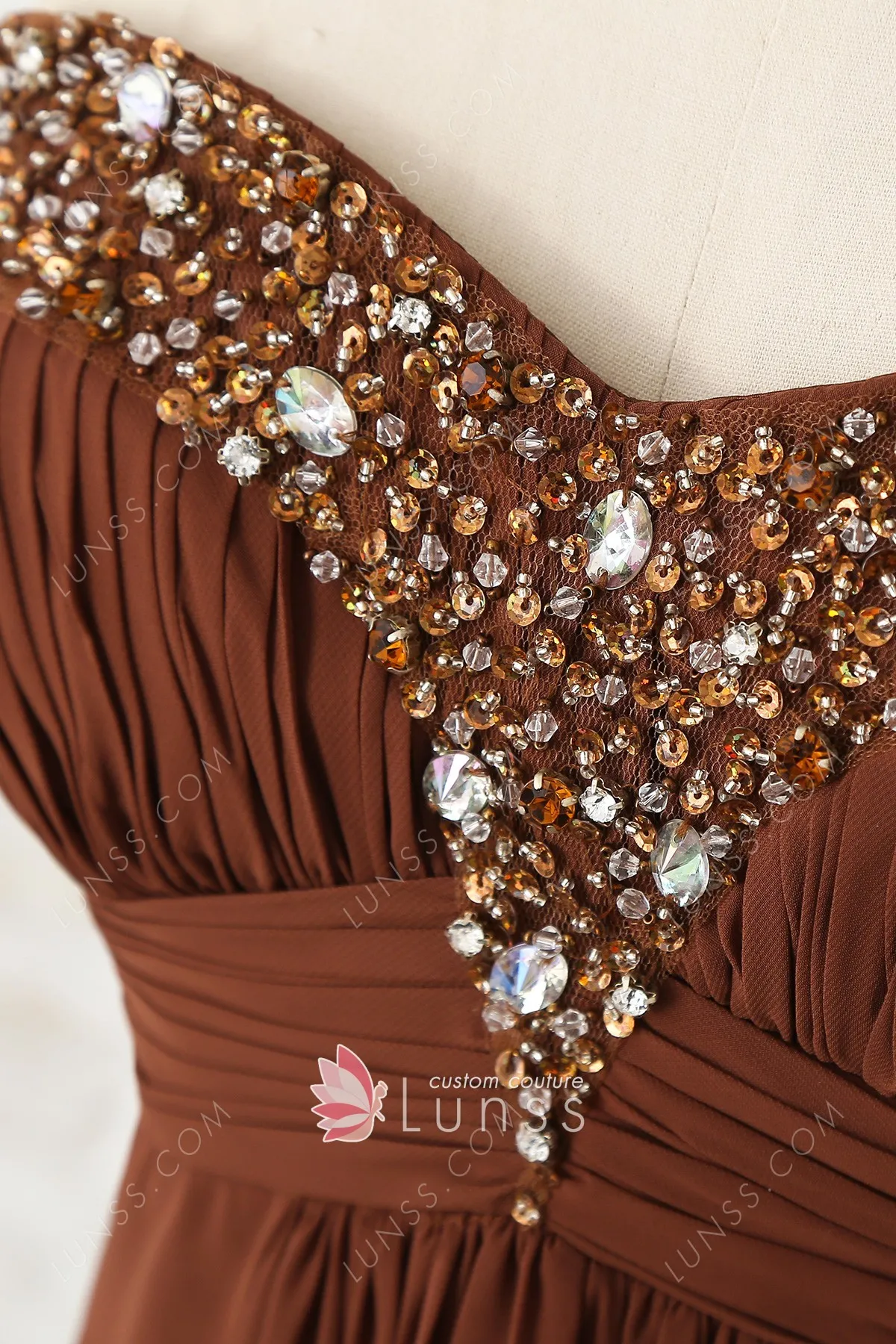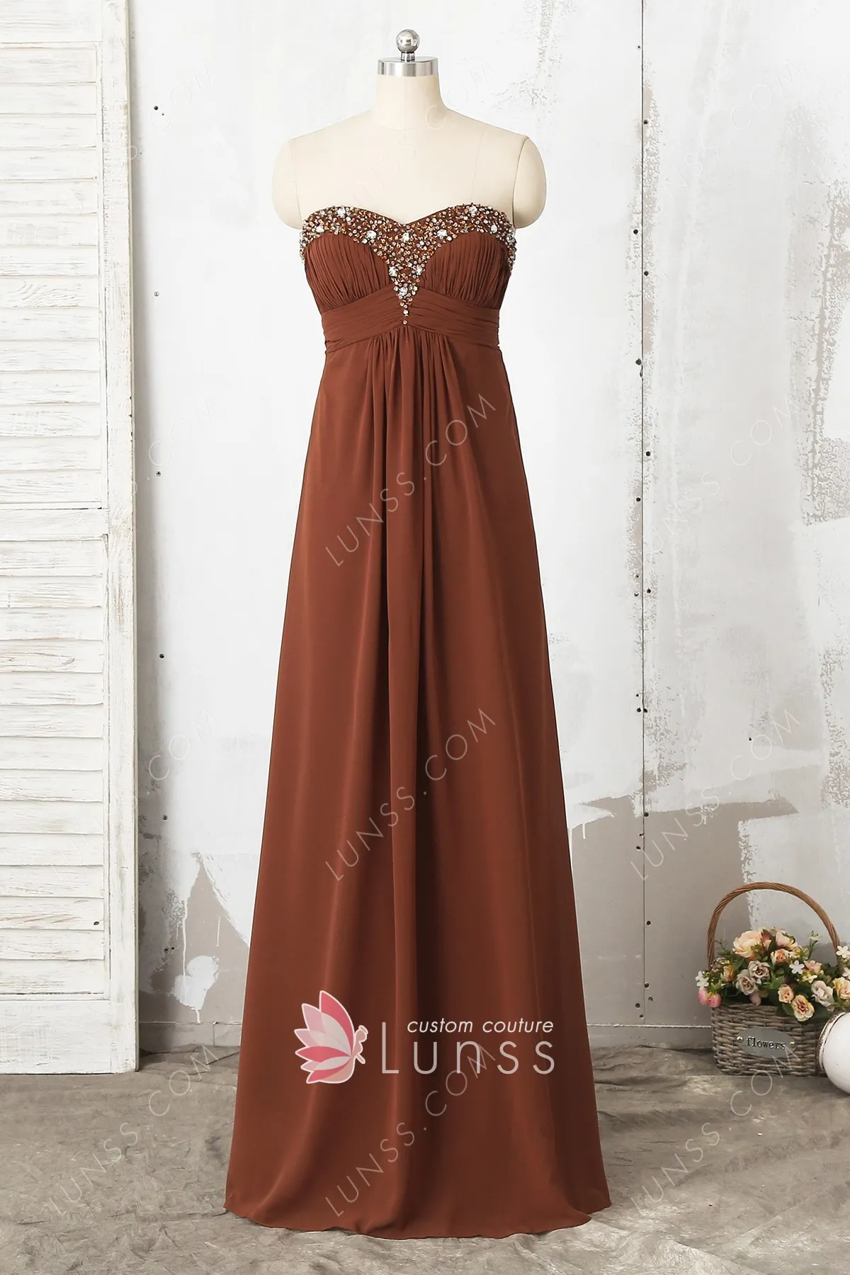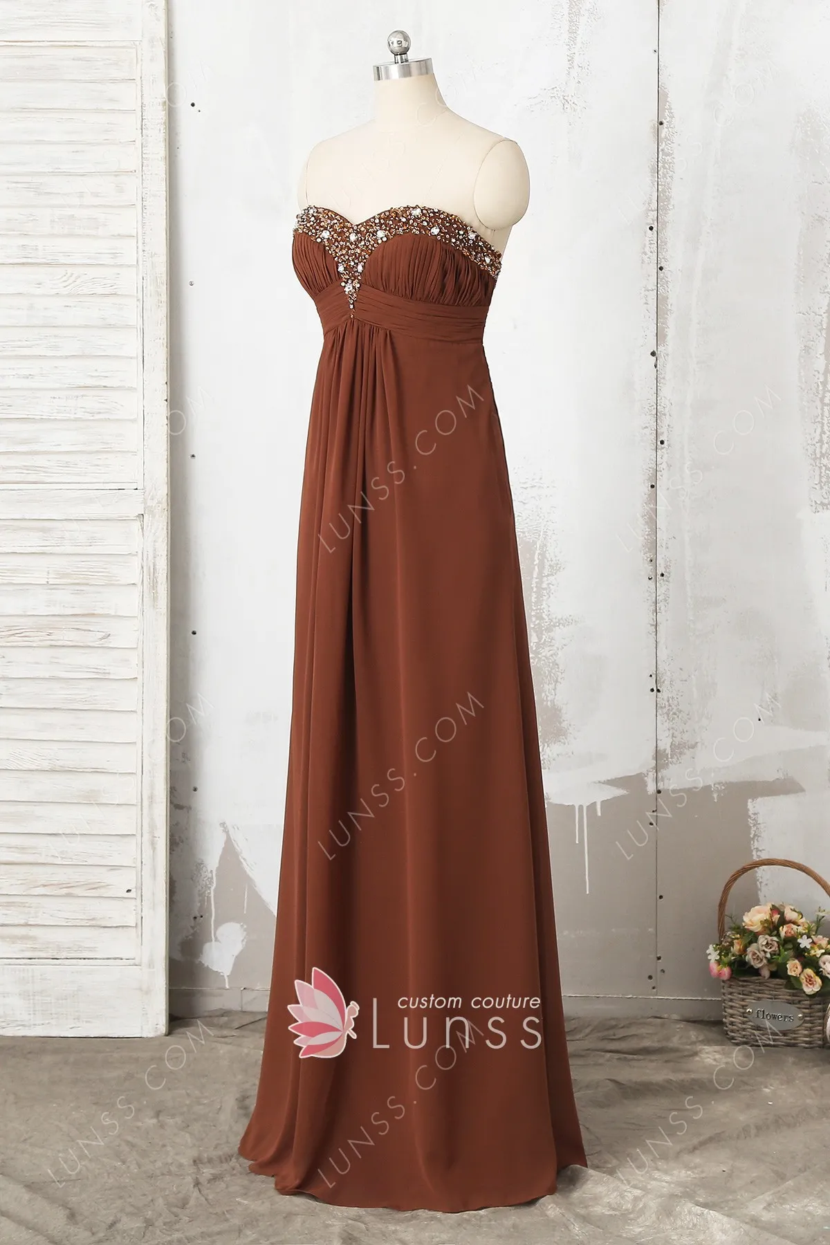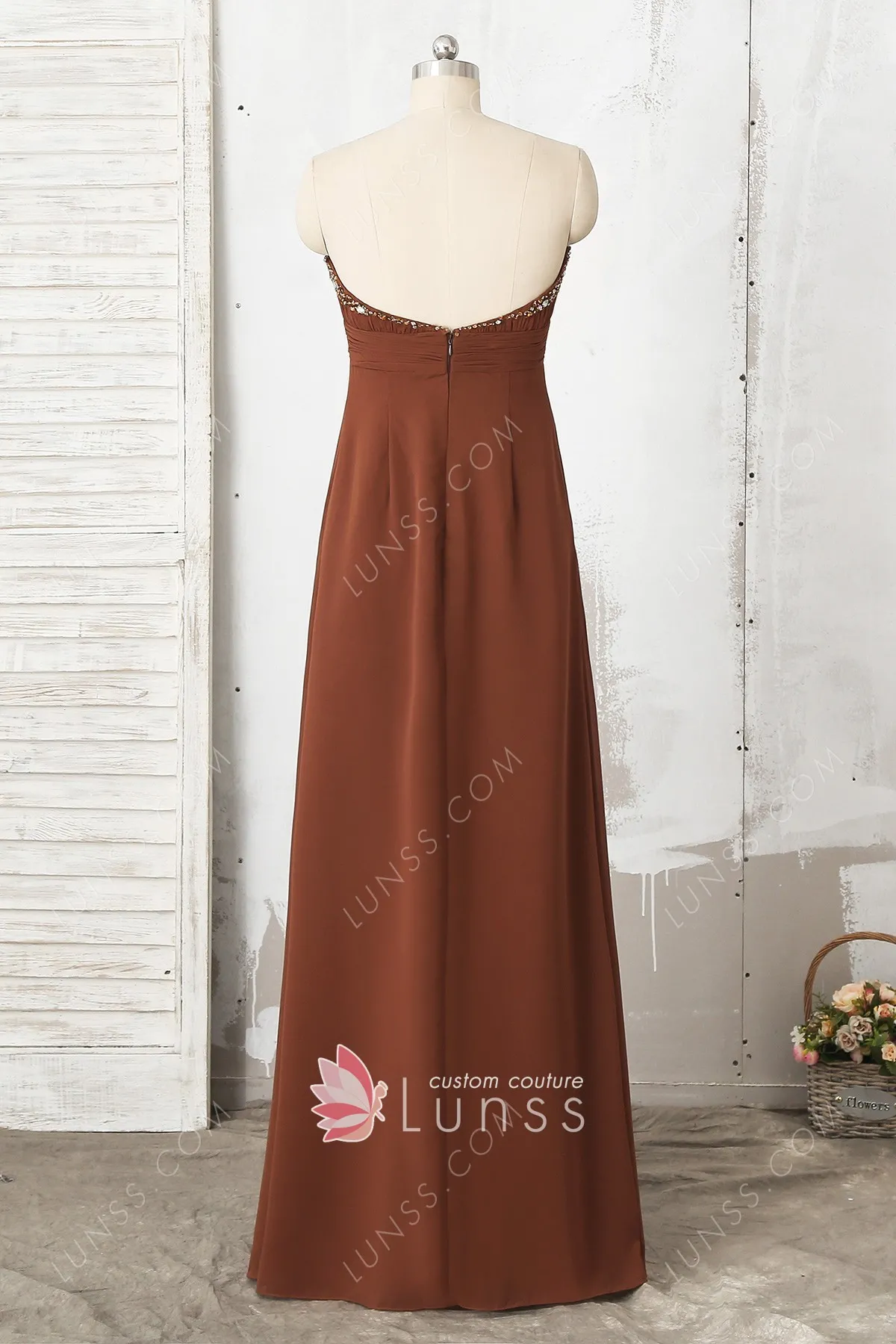 Beaded Empire Waist Brown Chiffon Long Bridesmaid Dress