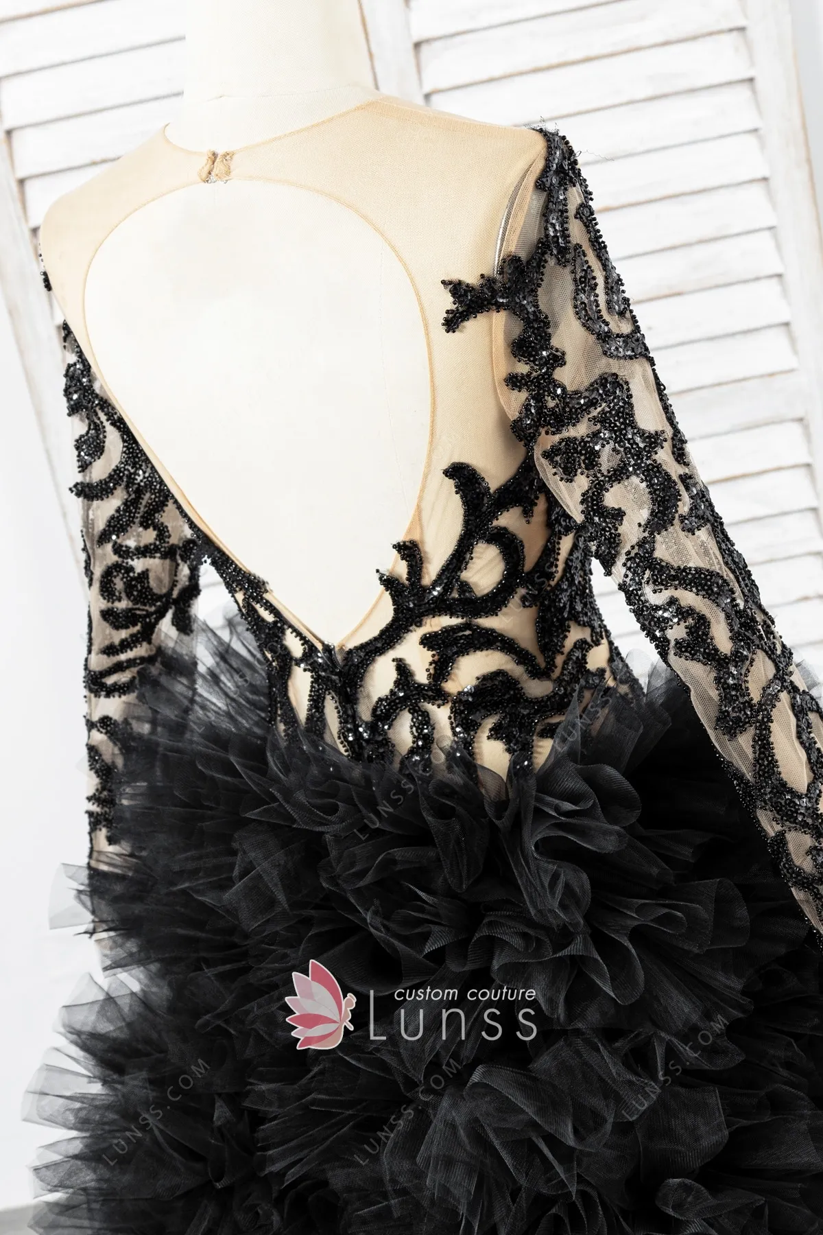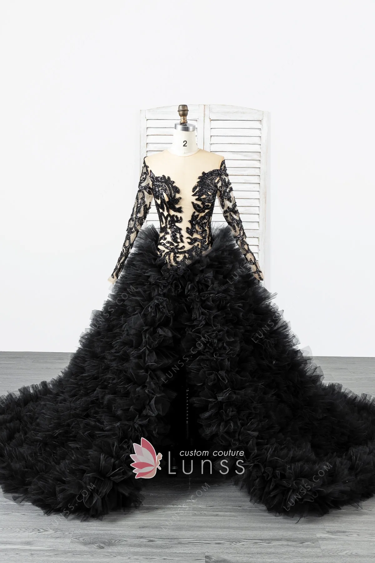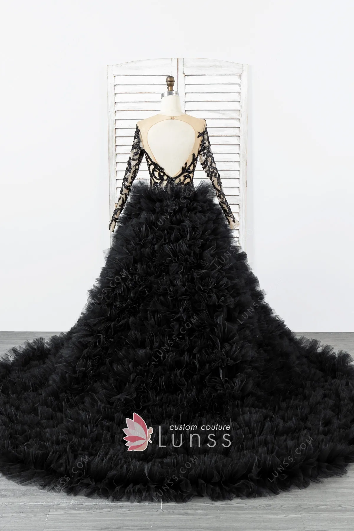 This dramatic and unique black prom ball gown has a sheer illusion bodice and long sleeves adorned with sparkly black beading lace appliqués. The most striking element is the extremely voluminous, multi-layered black ruffled tulle skirt, which creates a cloud-like and powerful silhouette. Open back and long train dramatically behind the wearer, ensuring a grand and powerful statement with every step.