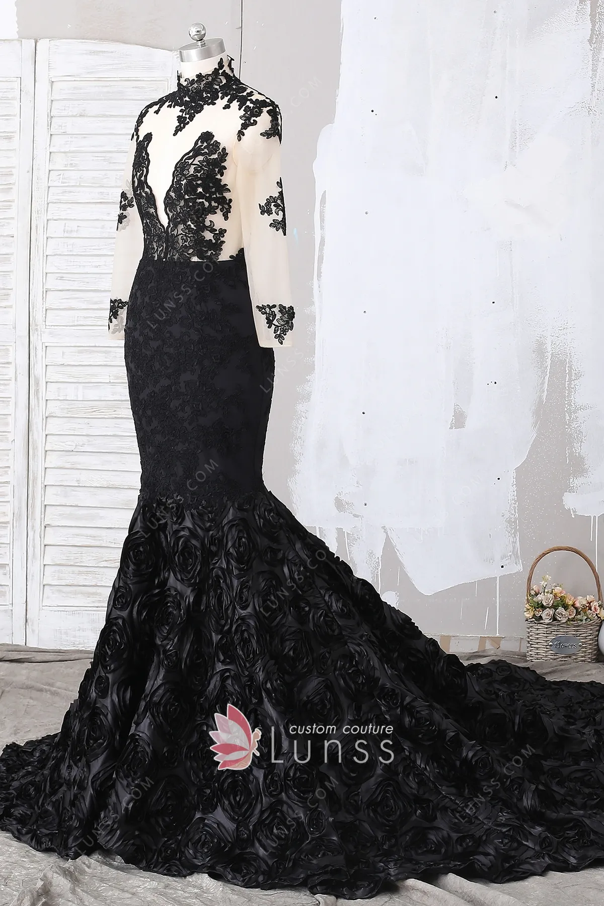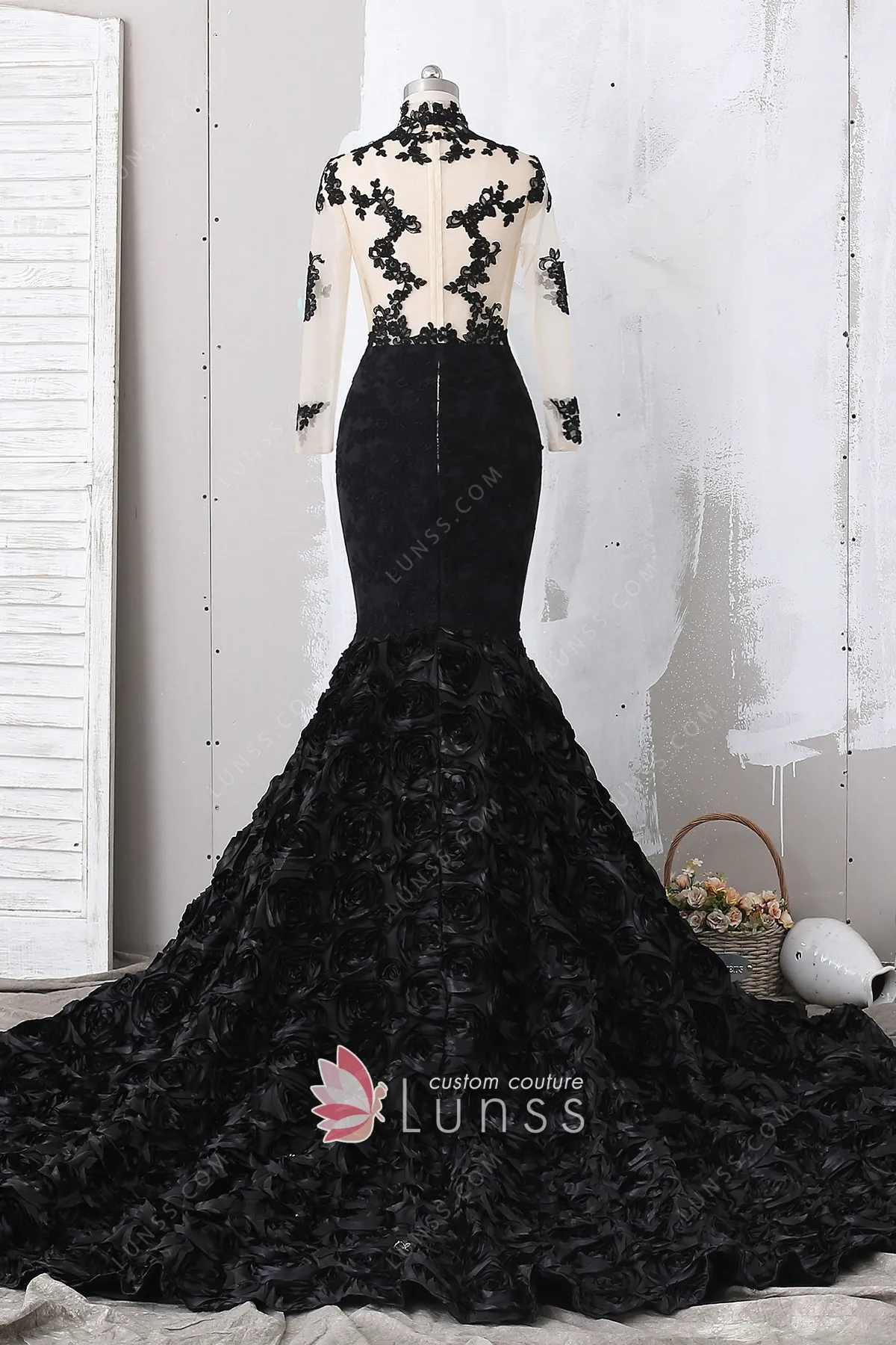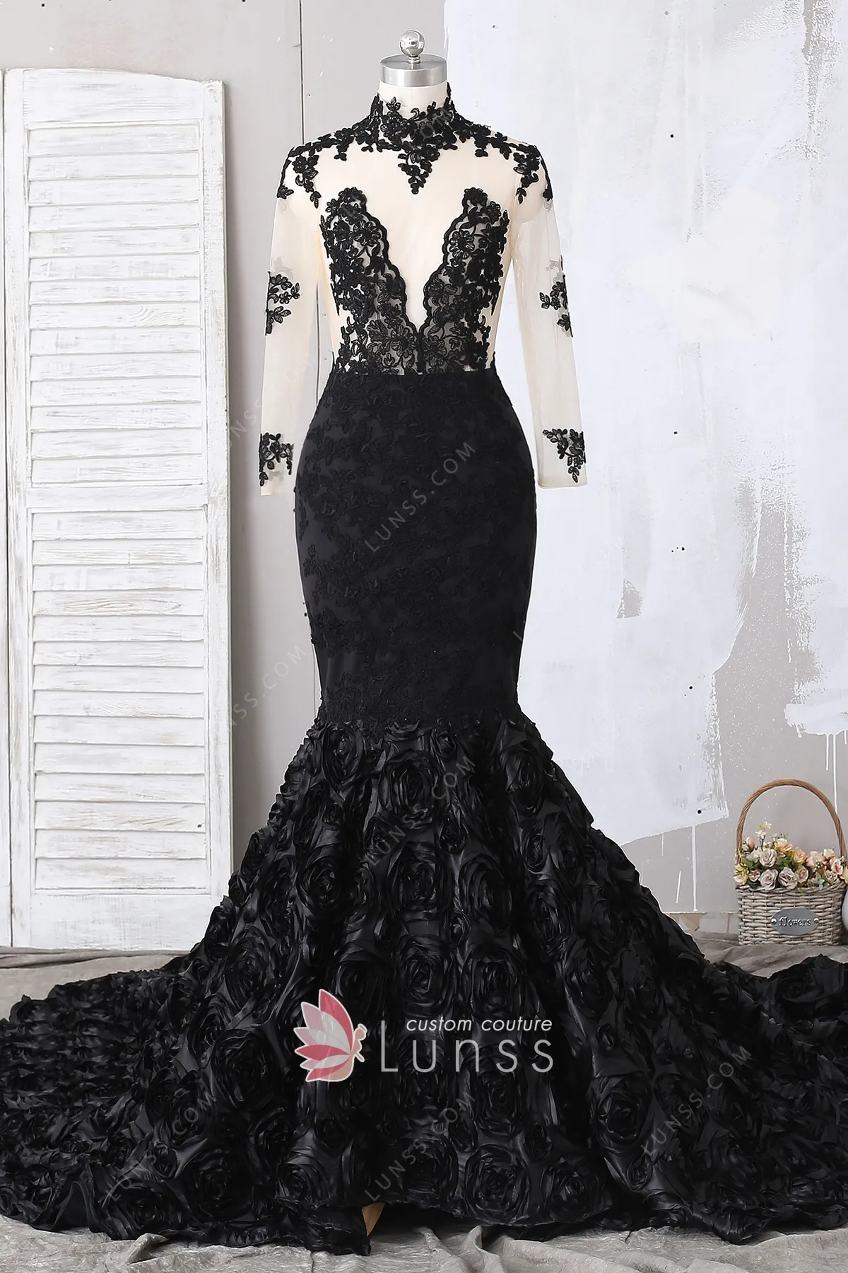 This African-American black mermaid prom dress features illusion sheer lace bodice with long sleeves and high neckline. 3D rosettes mermaid skirt with long train. It brings you a gorgeous queen look on your special day.