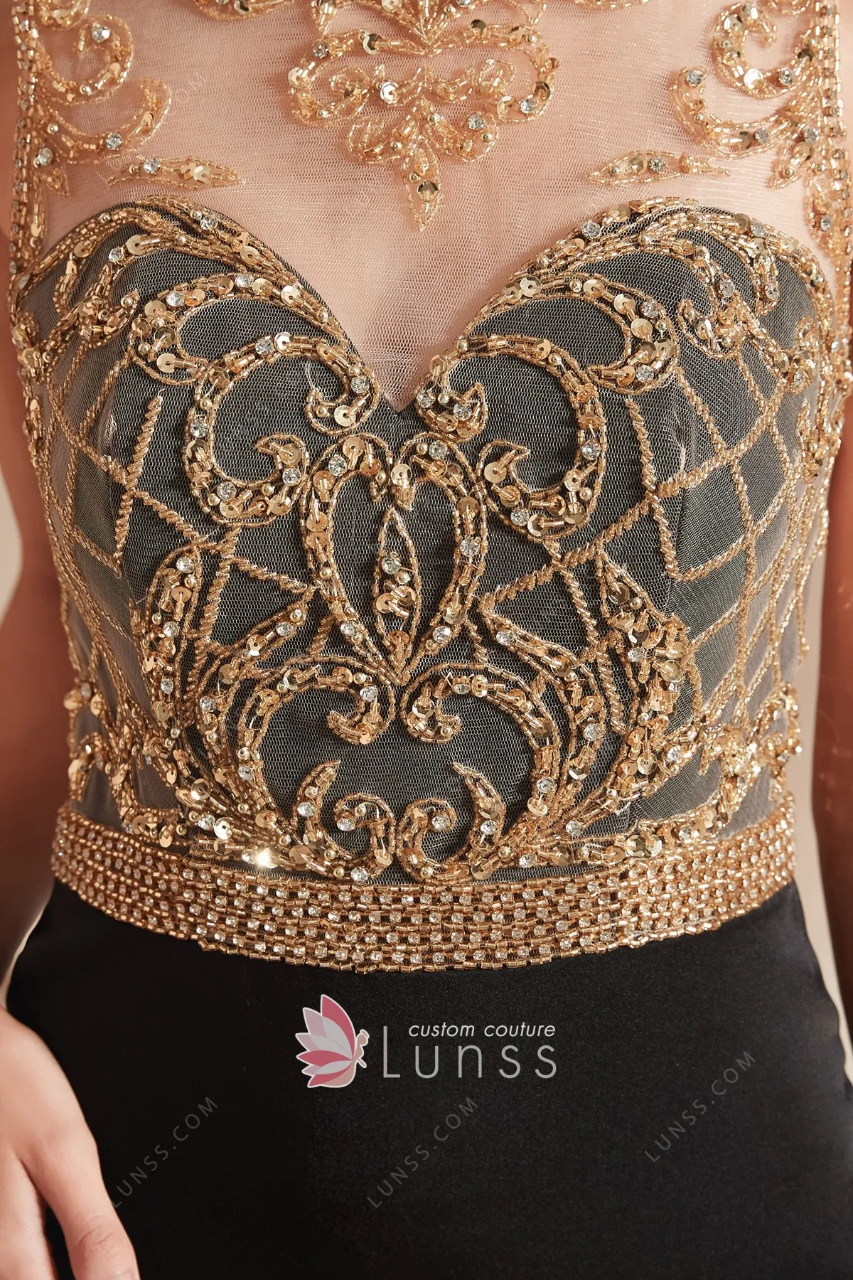 Sexy black satin with gold beading mermaid long prom or military ball formal dress. The sweetheart bodice underneath sparkle gold beading lace, trumpet silhouette with split, sexy illusion back, and short train complete the look.