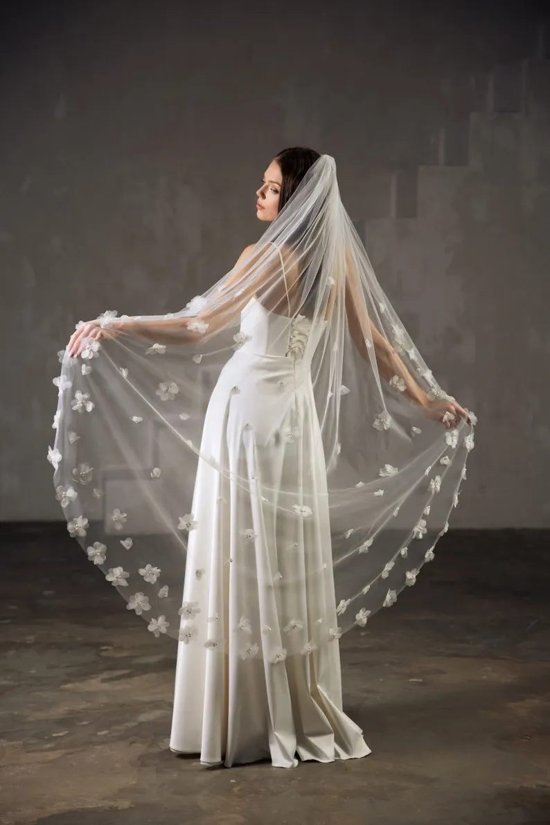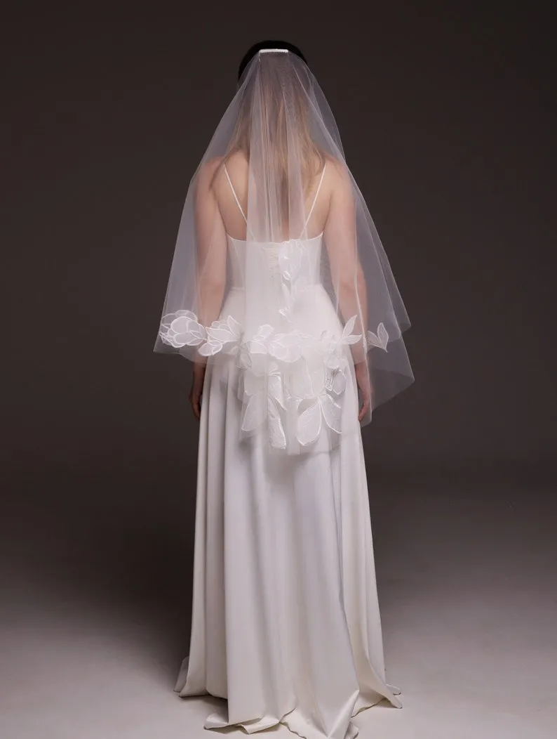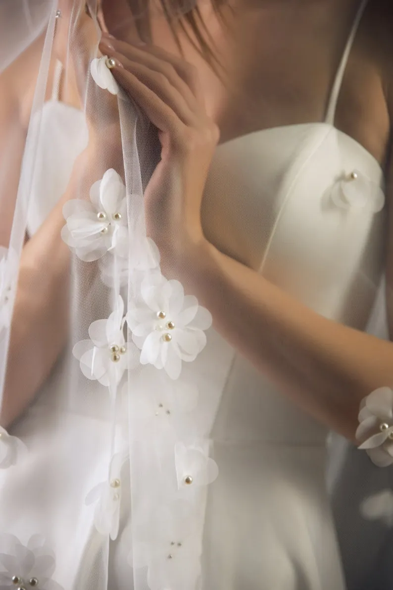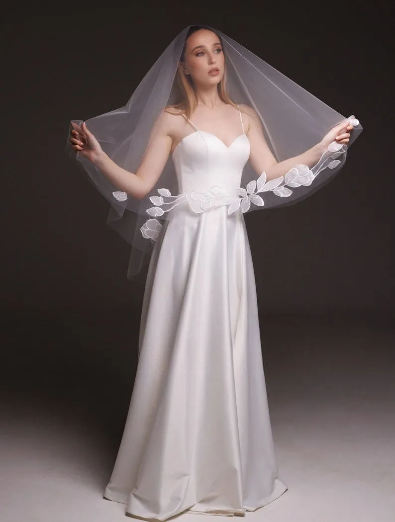2, Blusher Veil: A single layer of tulle that covers the face and is lifted during the ceremony. Often combined with other veil lengths, it adds a romantic and traditional touch.