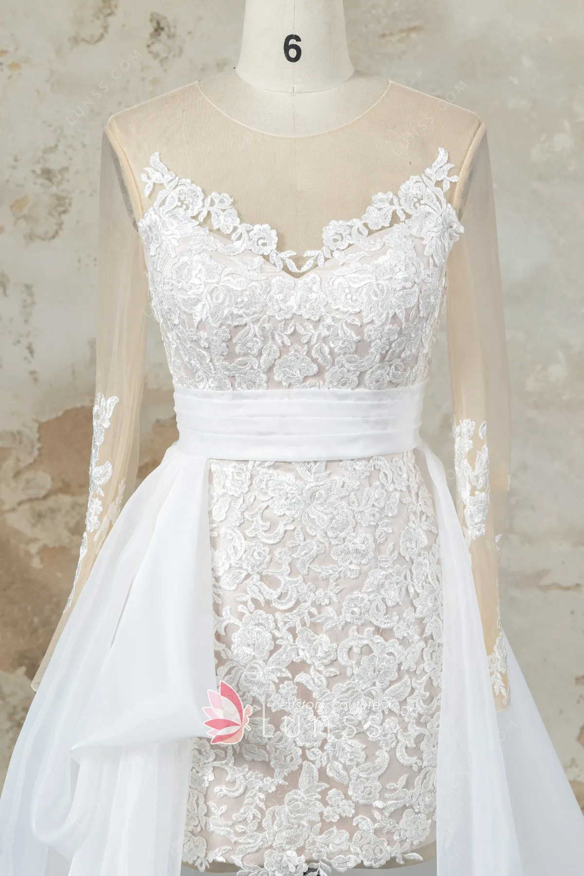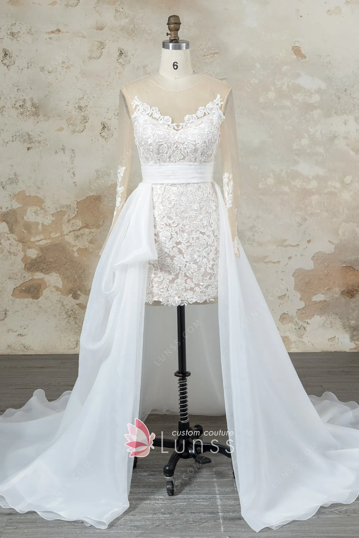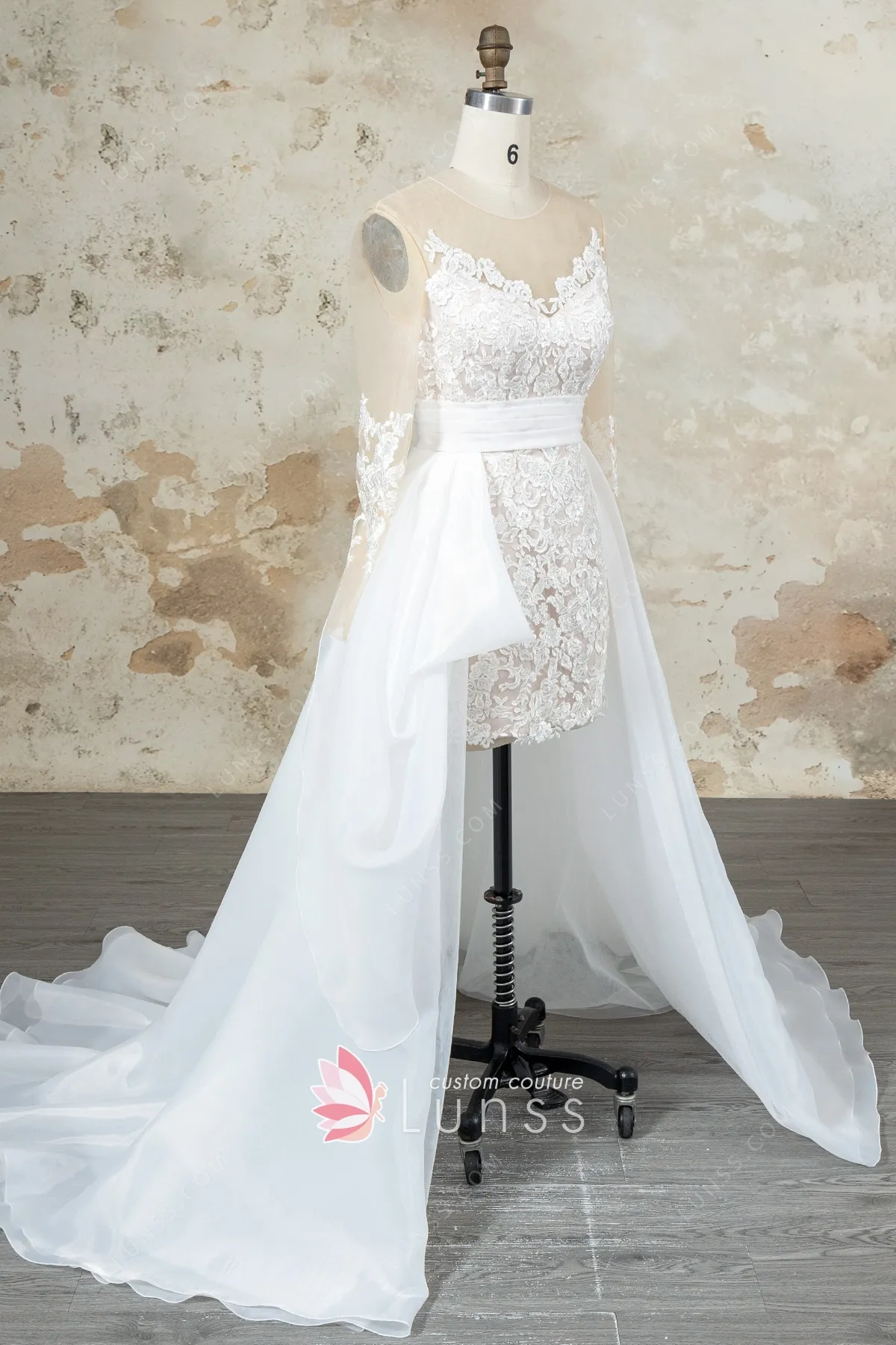 This captivating spring/summer wedding dress offers versatility and modern elegance. It features a sexy illusion neckline and long sleeves, both adorned with intricate lace appliques that cascade onto the fitted short dress. A dramatic detachable organza overskirt adds a touch of traditional romance and volume, extending into a graceful train. By removing the skirt, the bride can easily transition to a fun and flirty look for the reception or even for a bridal shower.