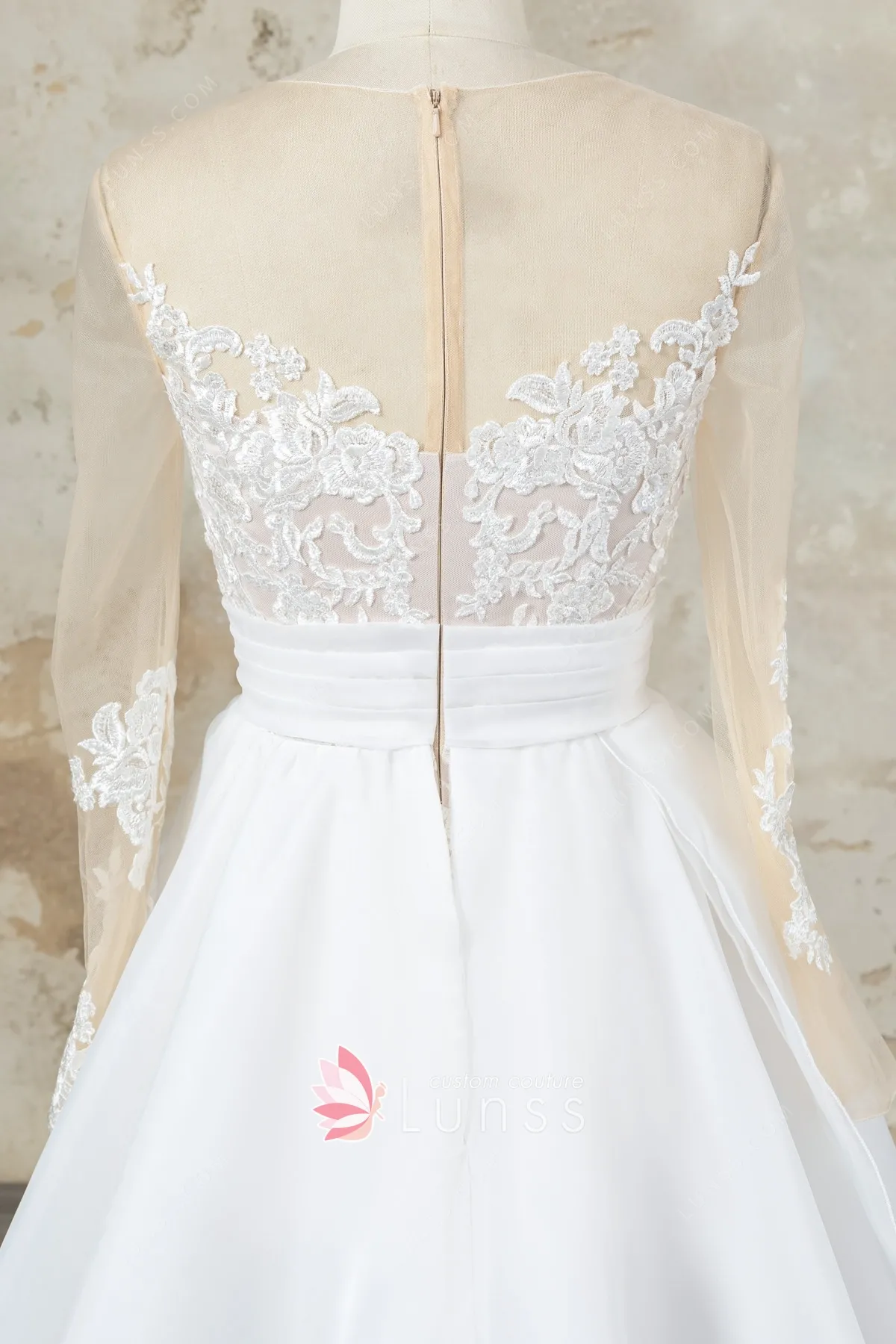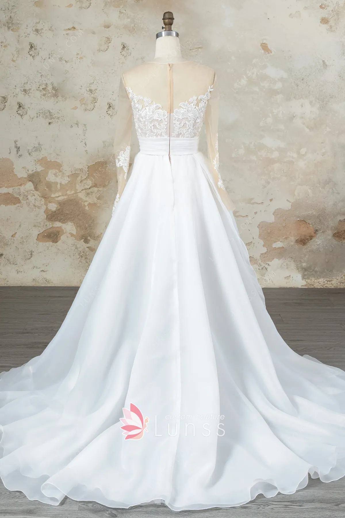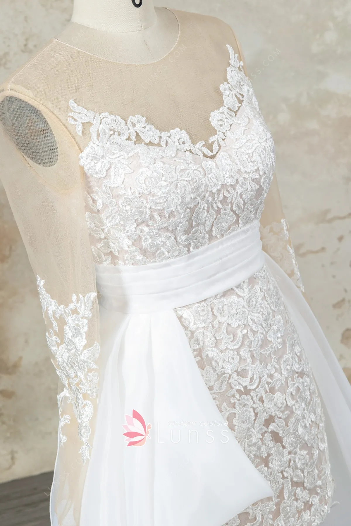 This captivating spring/summer wedding dress offers versatility and modern elegance. It features a sexy illusion neckline and long sleeves, both adorned with intricate lace appliques that cascade onto the fitted short dress. A dramatic detachable organza overskirt adds a touch of traditional romance and volume, extending into a graceful train. By removing the skirt, the bride can easily transition to a fun and flirty look for the reception or even for a bridal shower.