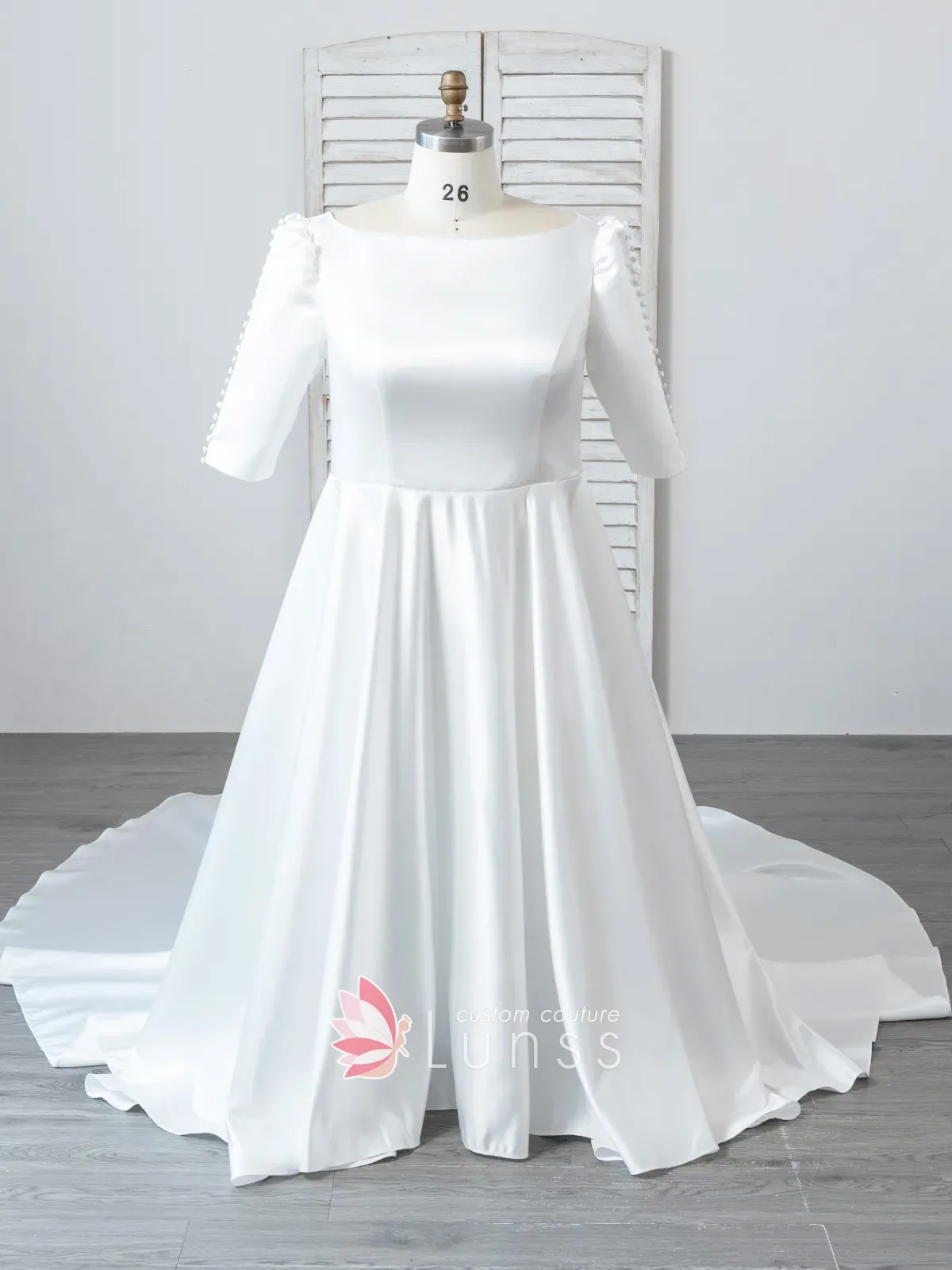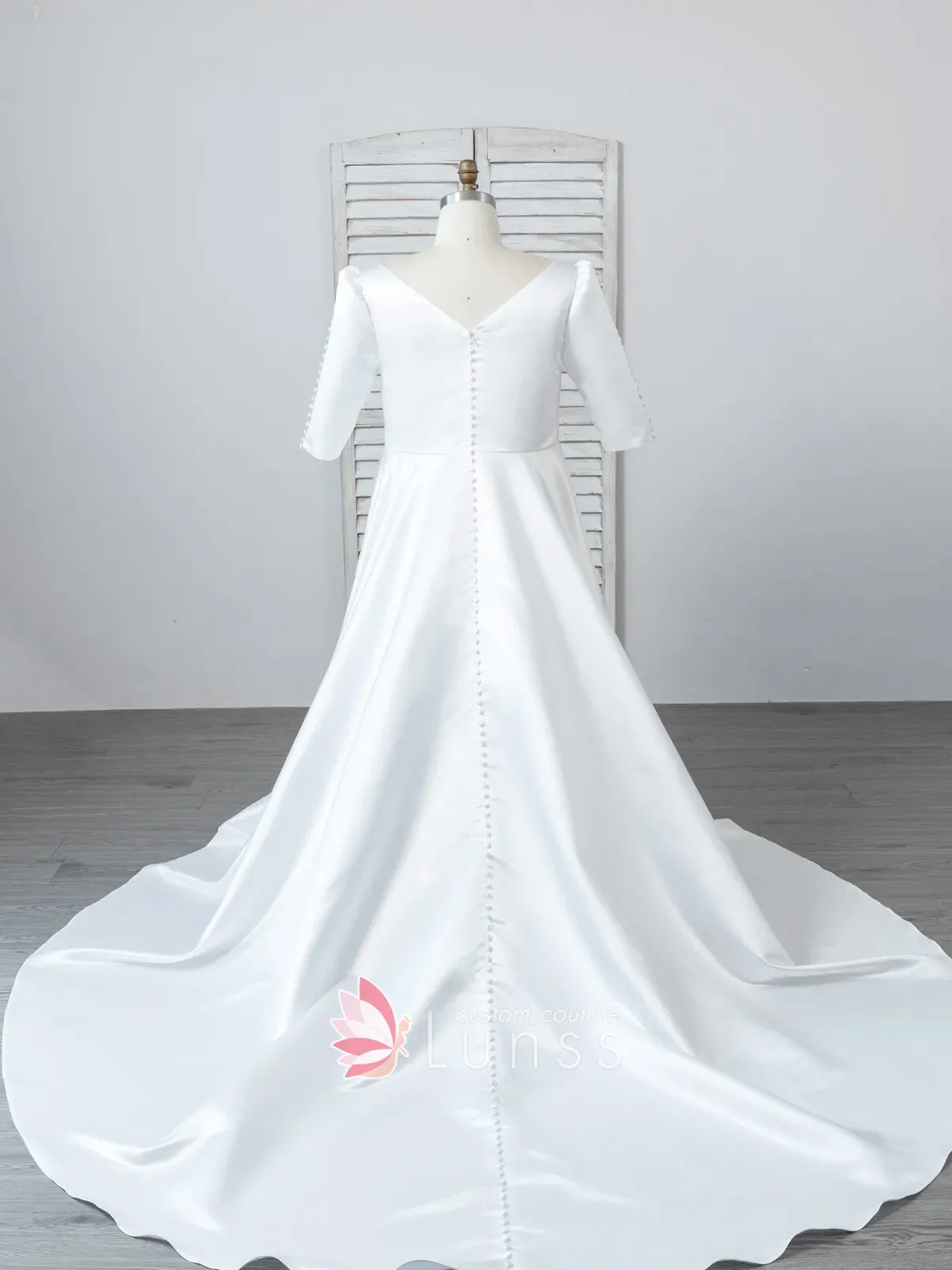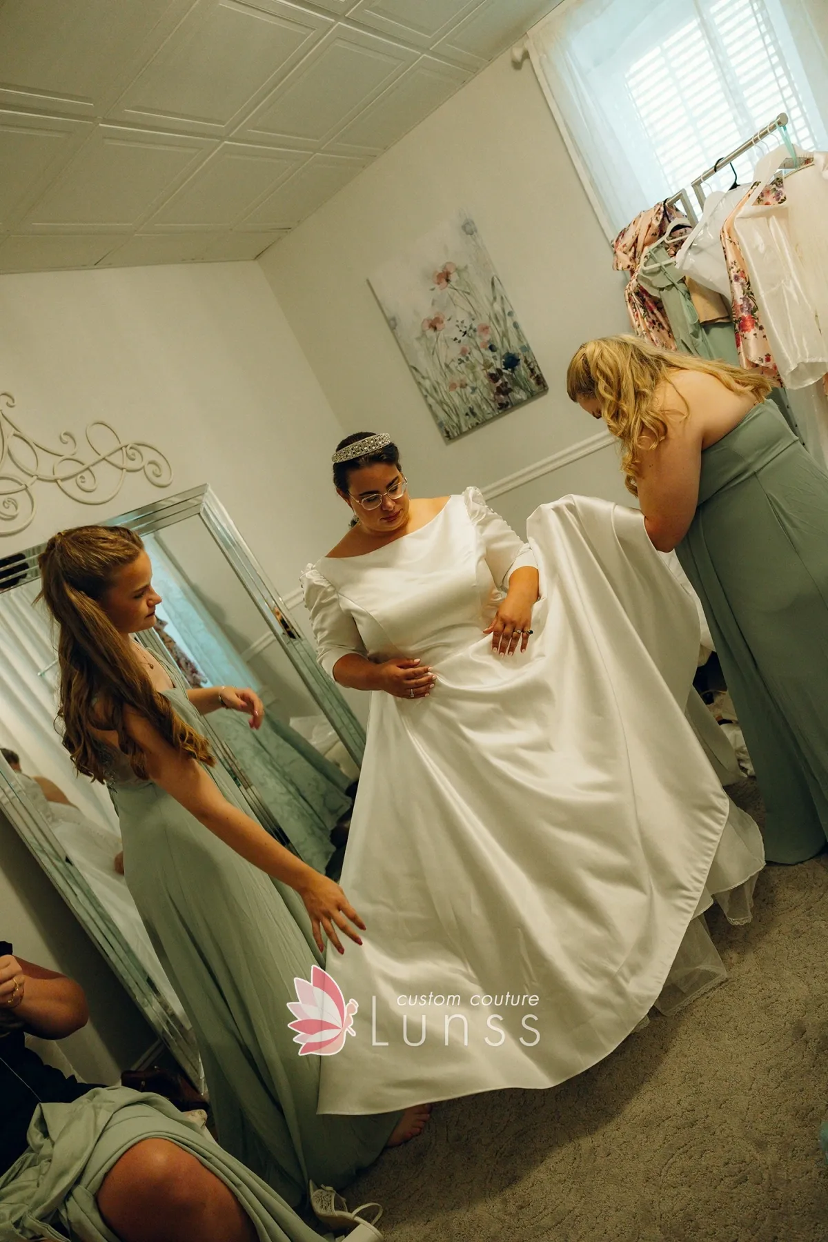 Custom White Satin Wedding Gown with Quarter Sleeves