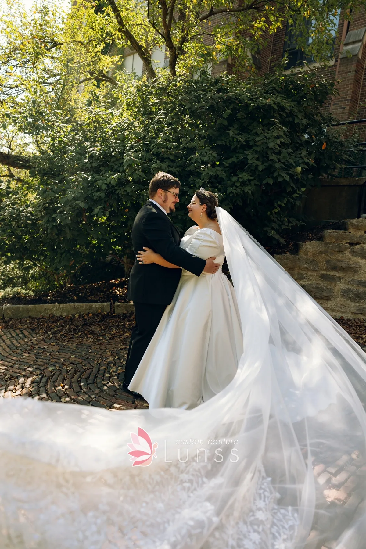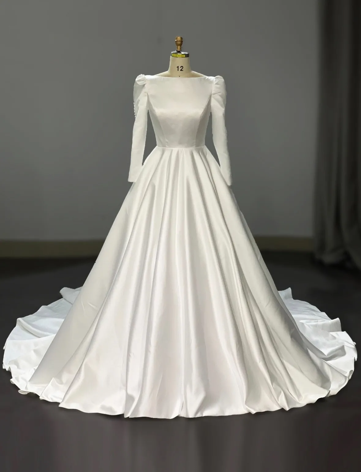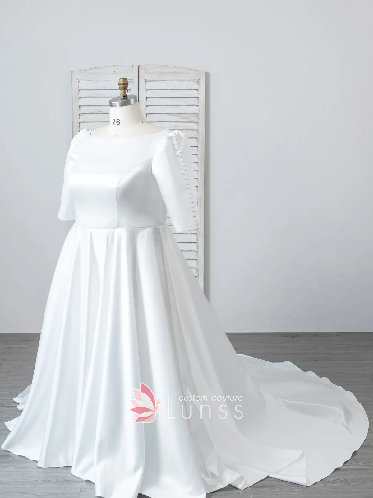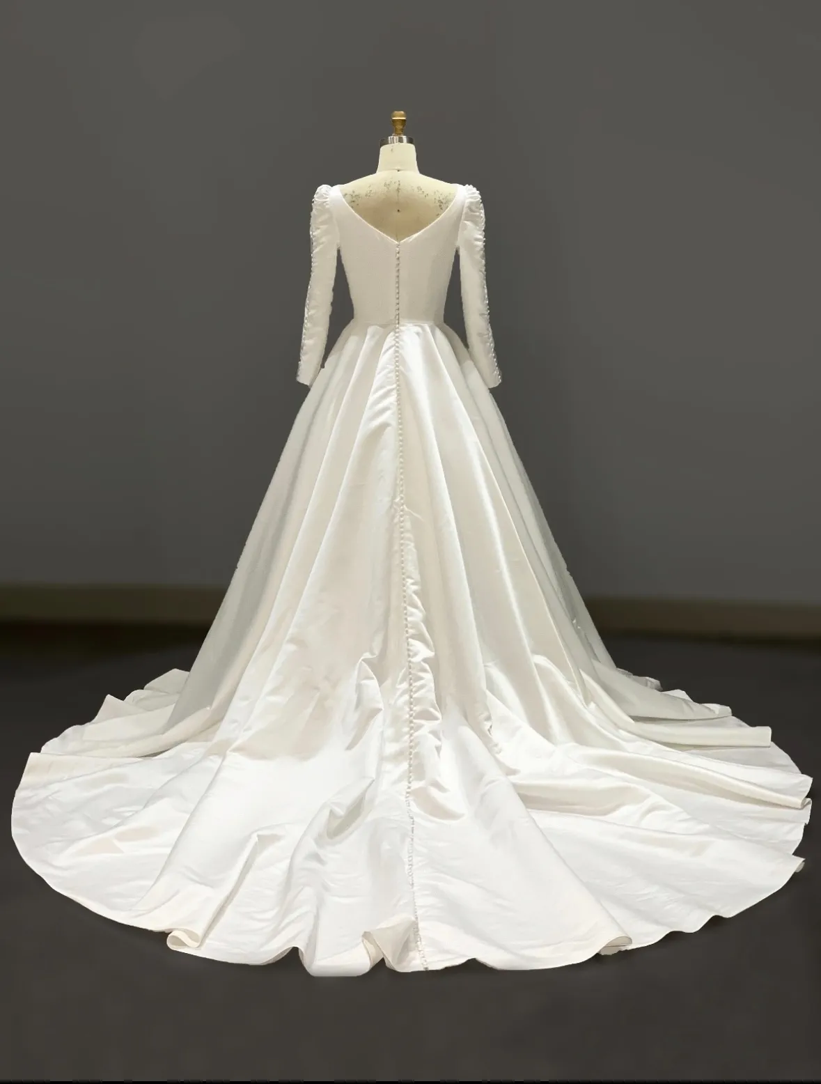 Custom White Satin Wedding Gown with Quarter Sleeves