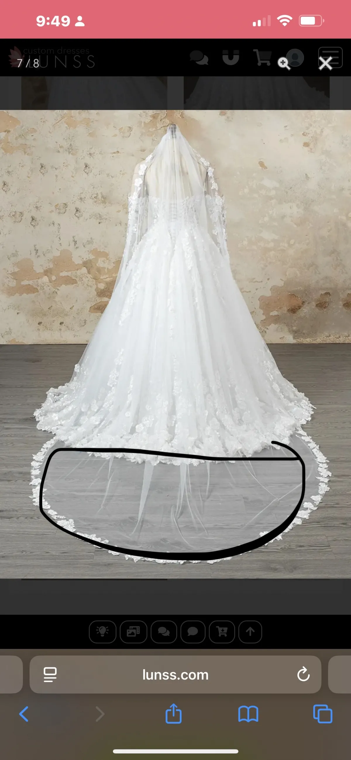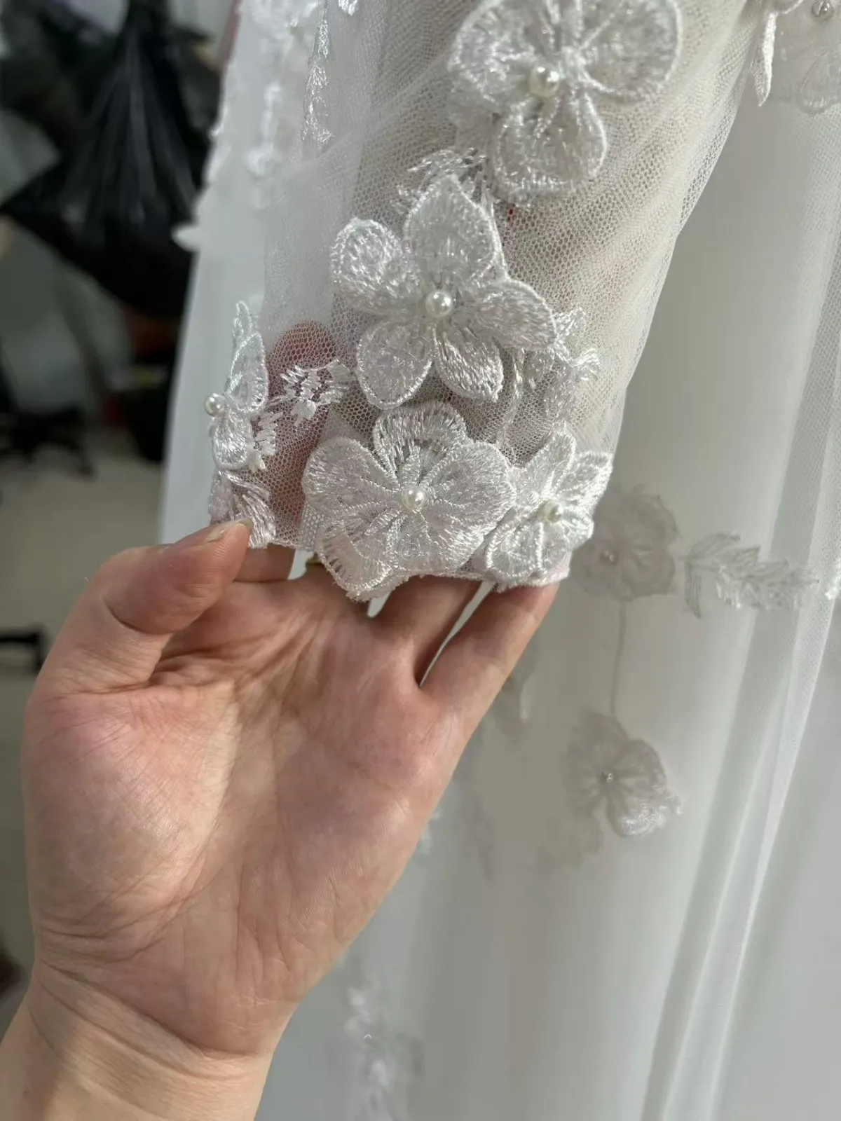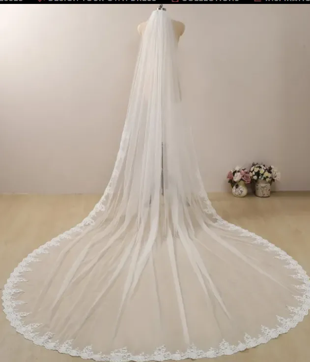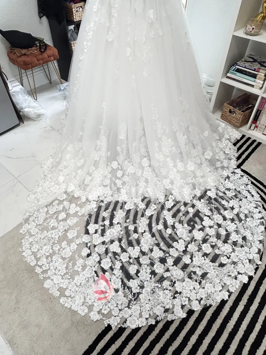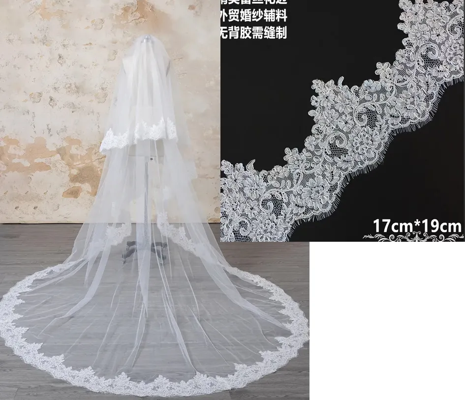 We can also help you shorten the veil. What do you think? How much extra lace would you need? One yard of lace is $48 USD. The cost of this wedding dress is very high, and we're making almost no profit on it.