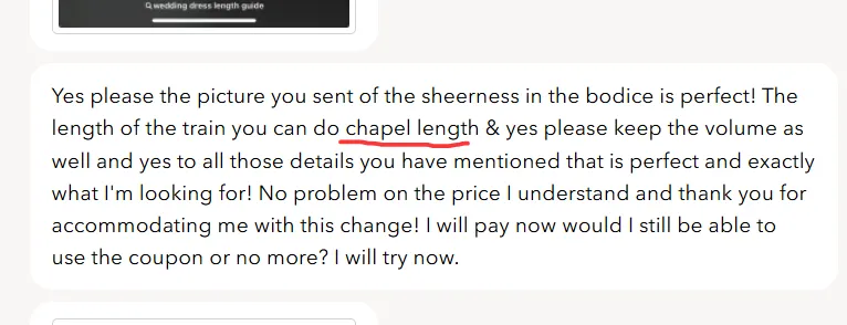 Yes please the picture you sent of the sheerness in the bodice is perfect! The length of the train you can do chapel length & yes please keep the volume as well and yes to all those details you have mentioned that is perfect and exactly what I'm looking for! No problem on the price I understand and thank you for accommodating me with this change! I will pay now would I still be able to use the coupon or no more? I will try now.