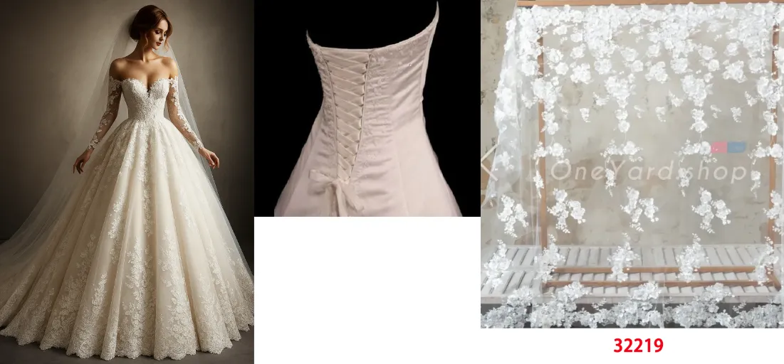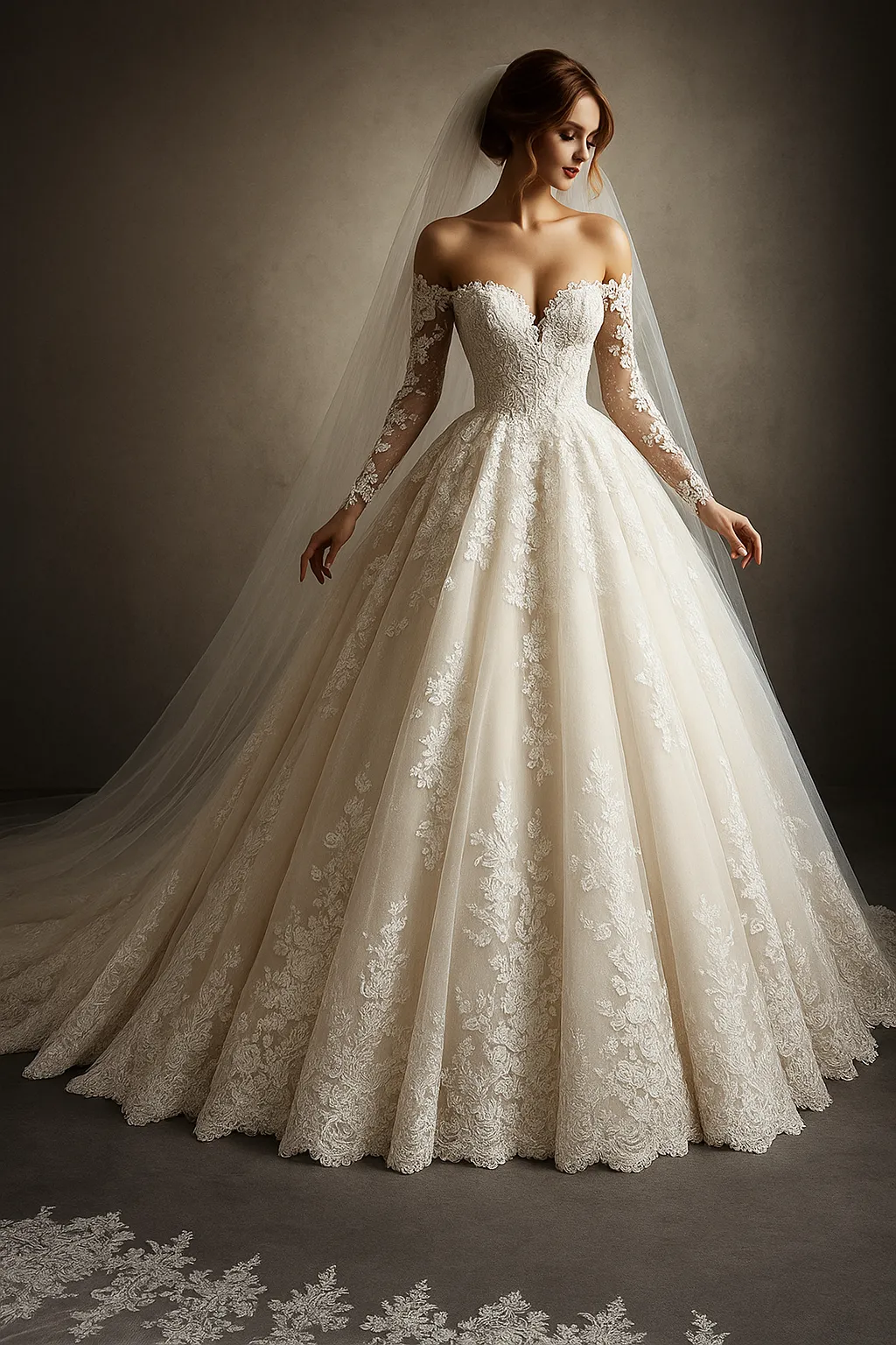 We can certainly create a ball gown wedding dress for you using the 32219 lace. With detachable long sleeves and a veil.