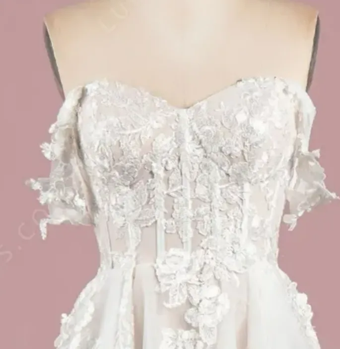 Hi I am looking for a custom wedding dress the color ivory, with tulle fabric, lace & 3D appliqués, sweetheart neckline, I like the mermaid style dress but don’t want to much layering & volume in the bottom of the skirt. Corset back is ok. I don’t know if you can do sleeves not attached to the dress and with pointed shoulders like in image #1? If not image #3 sleeves are ok. I want the sleeves high up on my arm. Cathedral style veil if you do veils and not completely made of lace style but maybe on the trim of the veil?