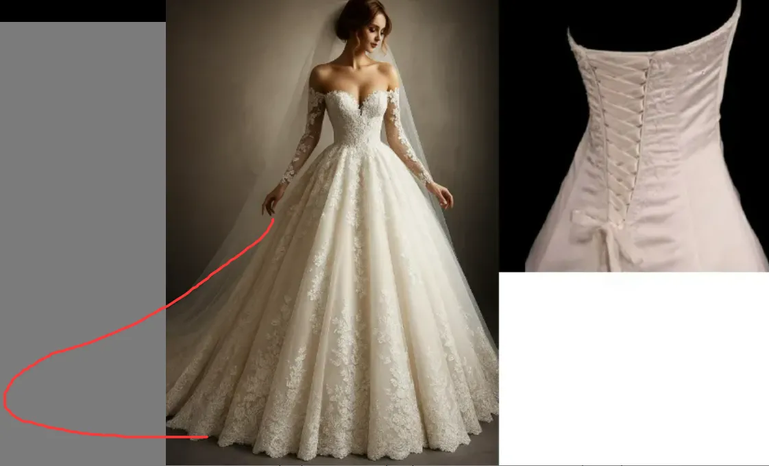 We can create your wedding dress with the same voluminous fullness as the skirt you showed us. For the lace, we'll incorporate it as you envisioned in your inspiration photo: it will gradually transition from the waist down to the lower skirt, and similarly, the lace detailing on the hem will gradually extend upwards.