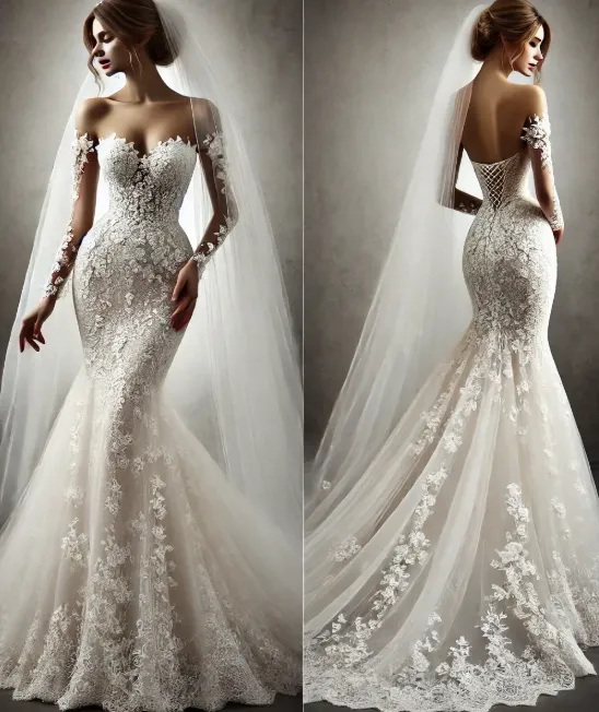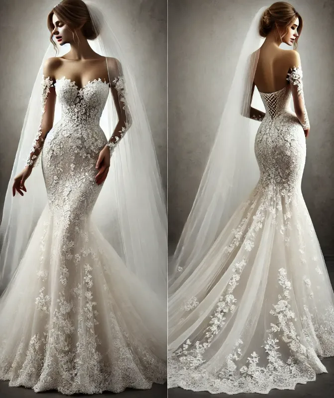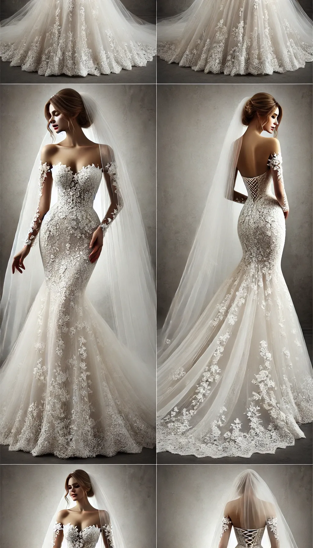 You're looking for a mermaid lace wedding dress with no connected long sleeves. No problem, we can certainly do that. A lace-up back is also possible. And yes, we can also create a matching lace trim veil for you.