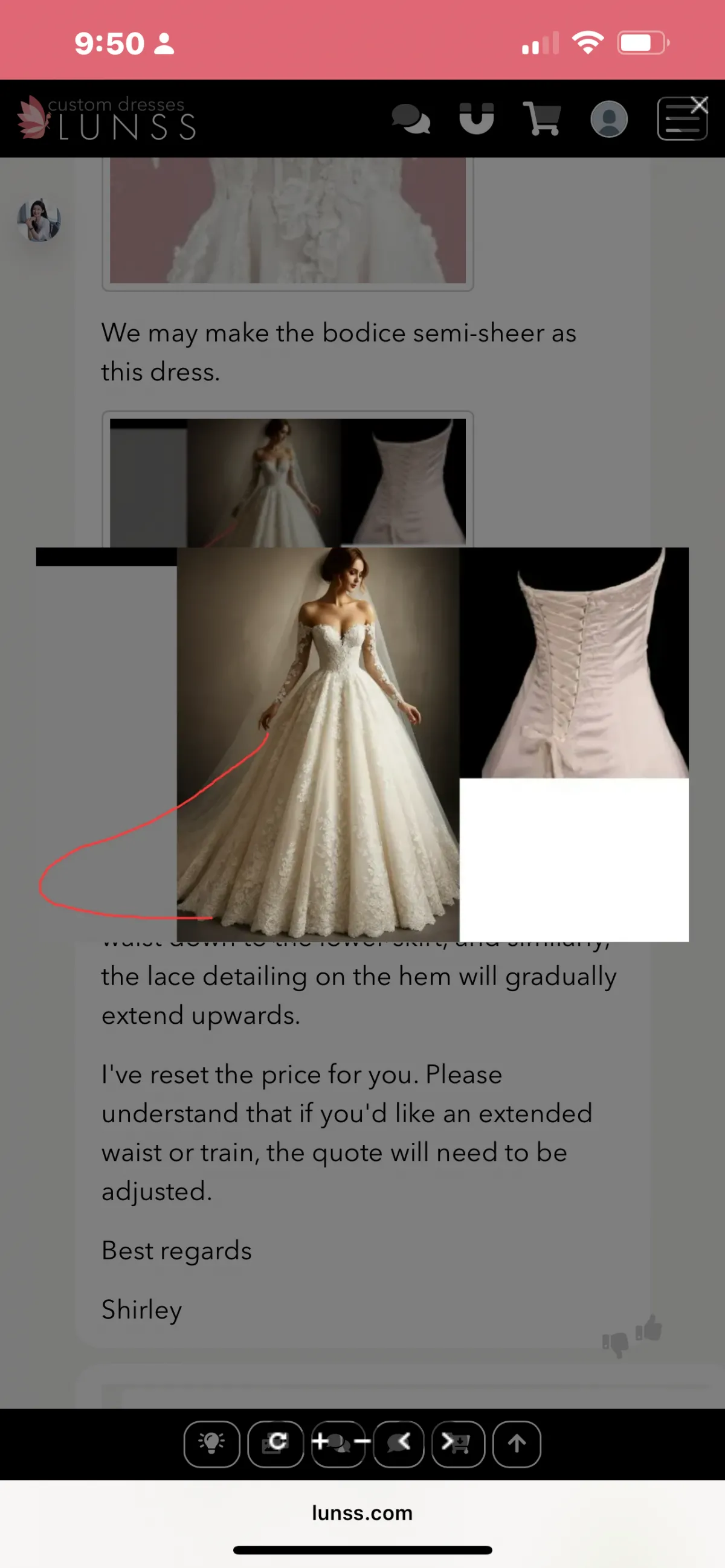 Thank you for choosing LUNSS for your high-end customization. This is Shirley at your service. It's my pleasure to assist you in customizing your dream wedding dress.
