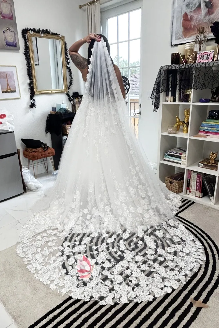 Hi yes I was looking for lace like in the images I sent with the 3D floral appliqués. Do you have that? The veil cathedral style no blusher.