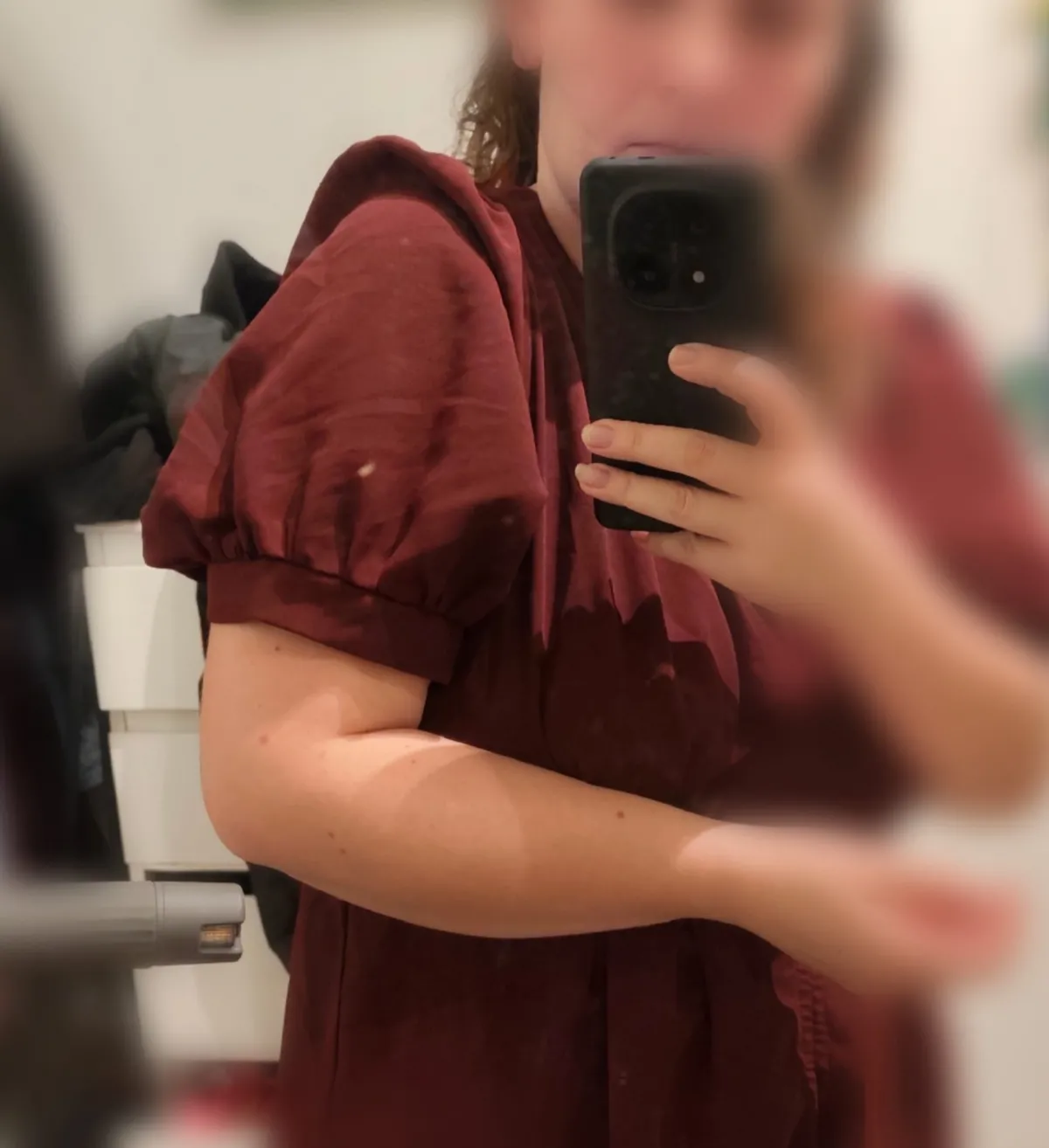 I tried on this dress and loved the V-shaped (basque) waistline and the way the skirt flows out. However, I didn’t like the criss-cross neckline, and I would prefer the boning not to be visible. This dress had pockets, which I really liked, but I would only want them included if they can be made without creating any bulging.