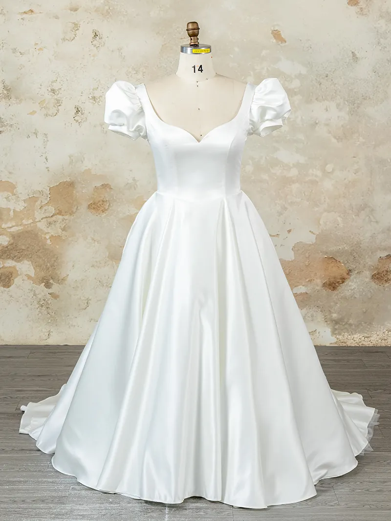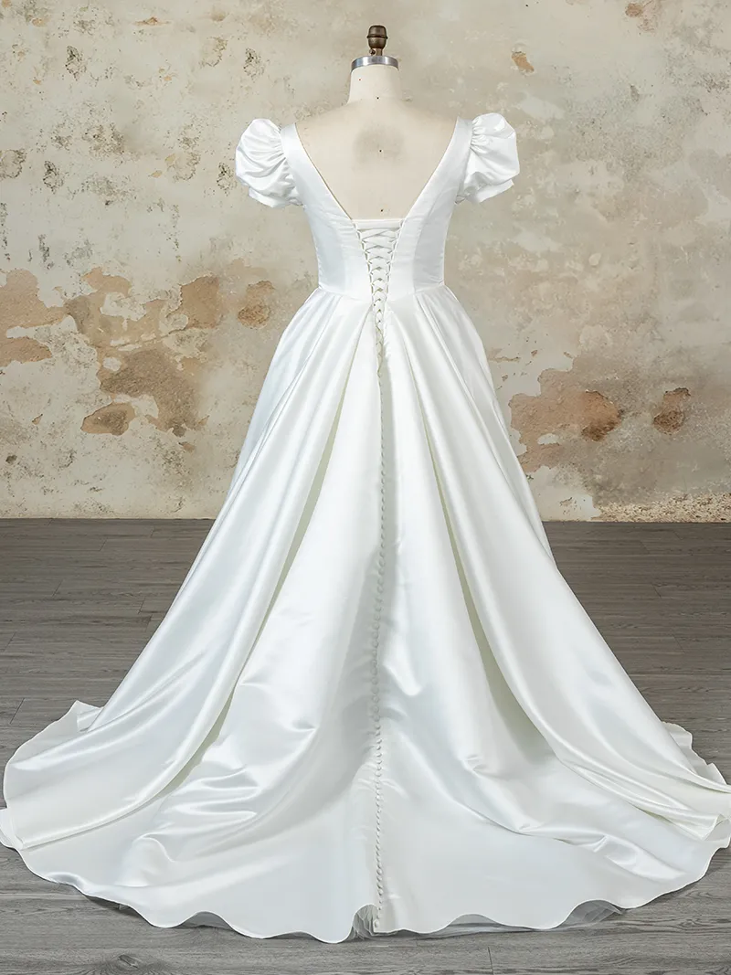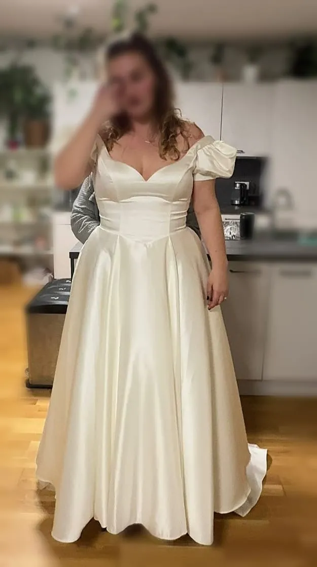 I would like my wedding dress to be made of satin in an off-white to champagne shade. The dress should feature a V-shaped waistline and a structured corset bodice, but the boning should not be visible from the outside – it should be covered with an additional layer of fabric.