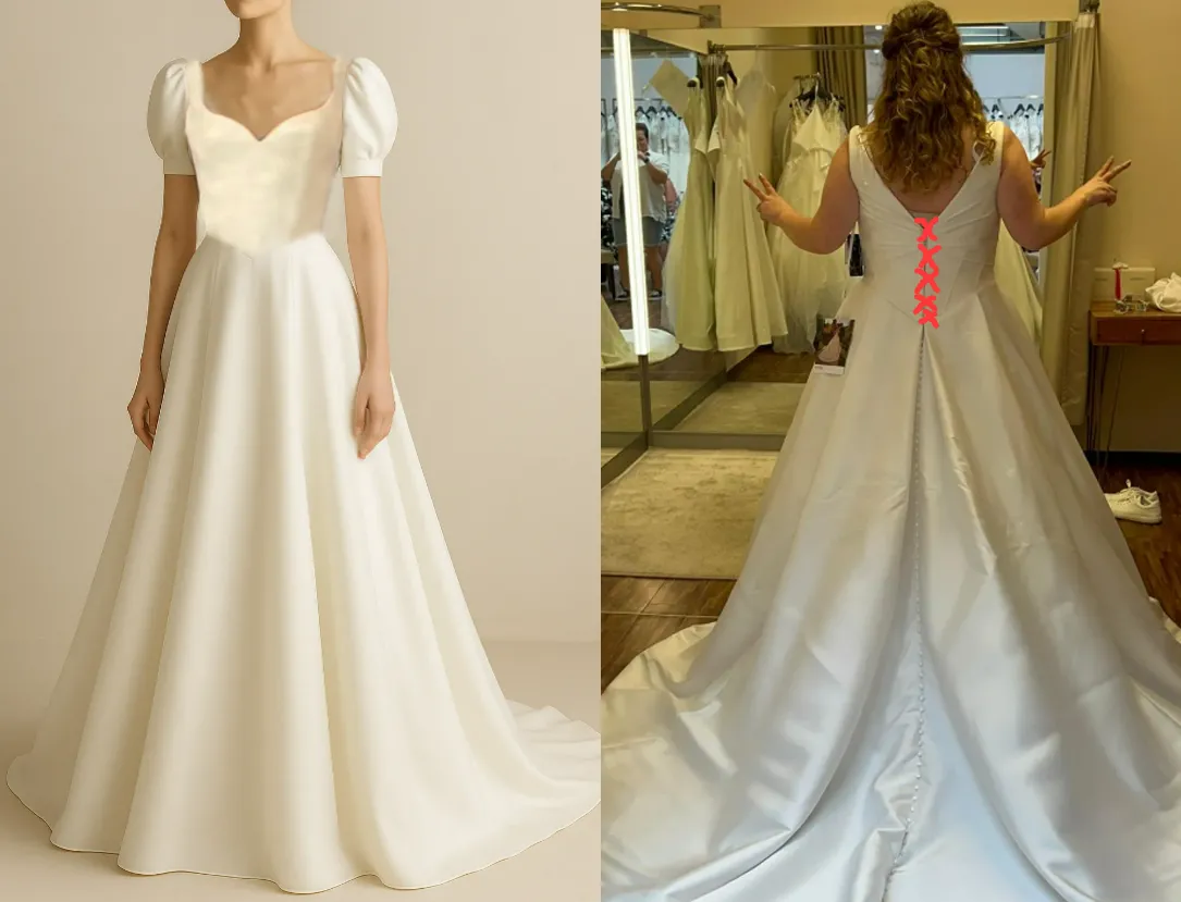 This is the same dress, and I loved the back and overall silhouette, especially the row of buttons all the way down. For a more defined waist, I think I would prefer a lace-up closure instead. The train on this dress was much too long for me—I would prefer a bit shorter, more manageable train.