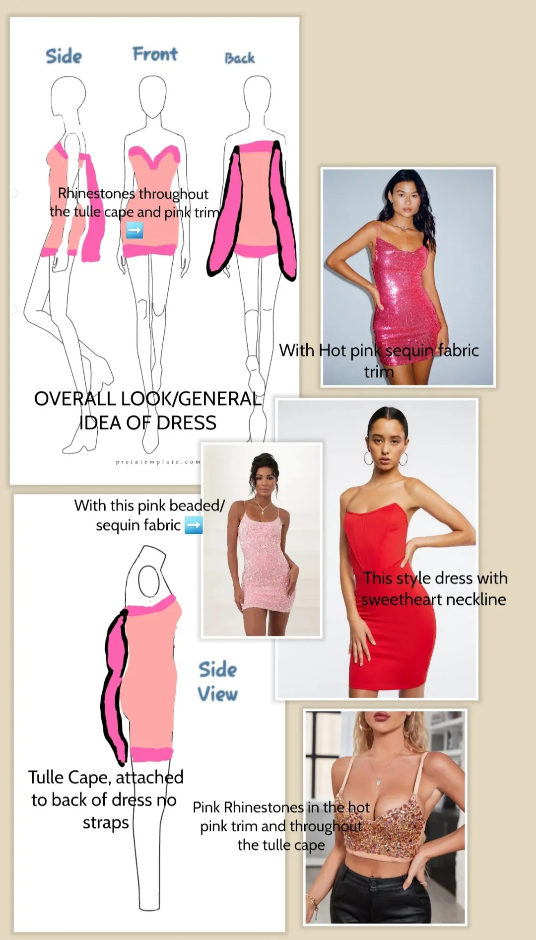 I'm not the best artist but I tried to sketch the general idea I had for the dress. The pictures are more to show different elements I had in mind for the dress. Please let me know if something similar to this would be possible