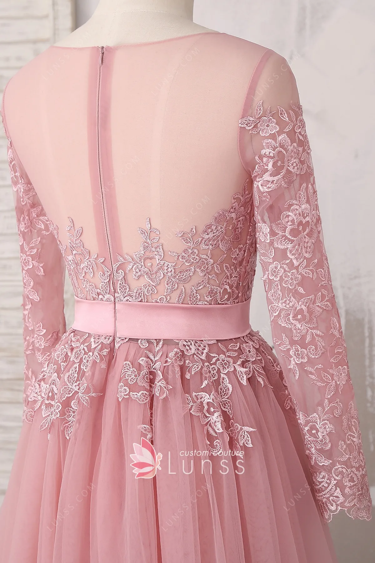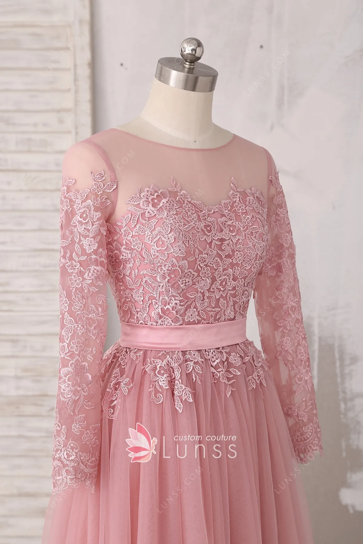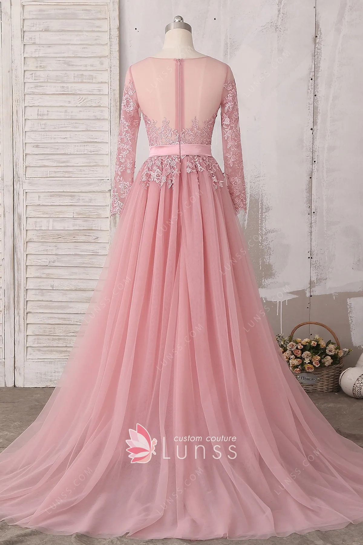 Classic design and timeless elegance are taken to a whole new level with this full-length evening formal gown with a short train. The lace makes an illusion effect on the bodice and sleeves. This dusty pink tulle dress is perfect for your parties.