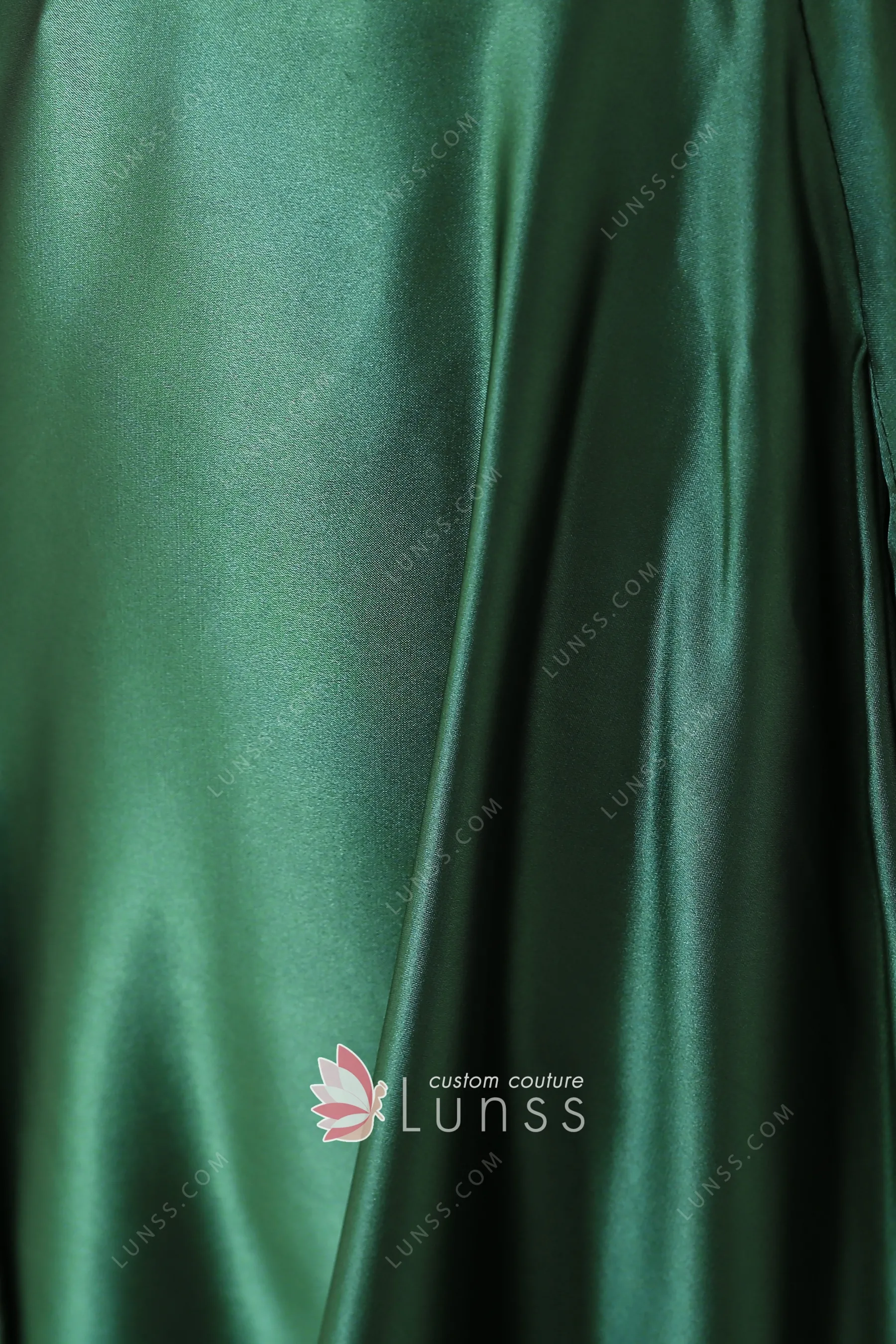 This simple emerald green satin A-line floor-length evening prom, military ball, or graduation dress features fitted bodice with spaghetti straps, curved neckline, and strappy low back. The sexy high-slit A-line skirt with pockets completes the look.