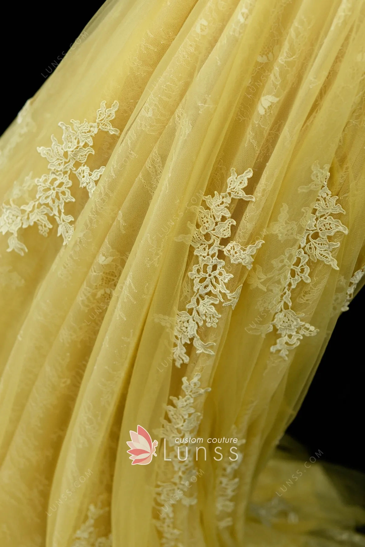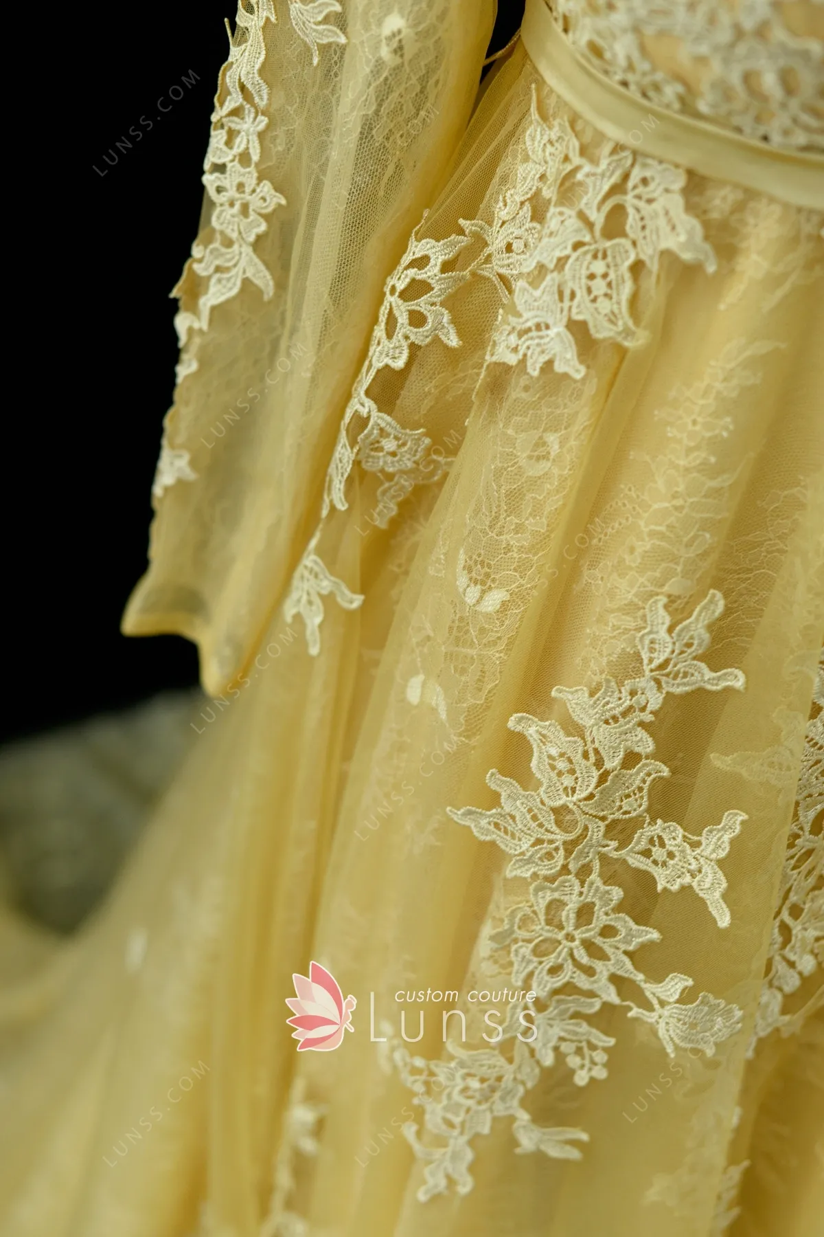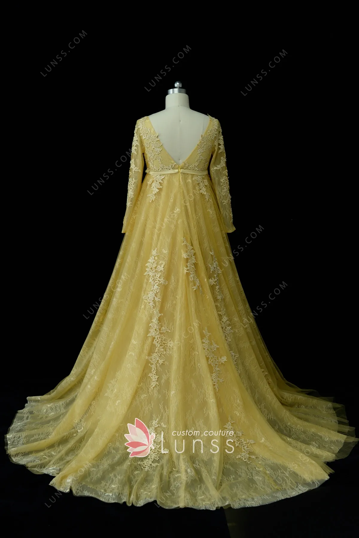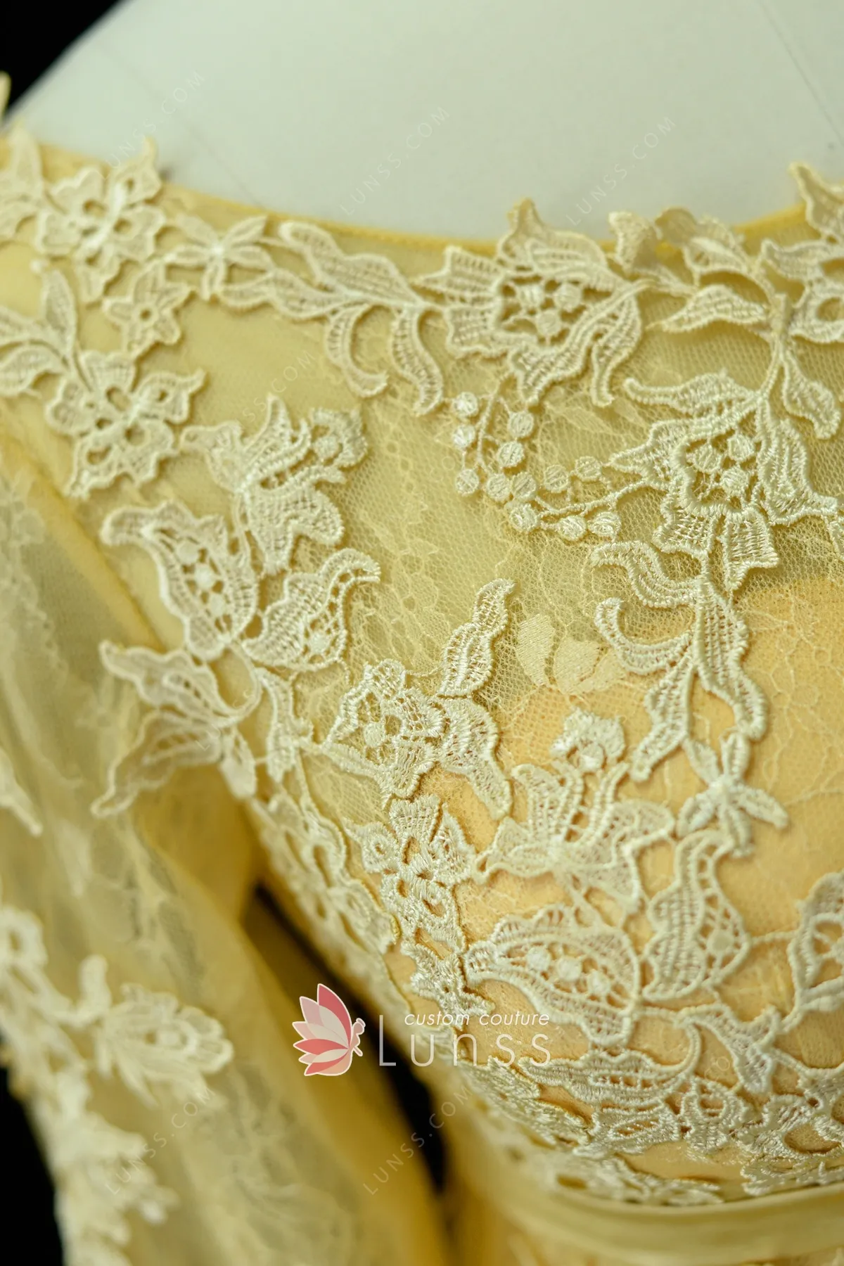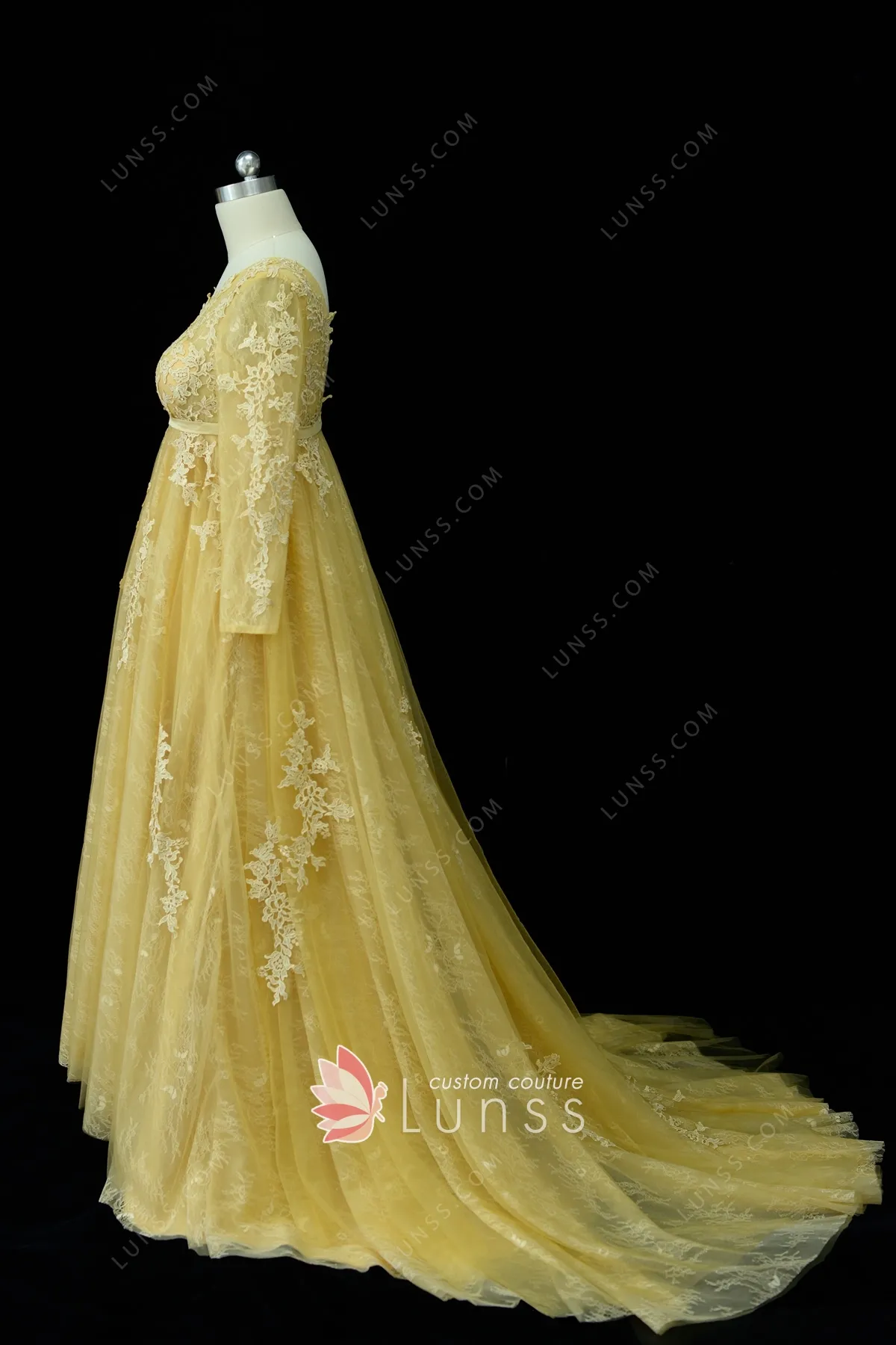 A plus-size anniversary formal dress made in airy tulle plays with lace appliqued bodice and illusion long sleeves. This dress matches an empire waistline with a bright golden yellow, which makes you an obvious existence.