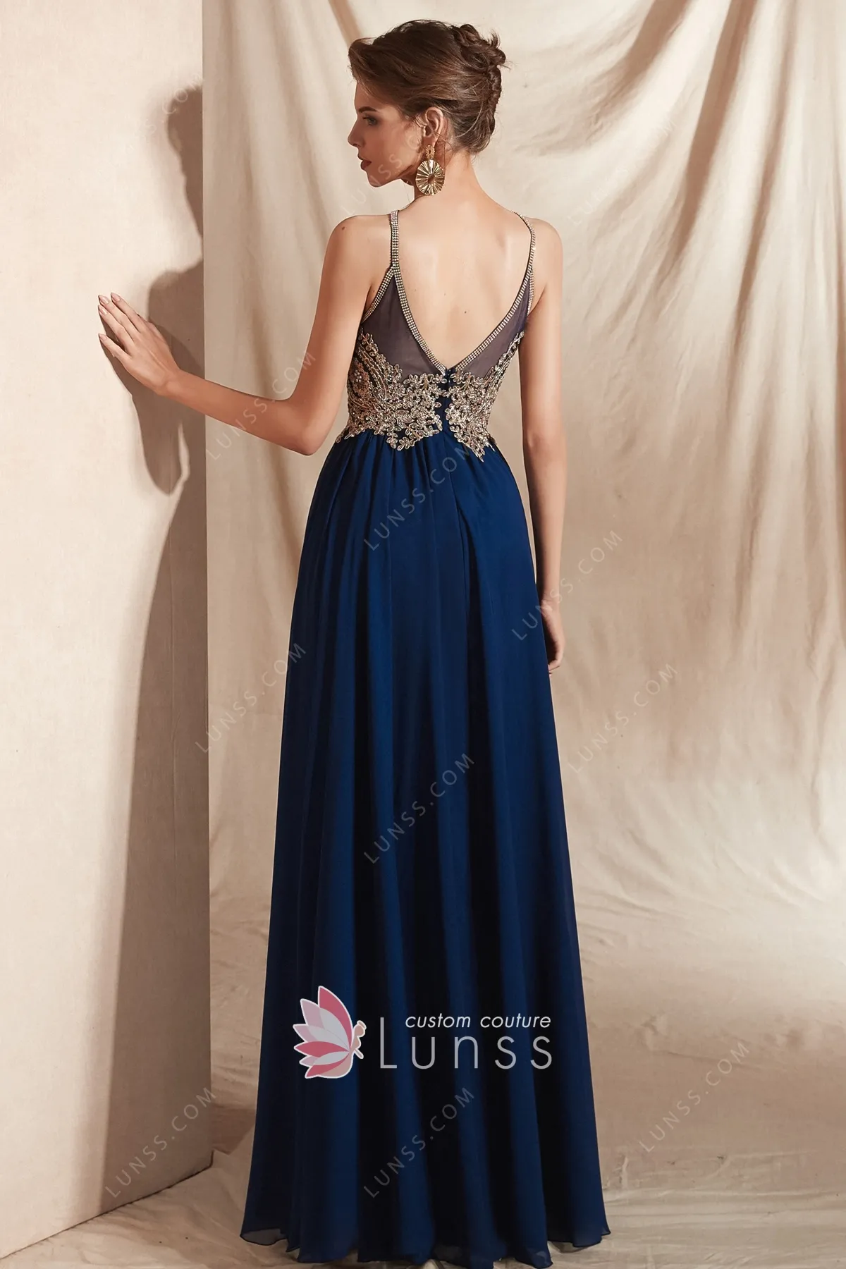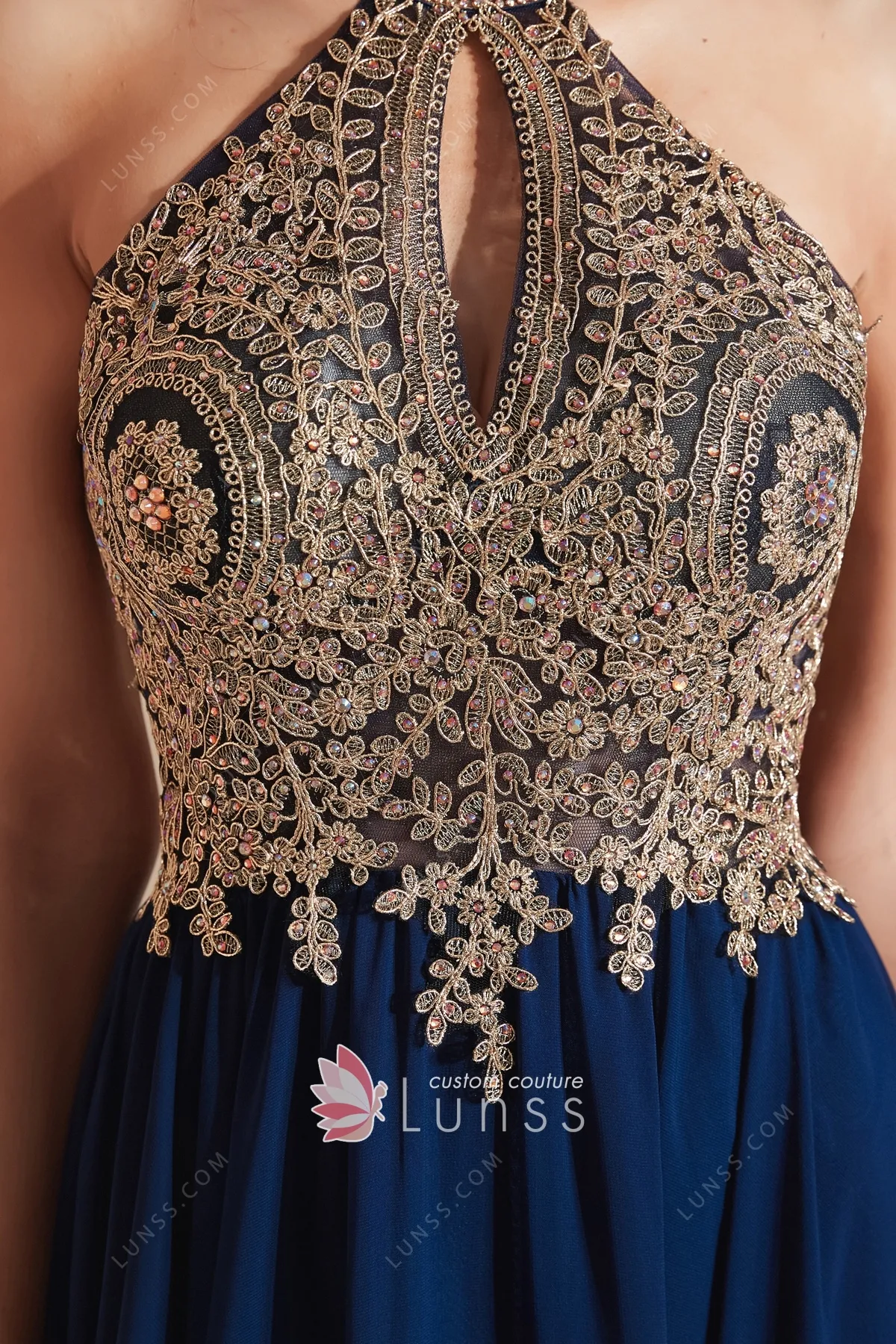 Vintage dark blue chiffon A-line long prom dress with sparkly gold lace applique. This stunning gown features sparkly gold lace bodice with a halter neckline, cut-out detail, floor-length skirt, and low V back.