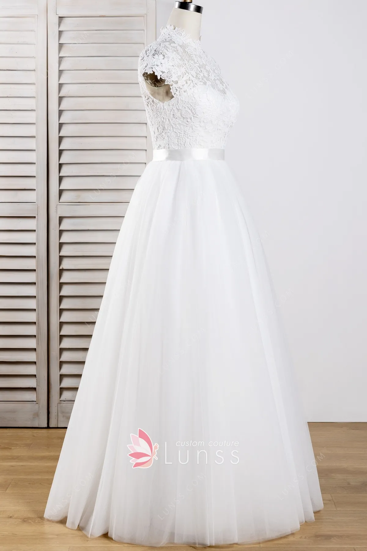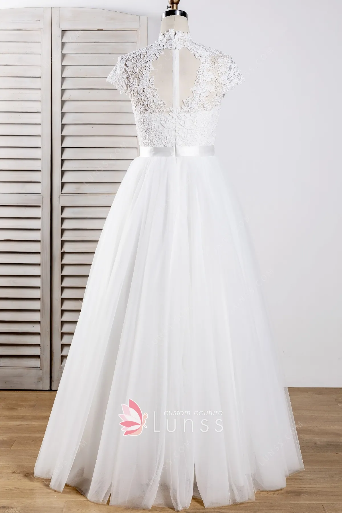 Vintage-inspired cap sleeve high neckline ivory lace and tulle A-line floor-length winter/fall wedding gown. Sweetheart bodice with illusion lace neckline and cap sleeves. Natural waist with satin sash belt. Zipper up illusion open back. No train.