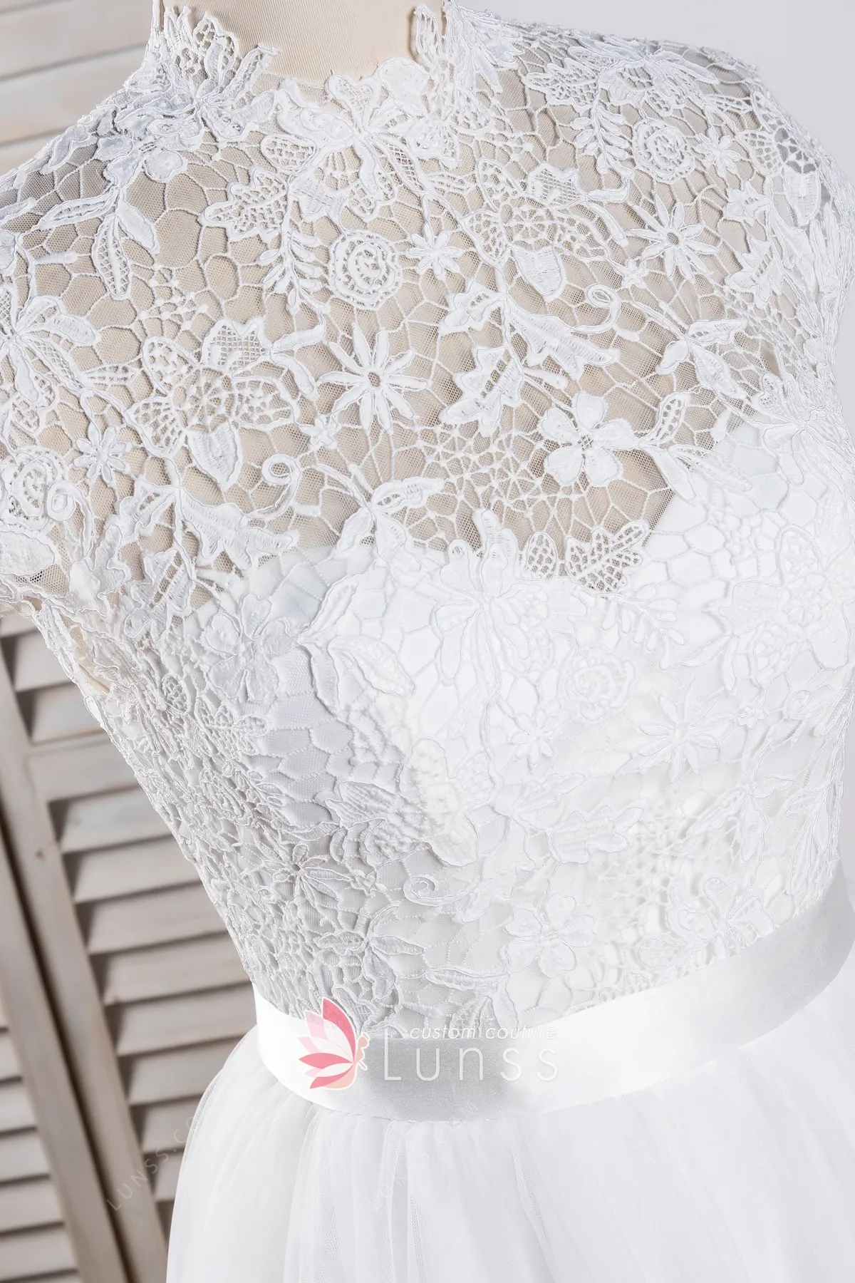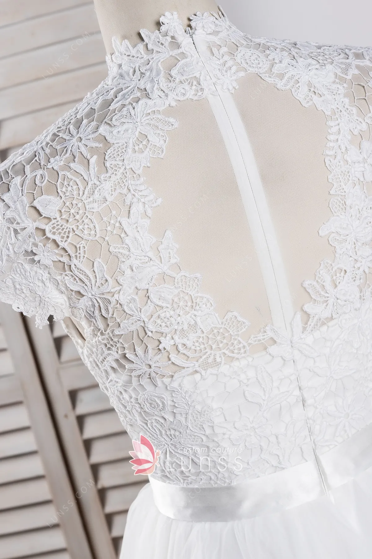 Illusion Lace Cap Sleeve High Neckline Tulle Bridal Dress (2X218)