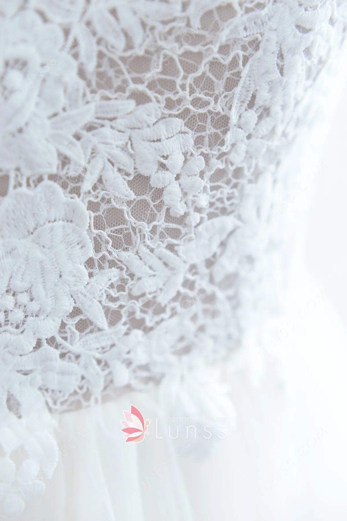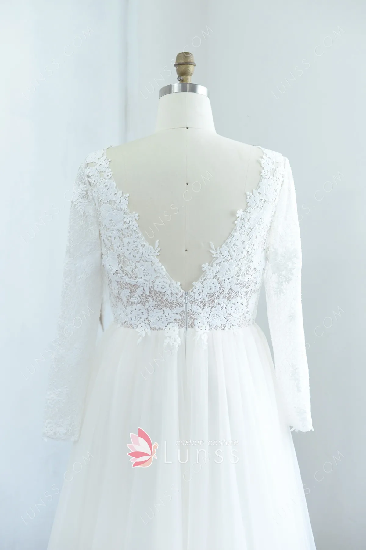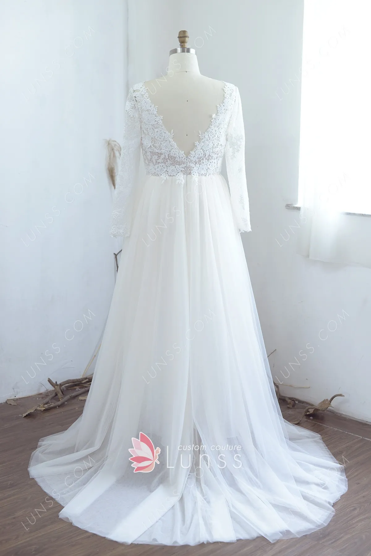 This simple lightweight ivory lace and tulle destination spring/fall wedding dress features A-line silhouette, classic V neckline, sweetheart nude lining bodice, V back style, sheer lace long sleeves and a court train.
