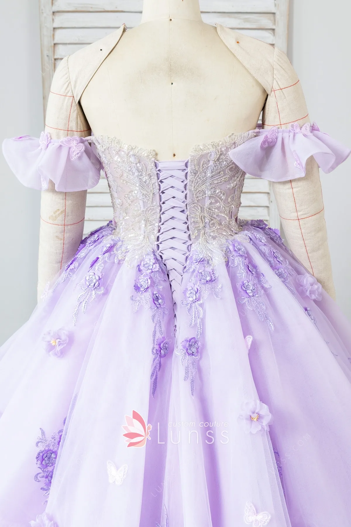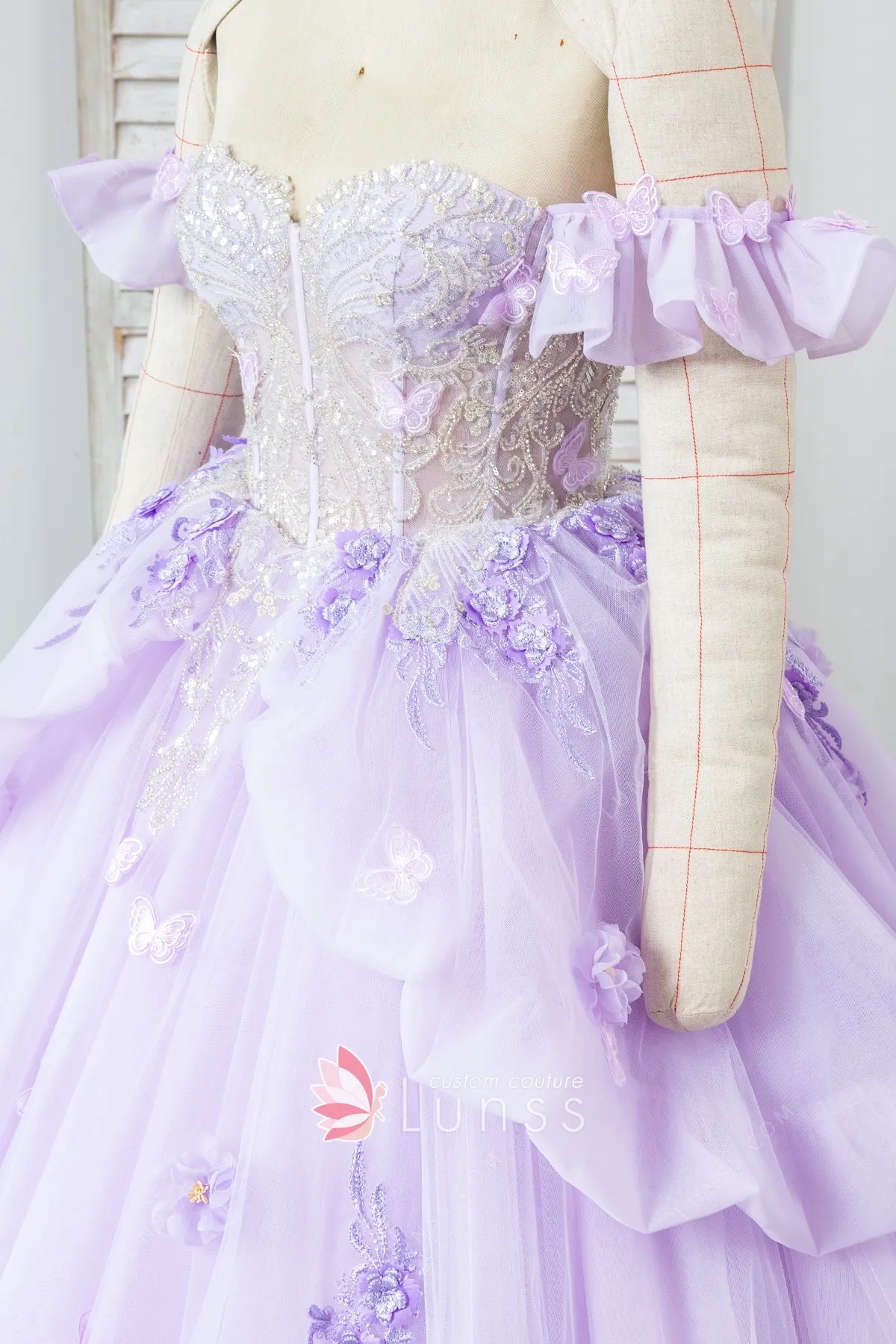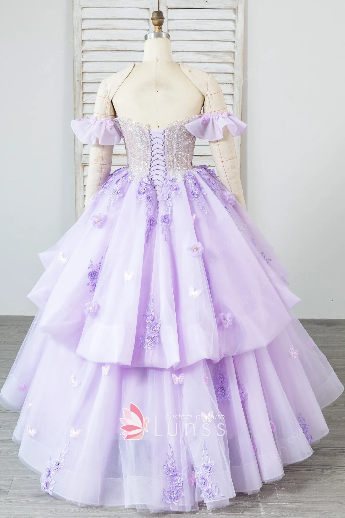 This fairy lavender sweet-16 dress features a sweetheart neckline with a sheer, corset-style design adorned with sparkling sequins. The off-the-shoulder flutter sleeves add a soft, ethereal touch. The skirt is a voluminous, multi-layered confection of light purple tulle. It features a tiered design, giving it a playful, cascading effect. The dress is embellished with scattered 3d butterfly appliqués and flowers. Perfect for a Quinceañera, birthday, prom, or formal event.