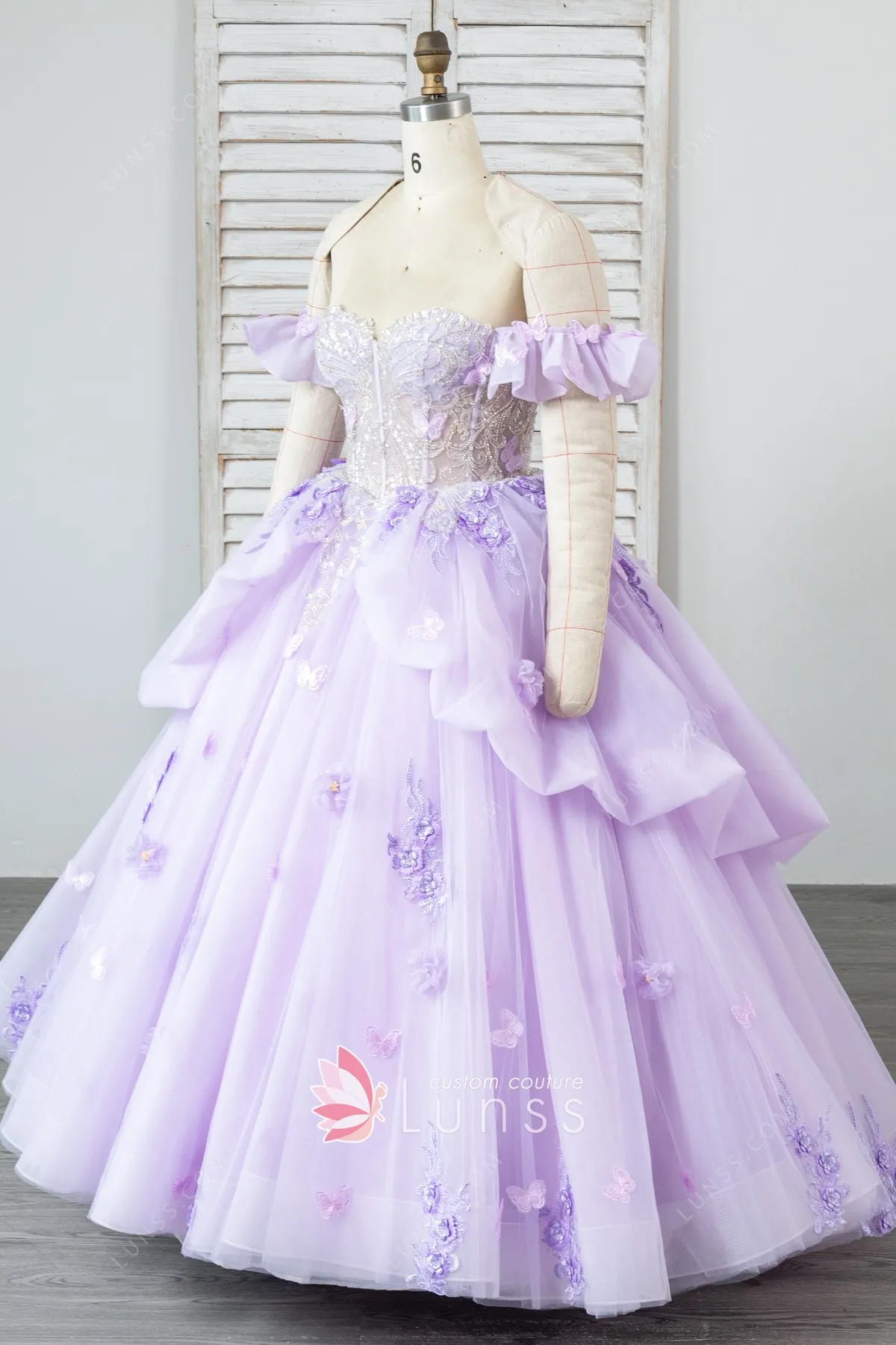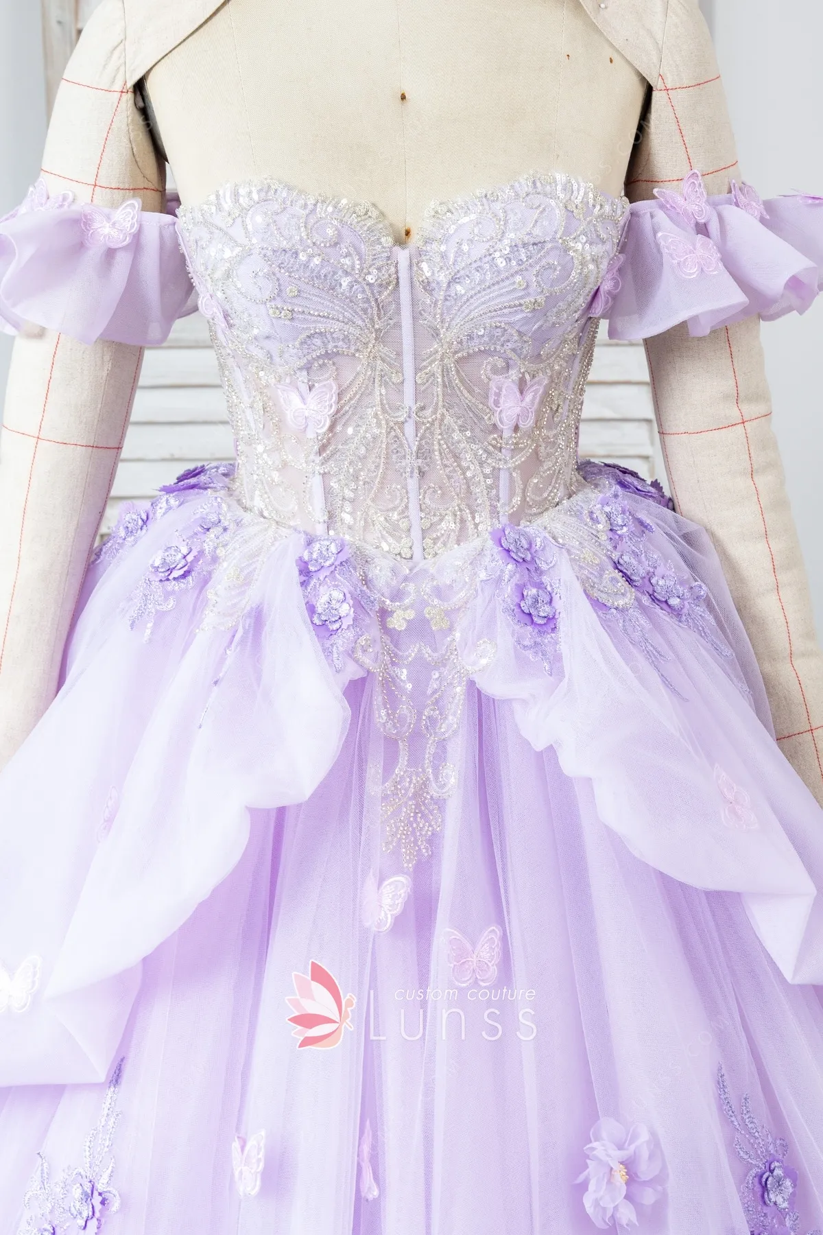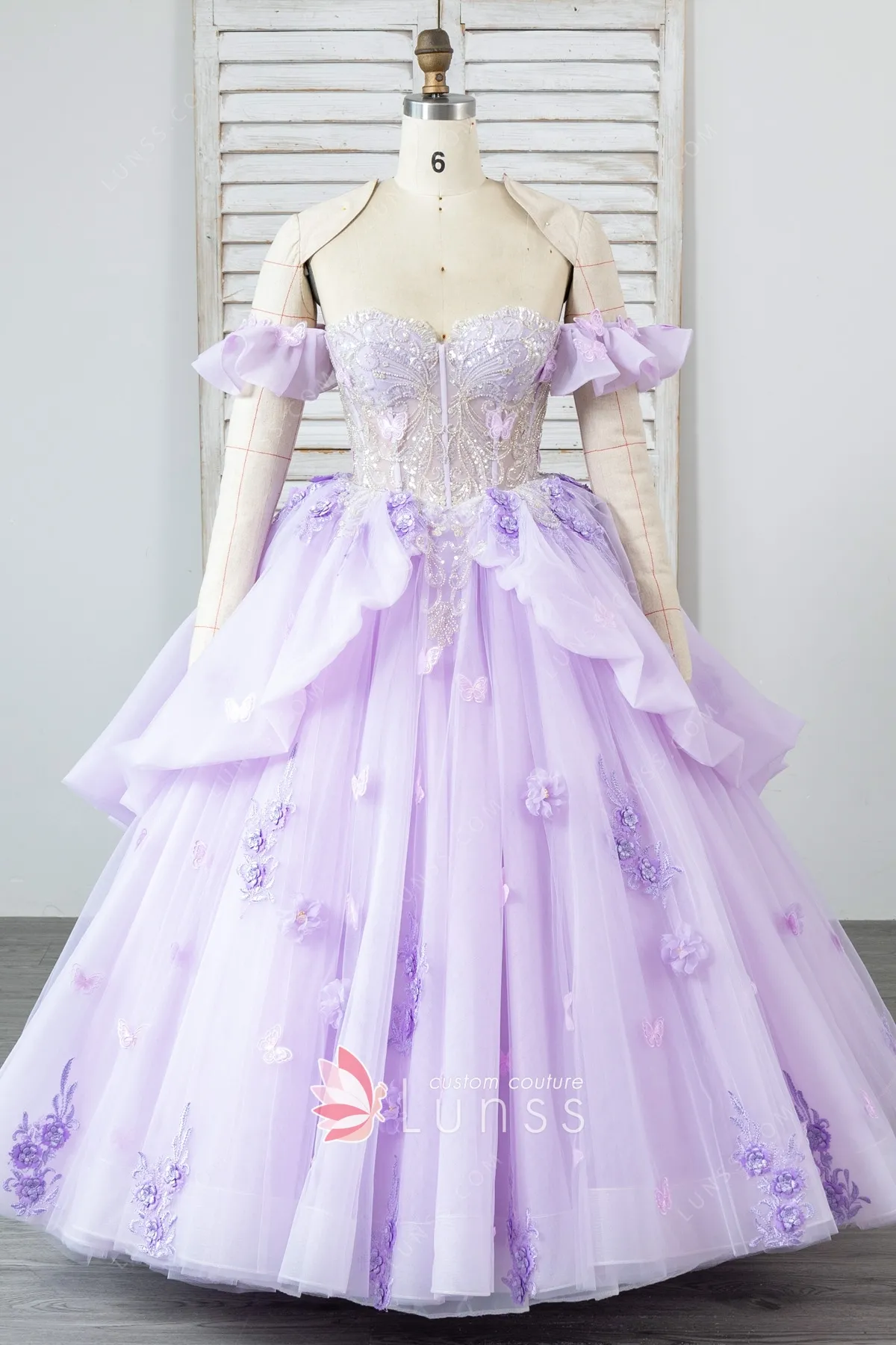 This fairy lavender sweet-16 dress features a sweetheart neckline with a sheer, corset-style design adorned with sparkling sequins. The off-the-shoulder flutter sleeves add a soft, ethereal touch. The skirt is a voluminous, multi-layered confection of light purple tulle. It features a tiered design, giving it a playful, cascading effect. The dress is embellished with scattered 3d butterfly appliqués and flowers. Perfect for a Quinceañera, birthday, prom, or formal event.