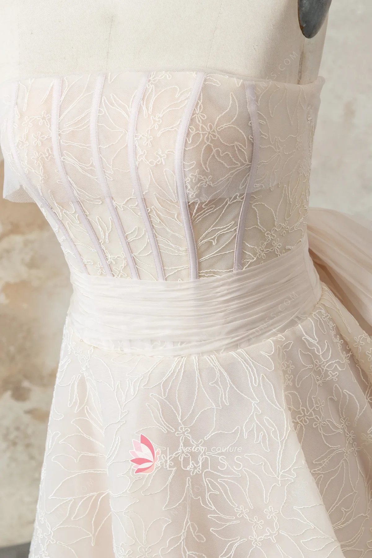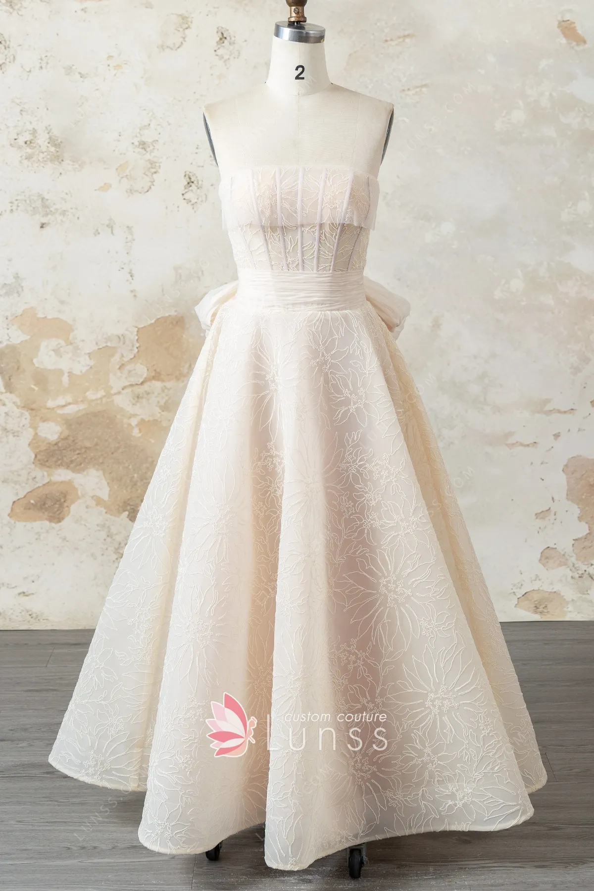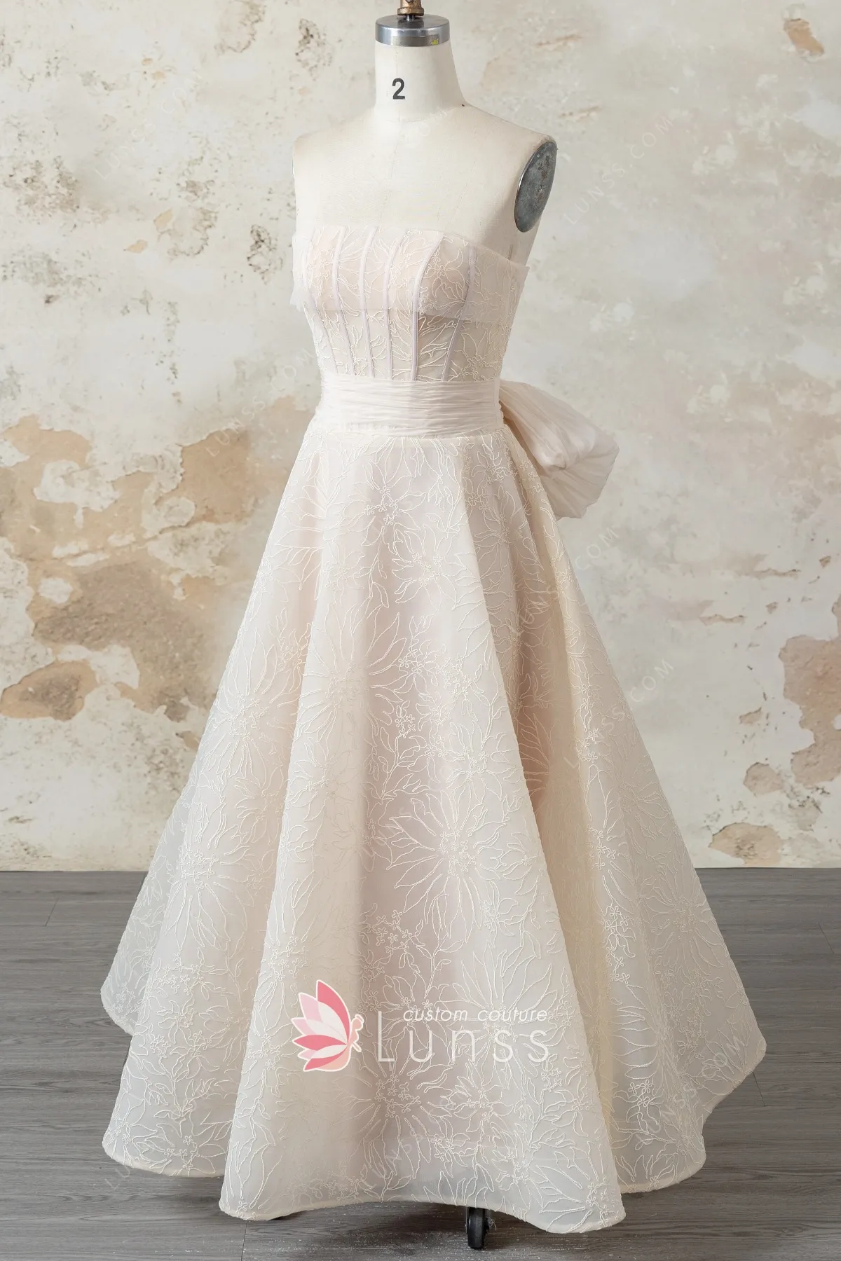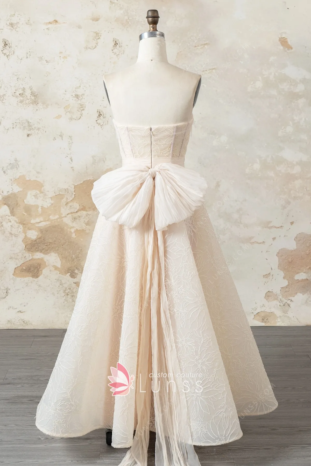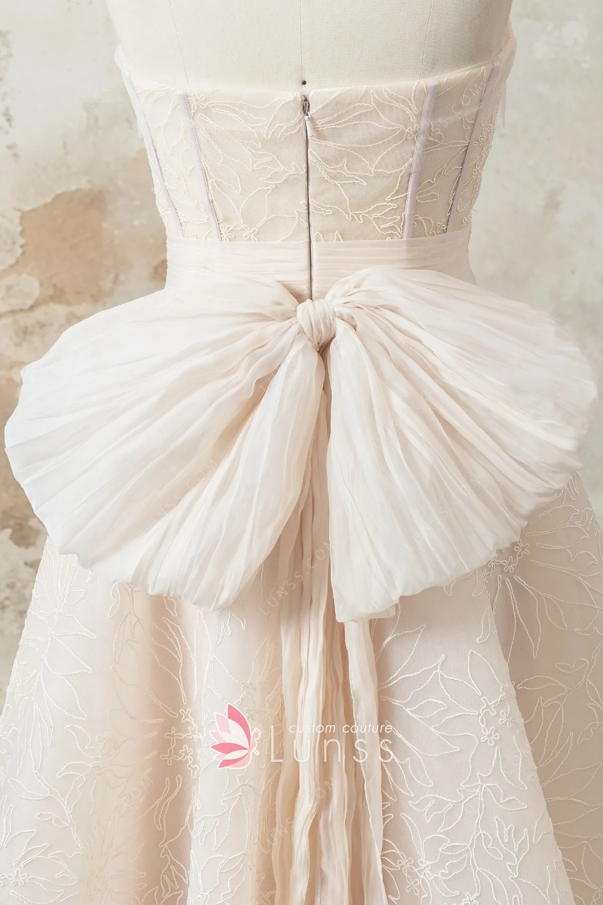 This exquisite nude embossed corded lace wedding gown features a strapless corset bodice, a natural waistline is cinched with a wide, pleated sash that ties in the back, with an oversized bow that is crafted from the same pleated fabric as the waist sash. The A-line long skirt is both elegant and playful. The dress is a perfect choice for a variety of formal occasions, including a modern wedding, a sophisticated prom, and an anniversary party.