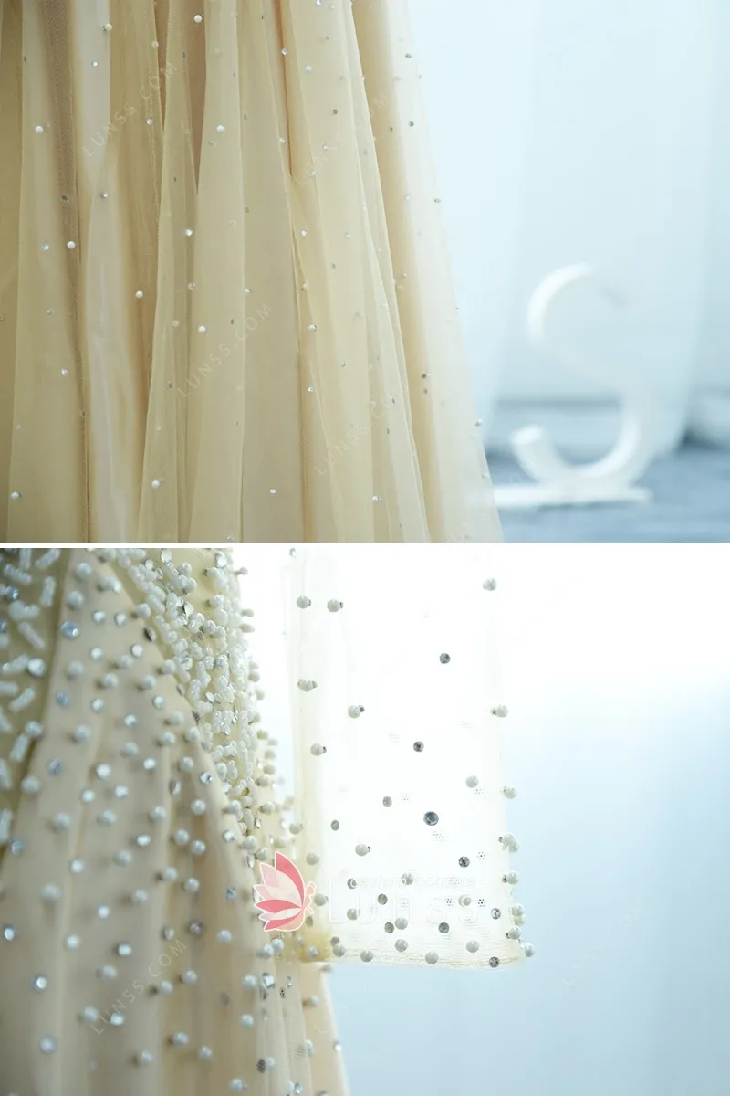 Kylie Jenner's champagne dress on Golden Globes 2016 red carpet. Pearls beaded top with sheer long sleeves, two-piece champagne tulle and satin celebrity prom dress.