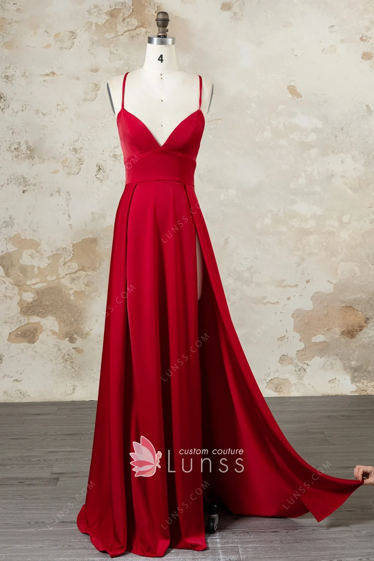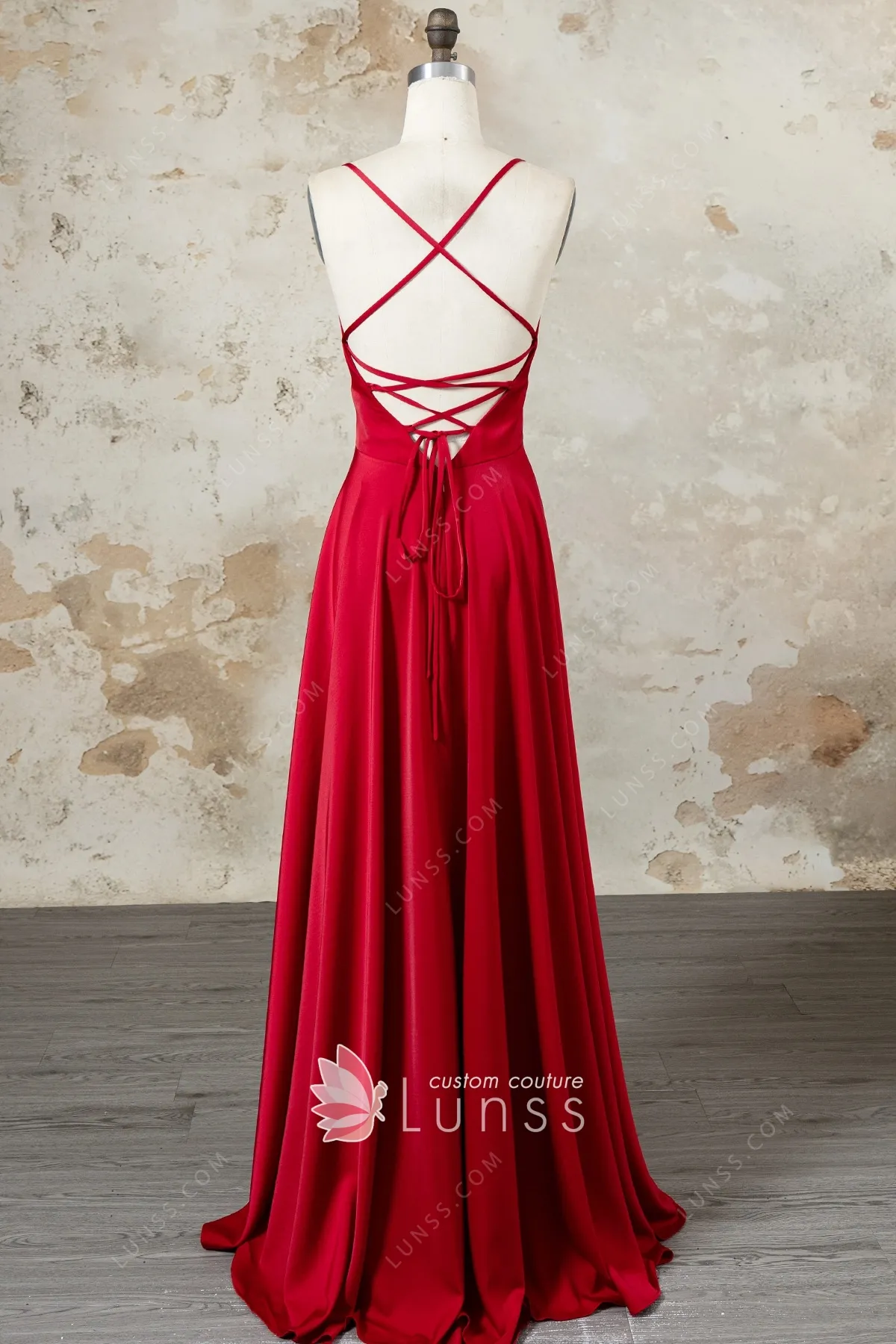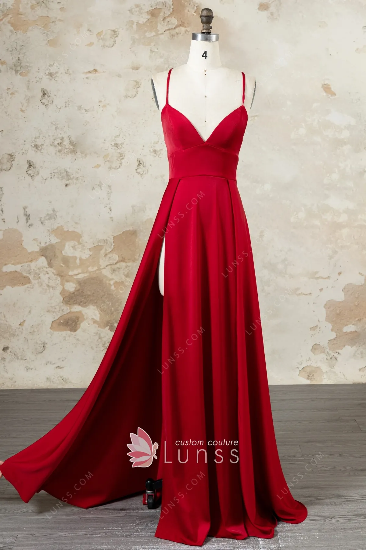 This is a sleek and glamorous A-line satin bridesmaid & prom party gown in a striking, vibrant red. The special occasion dress features a fitted bodice with a plunging sweetheart V-neckline, supported by delicate spaghetti straps. A defined waistband separates the bodice from a long, flowing A-line skirt. Dramatic, double thigh-high slits on the side add a modern and sexy element. The open, low-cut back design with criss-crossing spaghetti straps that tie in a corset-style 'lace-up' fashion.