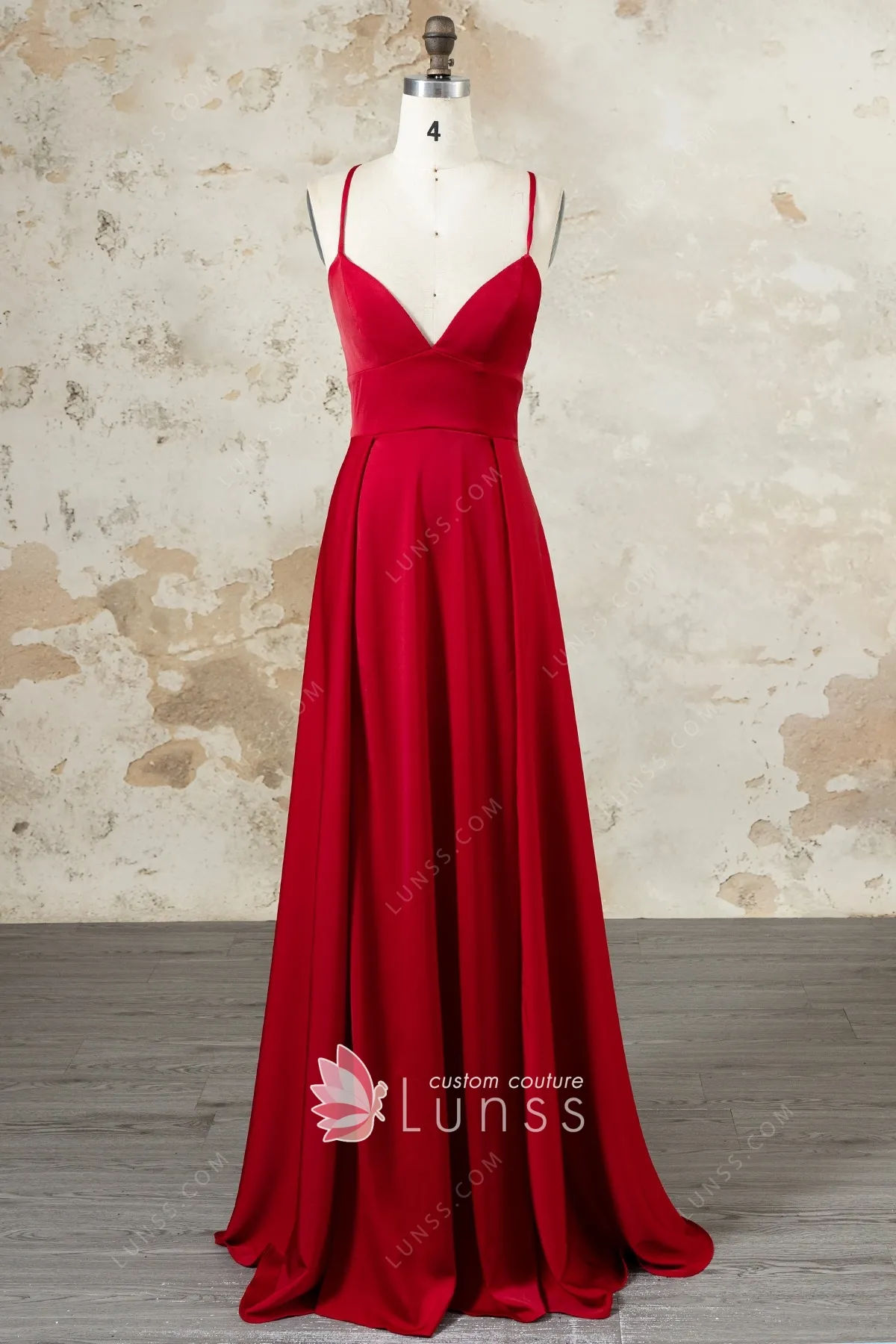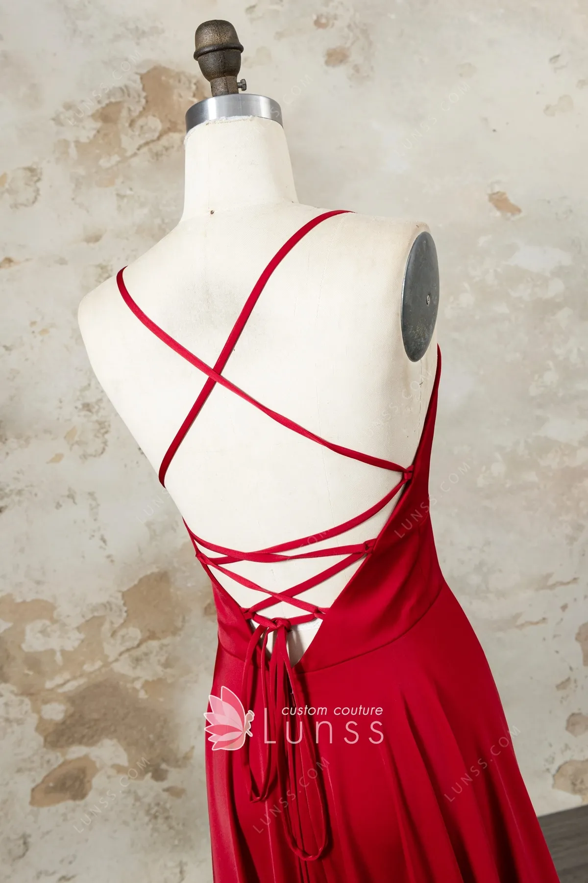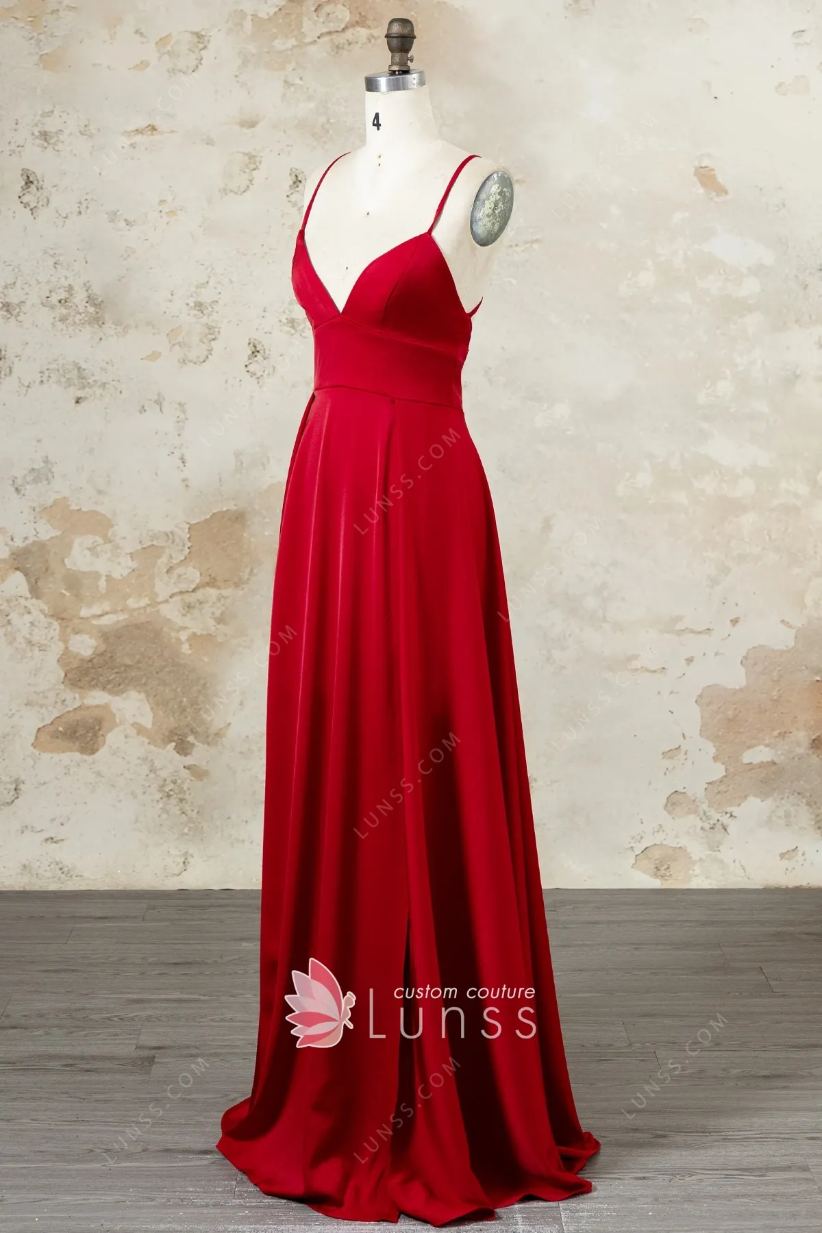 This is a sleek and glamorous A-line satin bridesmaid & prom party gown in a striking, vibrant red. The special occasion dress features a fitted bodice with a plunging sweetheart V-neckline, supported by delicate spaghetti straps. A defined waistband separates the bodice from a long, flowing A-line skirt. Dramatic, double thigh-high slits on the side add a modern and sexy element. The open, low-cut back design with criss-crossing spaghetti straps that tie in a corset-style 'lace-up' fashion.
