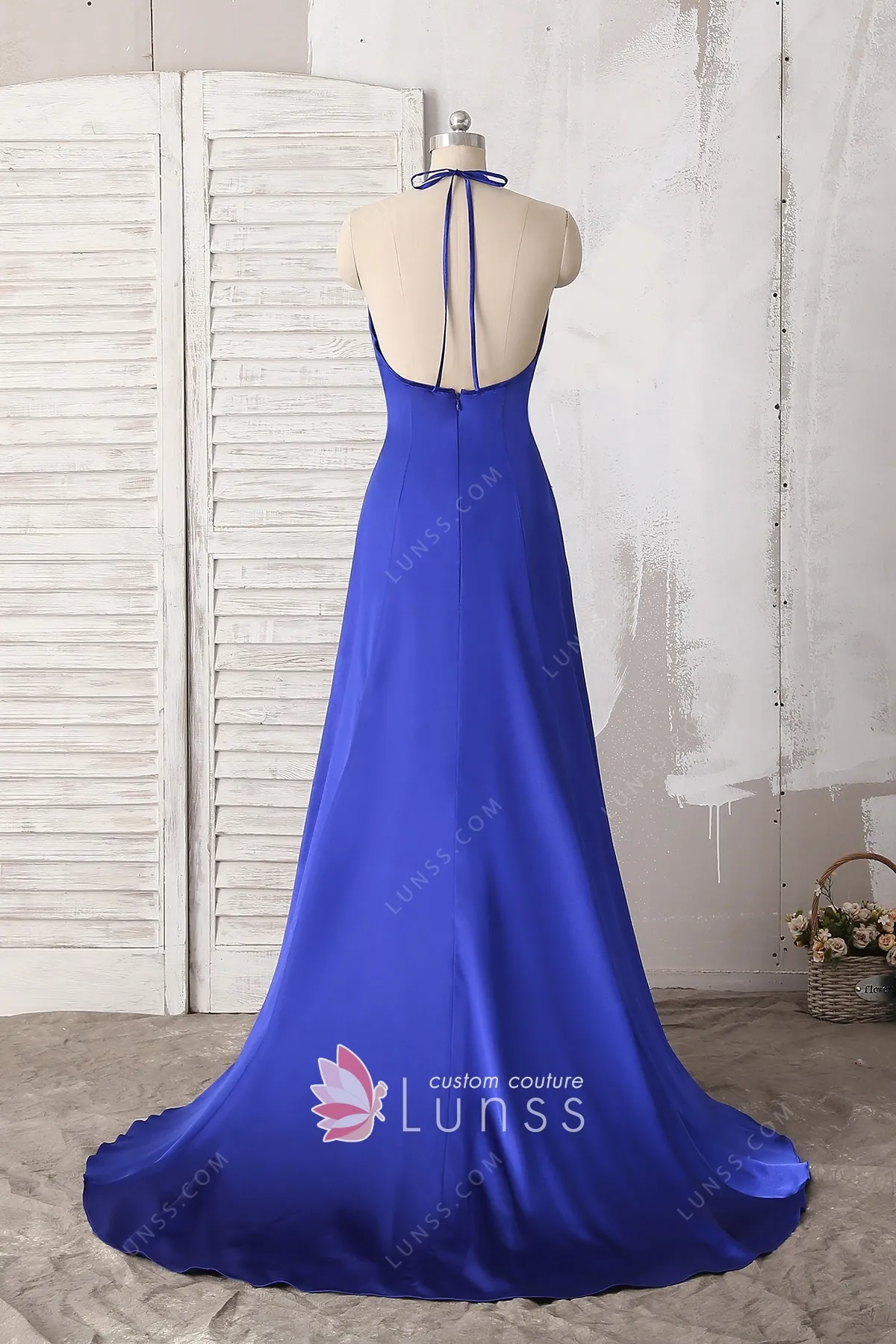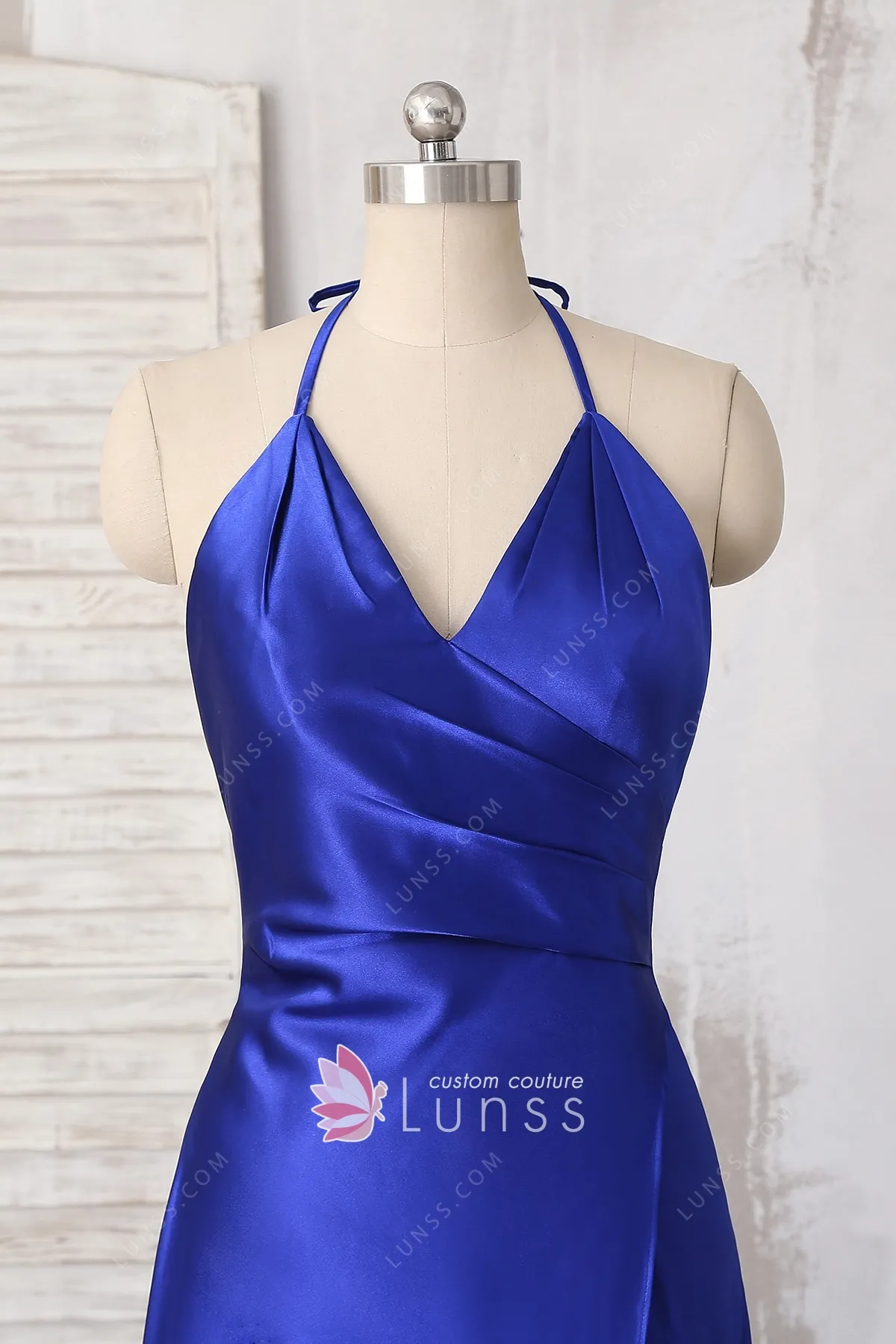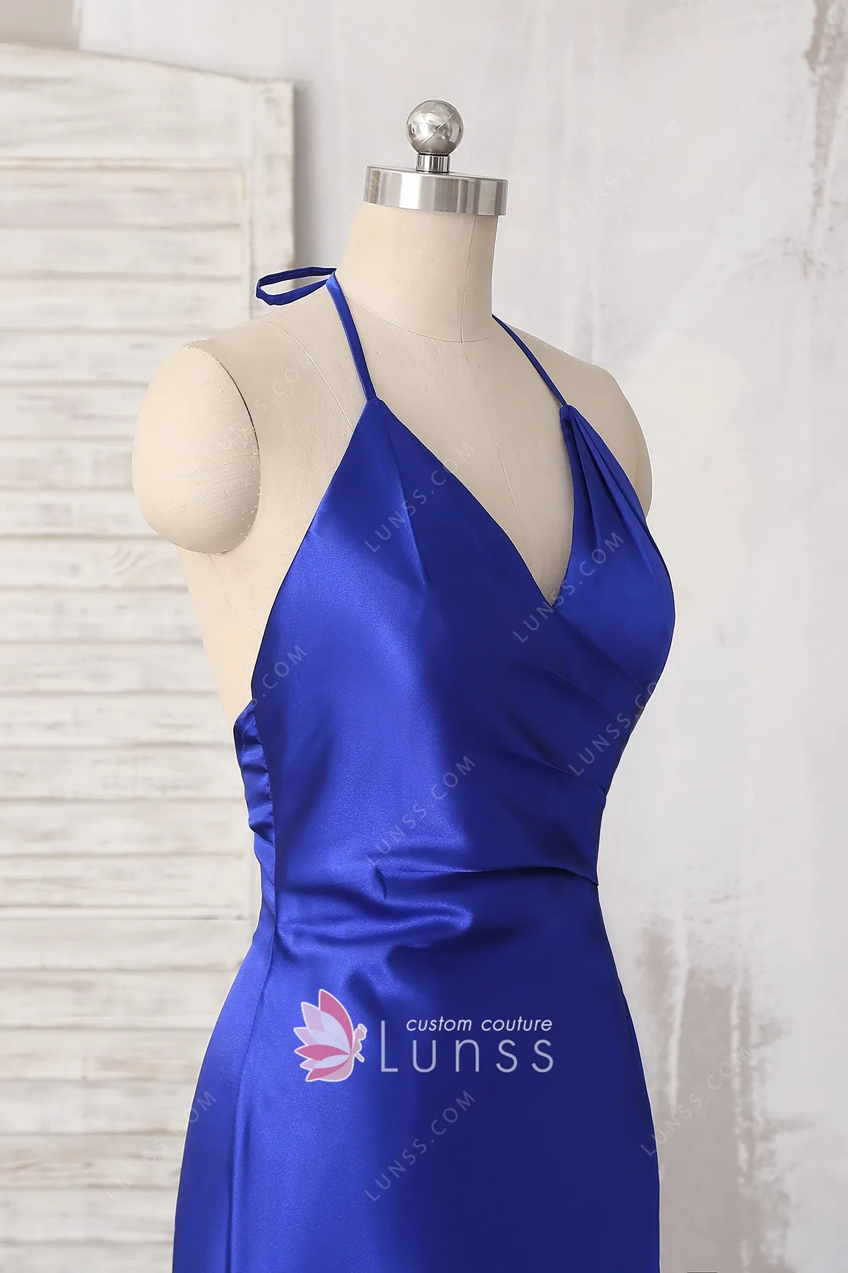 Royal blue sleek satin sexy evening prom party and military ball dress with halter V neckline, made of soft glossy satin, open low back. The asymmetric slit on the left front of it will add an simple, sexy flair to your next event.