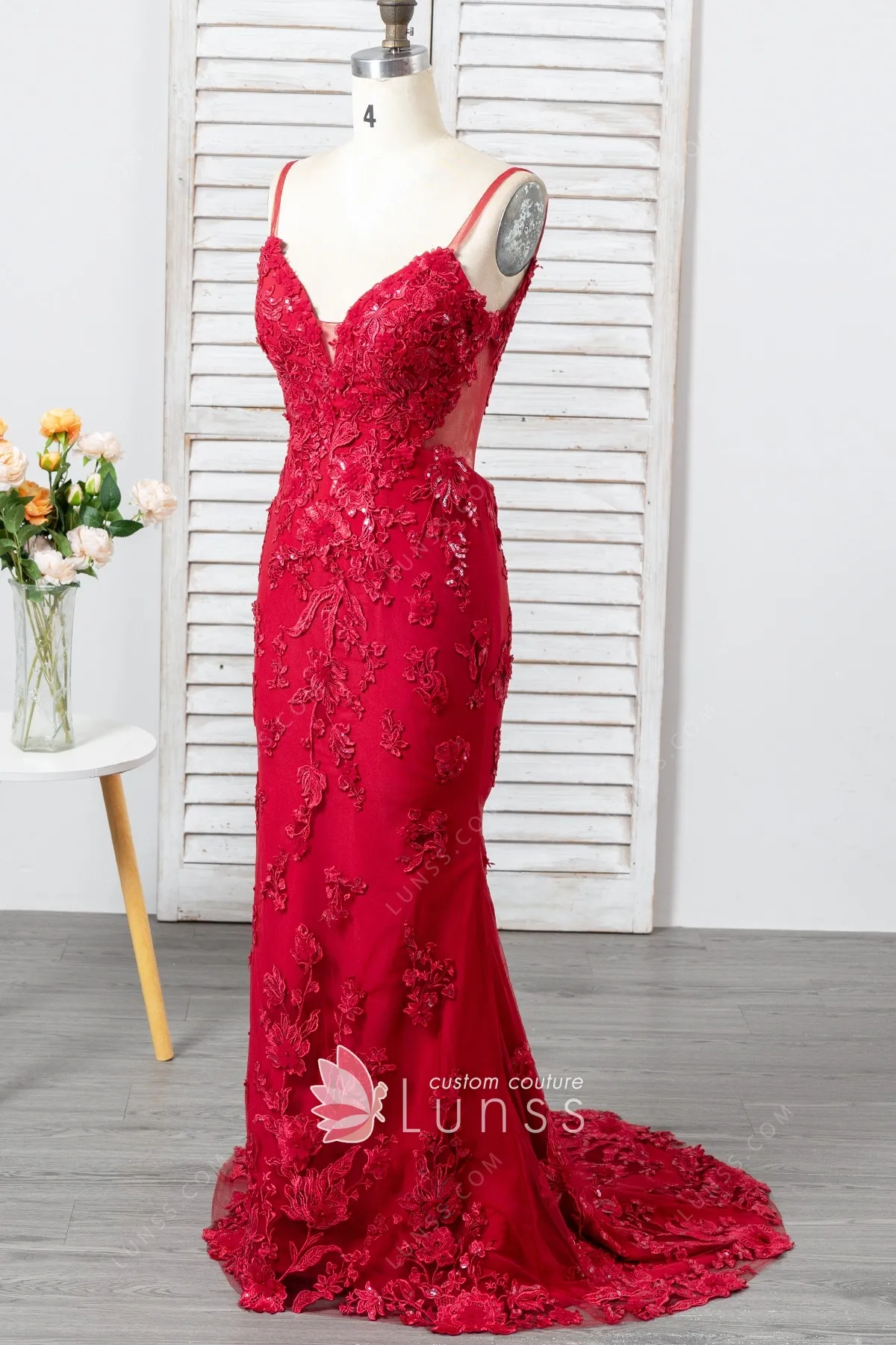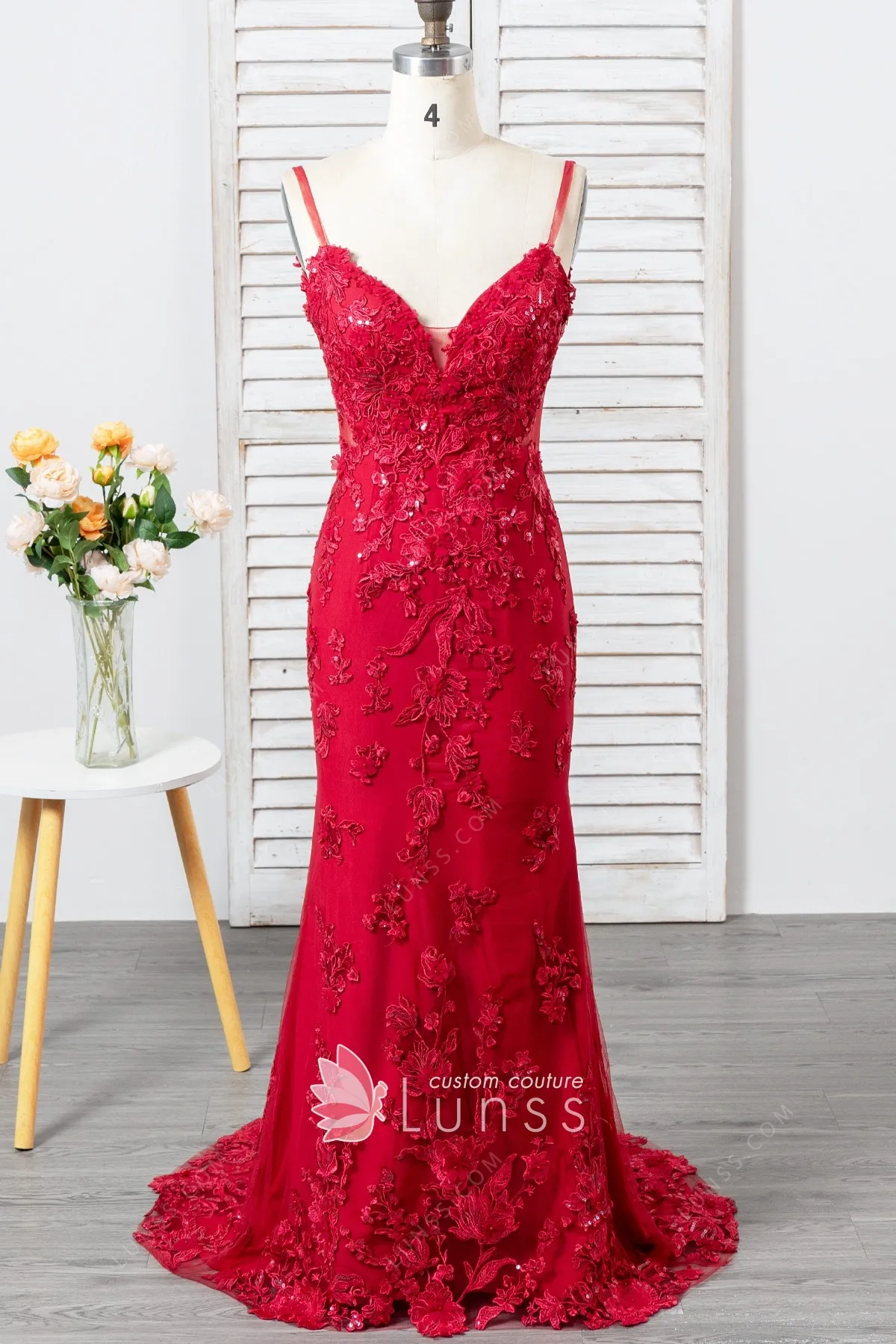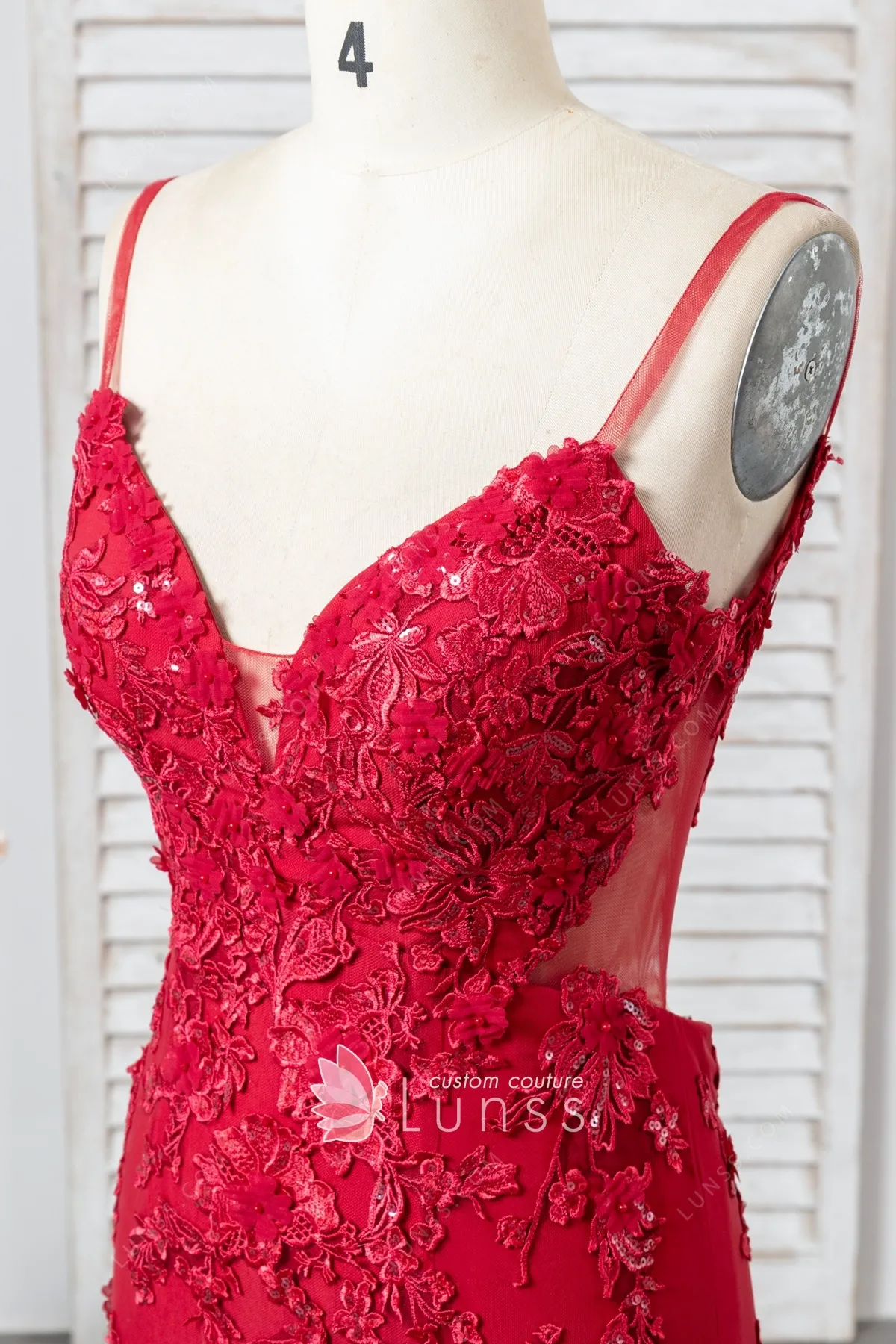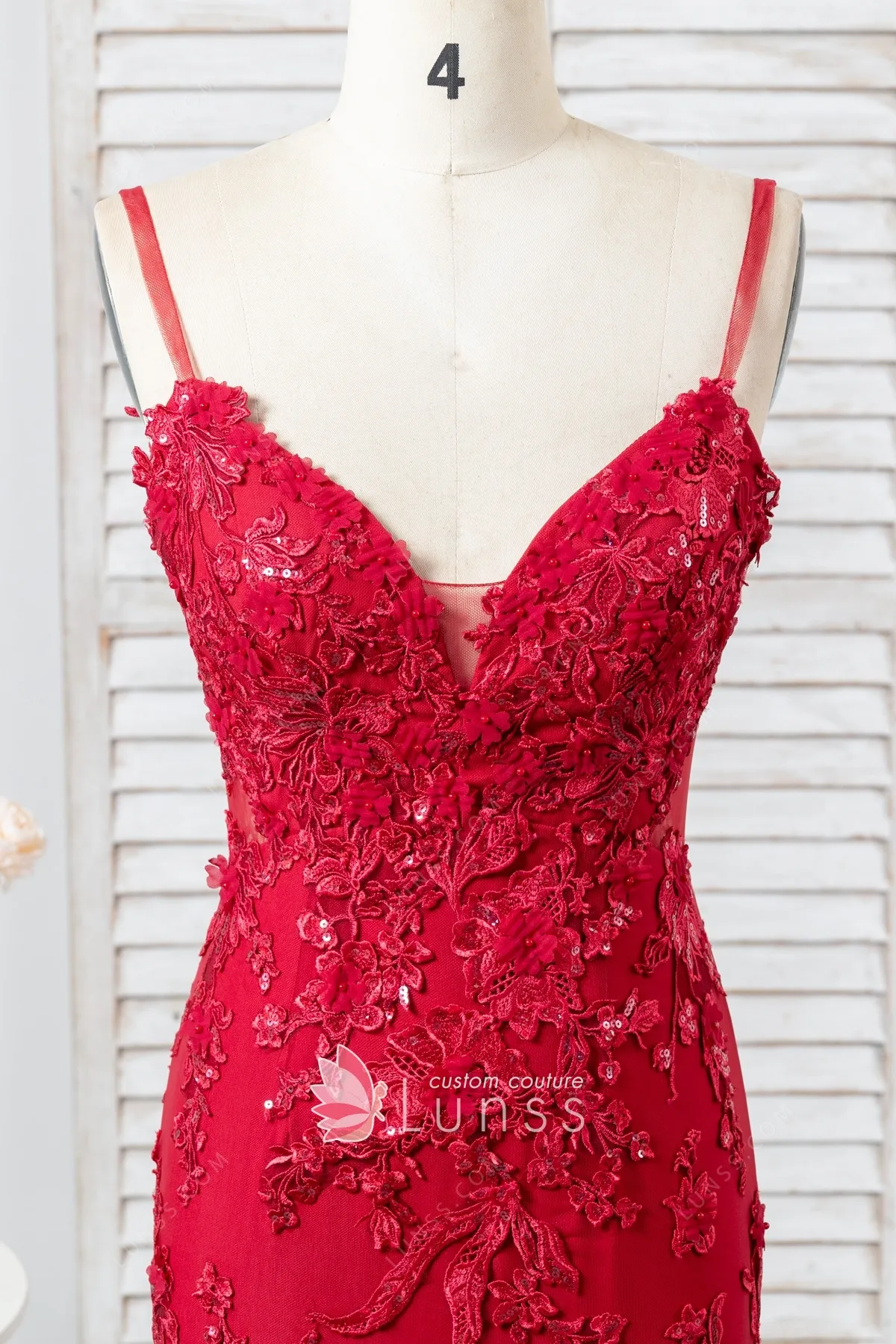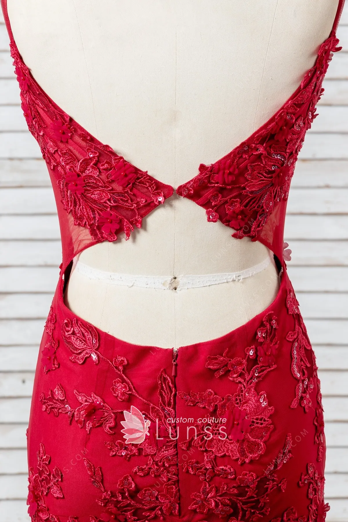 This elegant ruby evening dress features a sweetheart neckline with delicate spaghetti straps. The bodice is intricately detailed with sequinned floral lace appliqués, beadwork, and 3d flowers, which continues down the length of the dress in a vine-like pattern. The open back of the dress features a low-cut, V-shape with a keyhole cutout at the lower back, adding a touch of modern elegance. Perfect for prom, military ball, or any formal event.