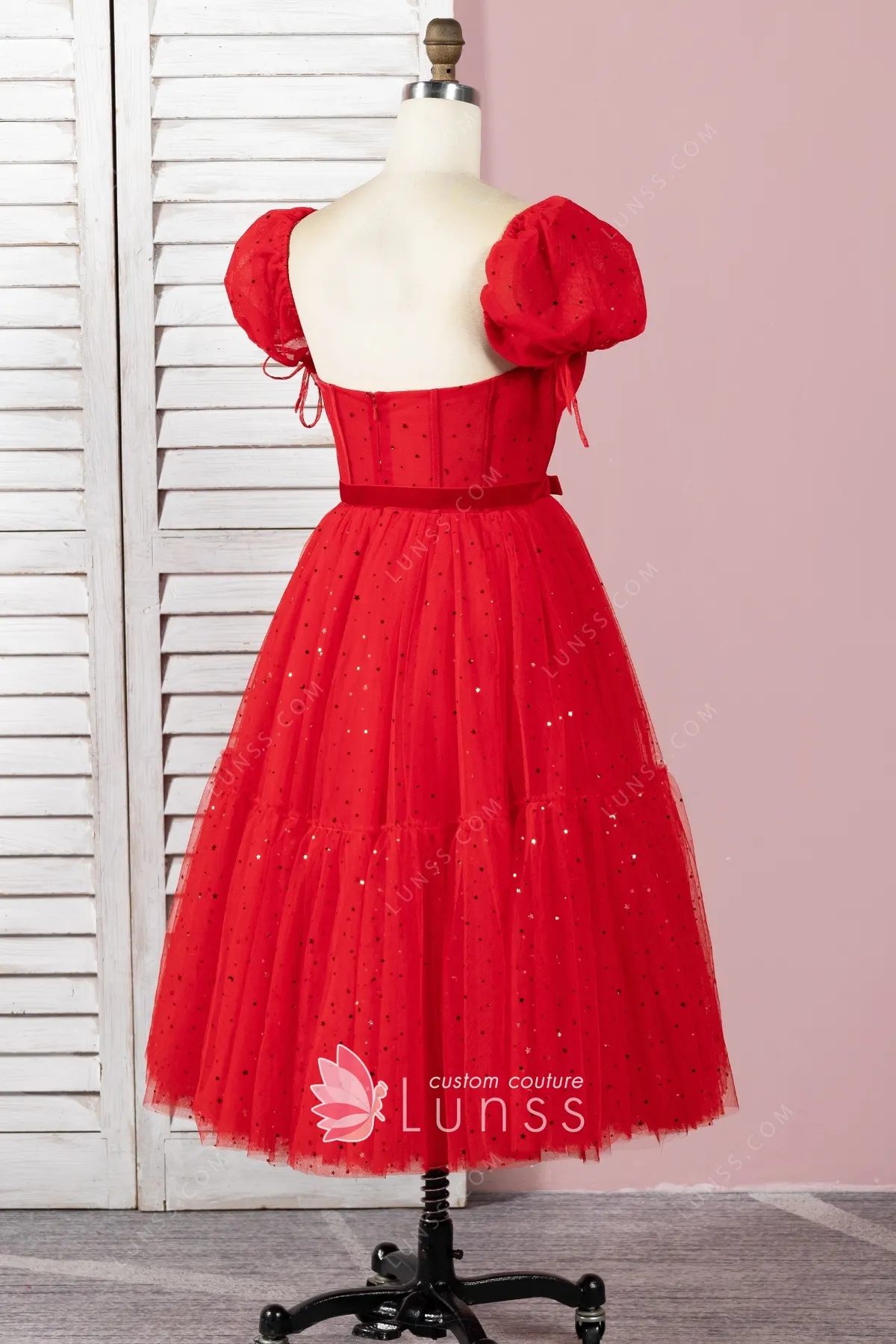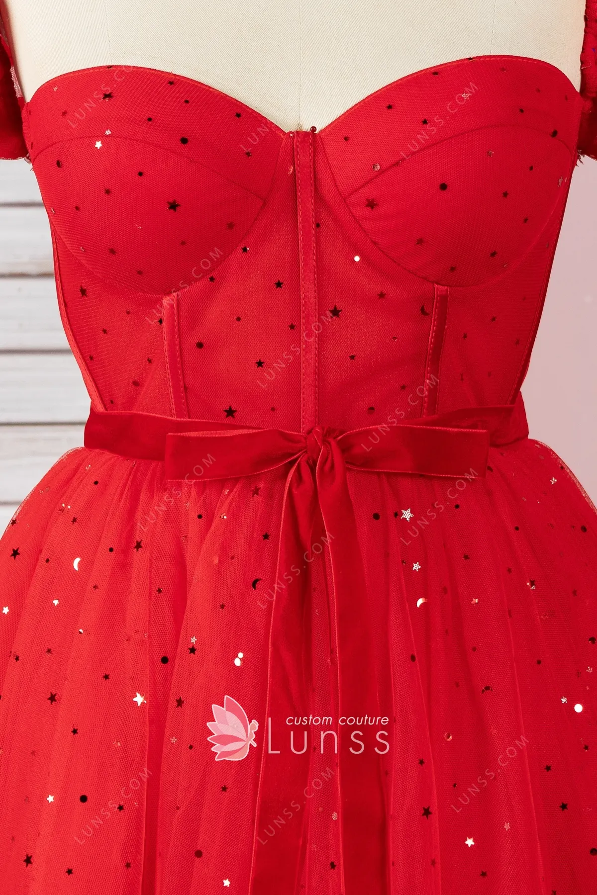 Star and moon sequinned red tulle knee length/tea length short cute homecoming party or birthday prom dress with short puff sleeves. Sweetheart neckline with corset bodice. Velvet detachable sash belt.