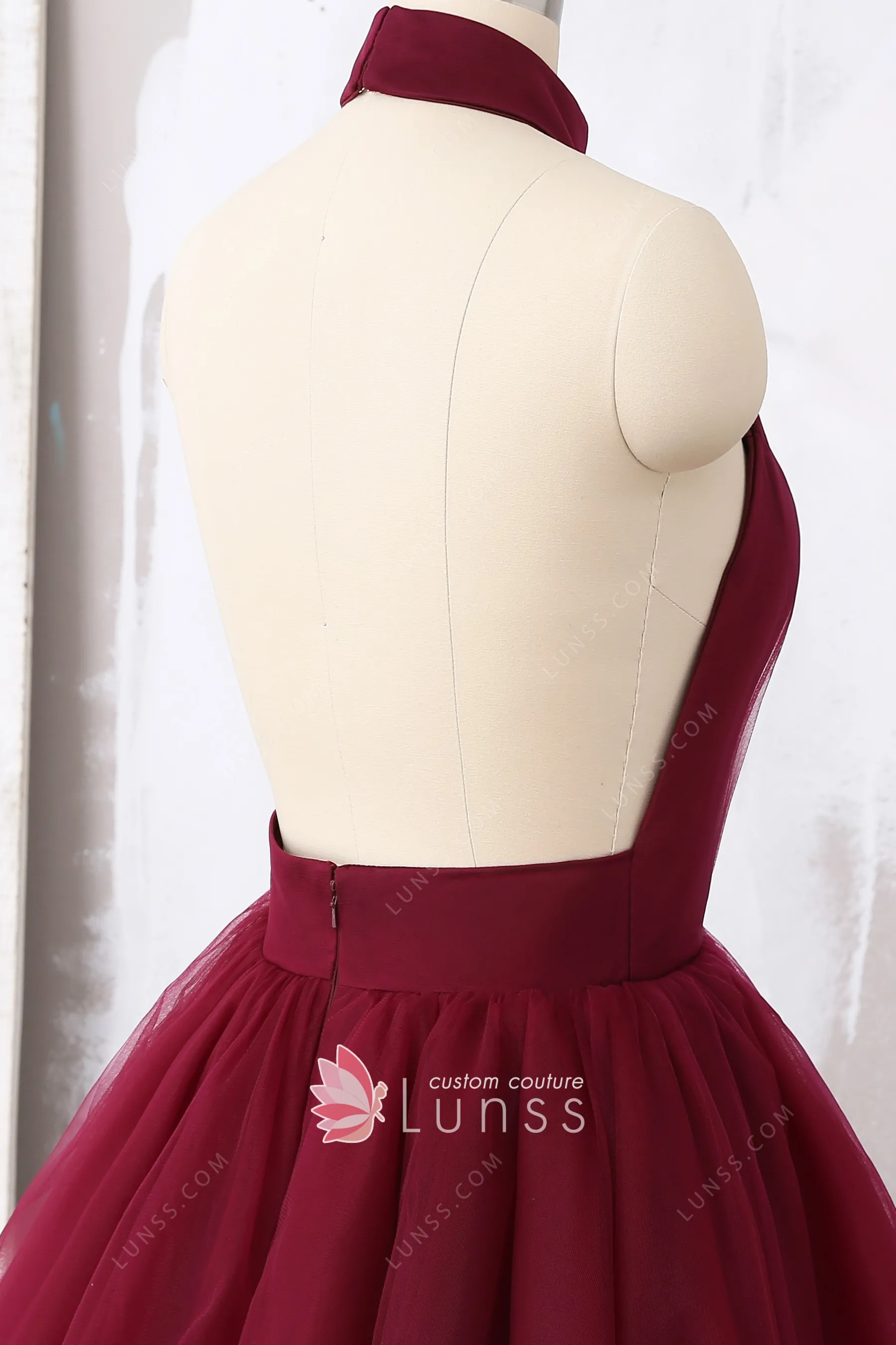 This sexy burgundy tulle puffy graduation, pageant, and prom dress features a timeless ball gown silhouette, an alluring halter plunging neckline, pleated bodice with low back. Get this best look for your special day.