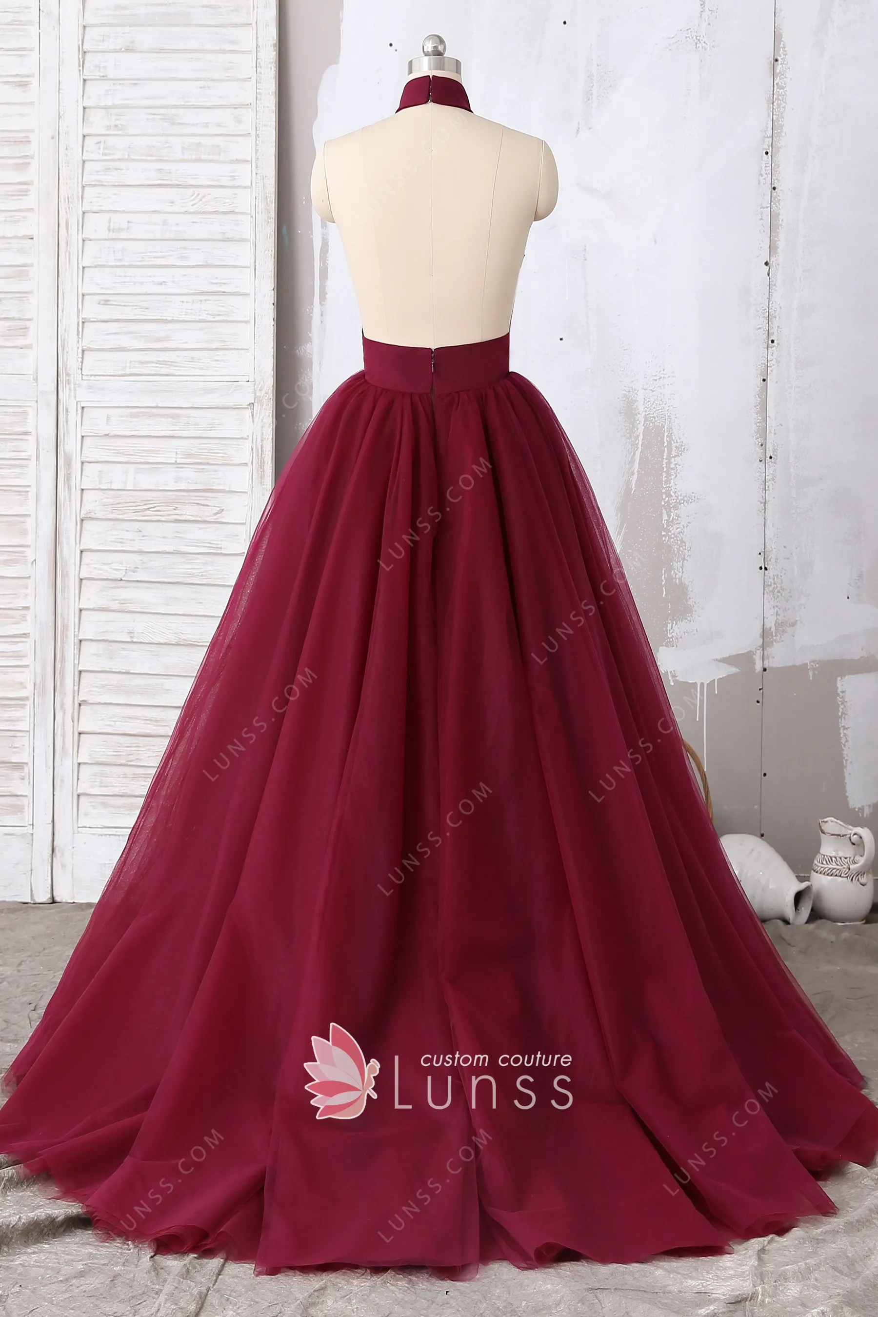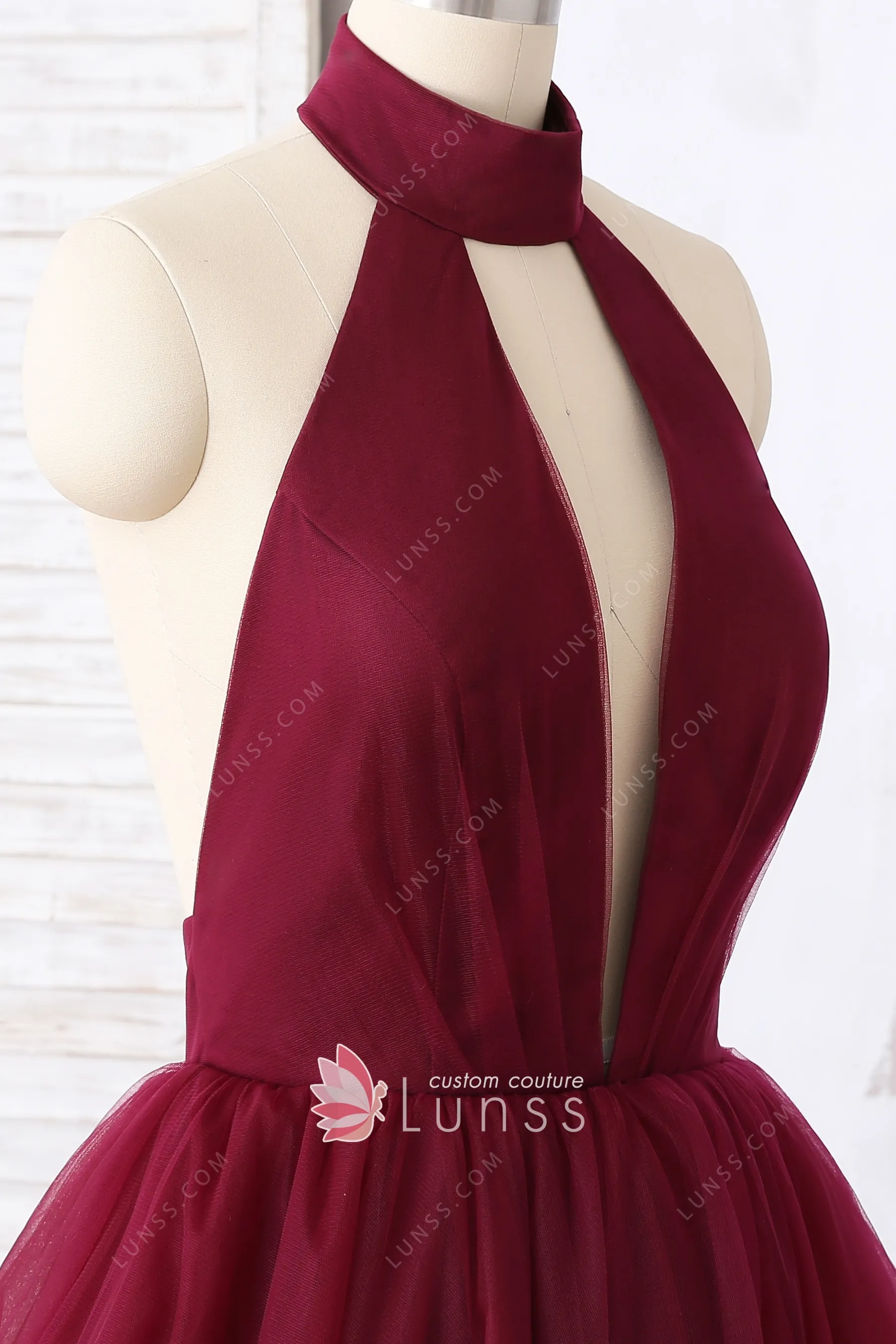 Sexy Burgundy Tulle Halter Plunging Neck Prom Ball Gown (1X284)