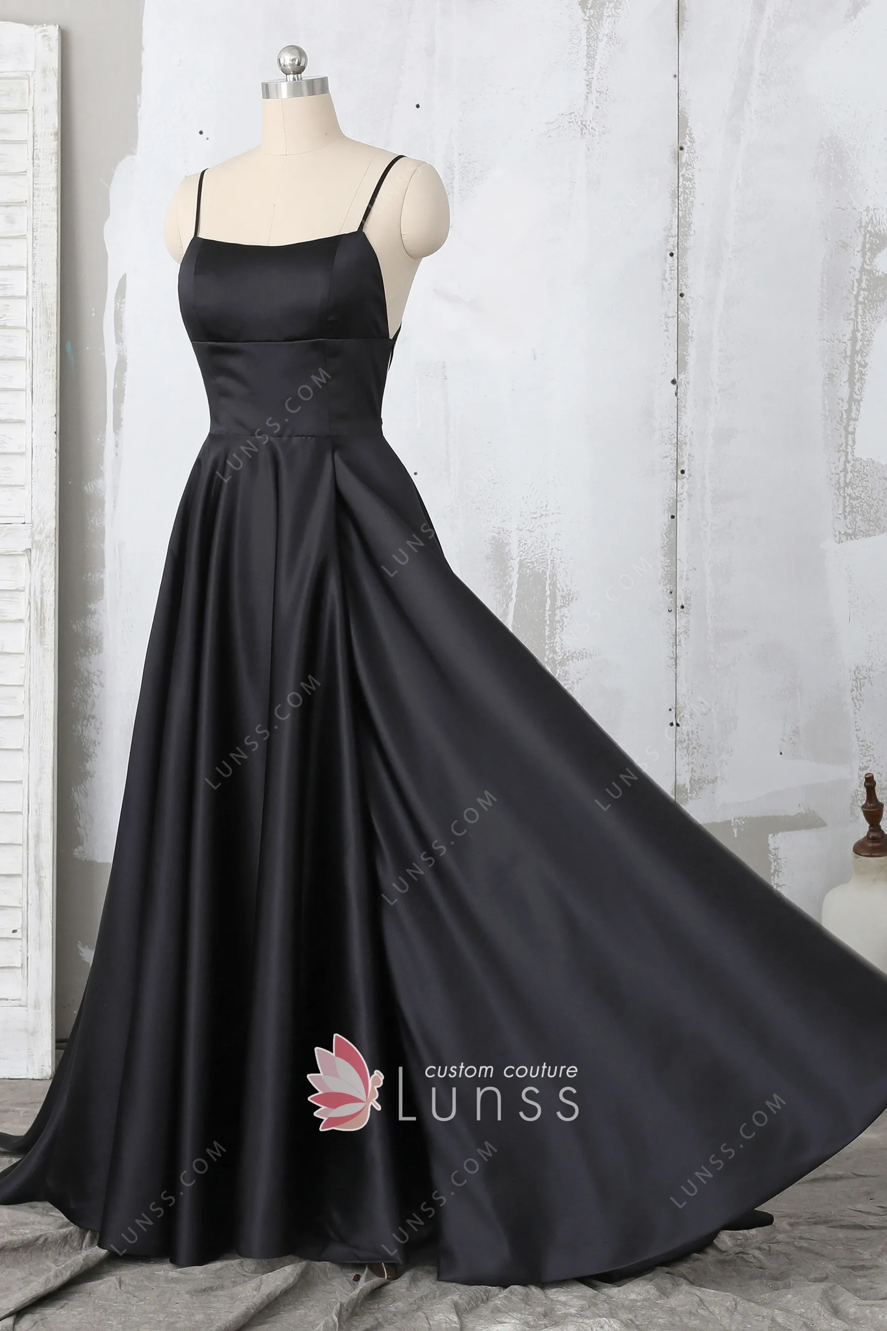 This simple solid black A-line evening prom, graduation party, and military ball dress features spaghetti strap shoulder, straight across neckline, criss-cross straps low back, and slit A-line skirt with a short train.