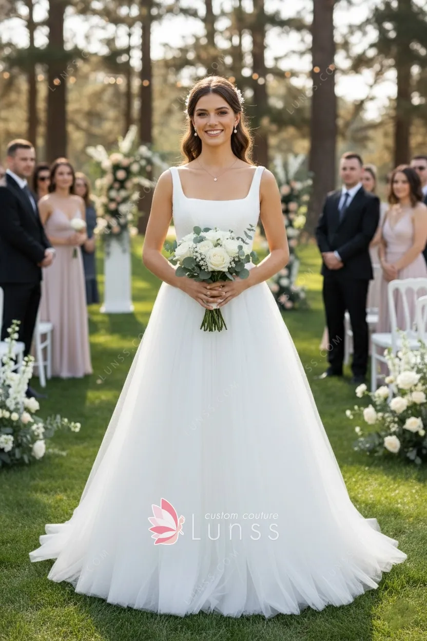 This simple yet chic ivory tulle A-line floor-length spring bridal shower or wedding dress features a square neckline with wide straps, a pleated inverted triangle shape bodice, a basque waist, and a floor-length long soft tulle skirt. Lace-up back.