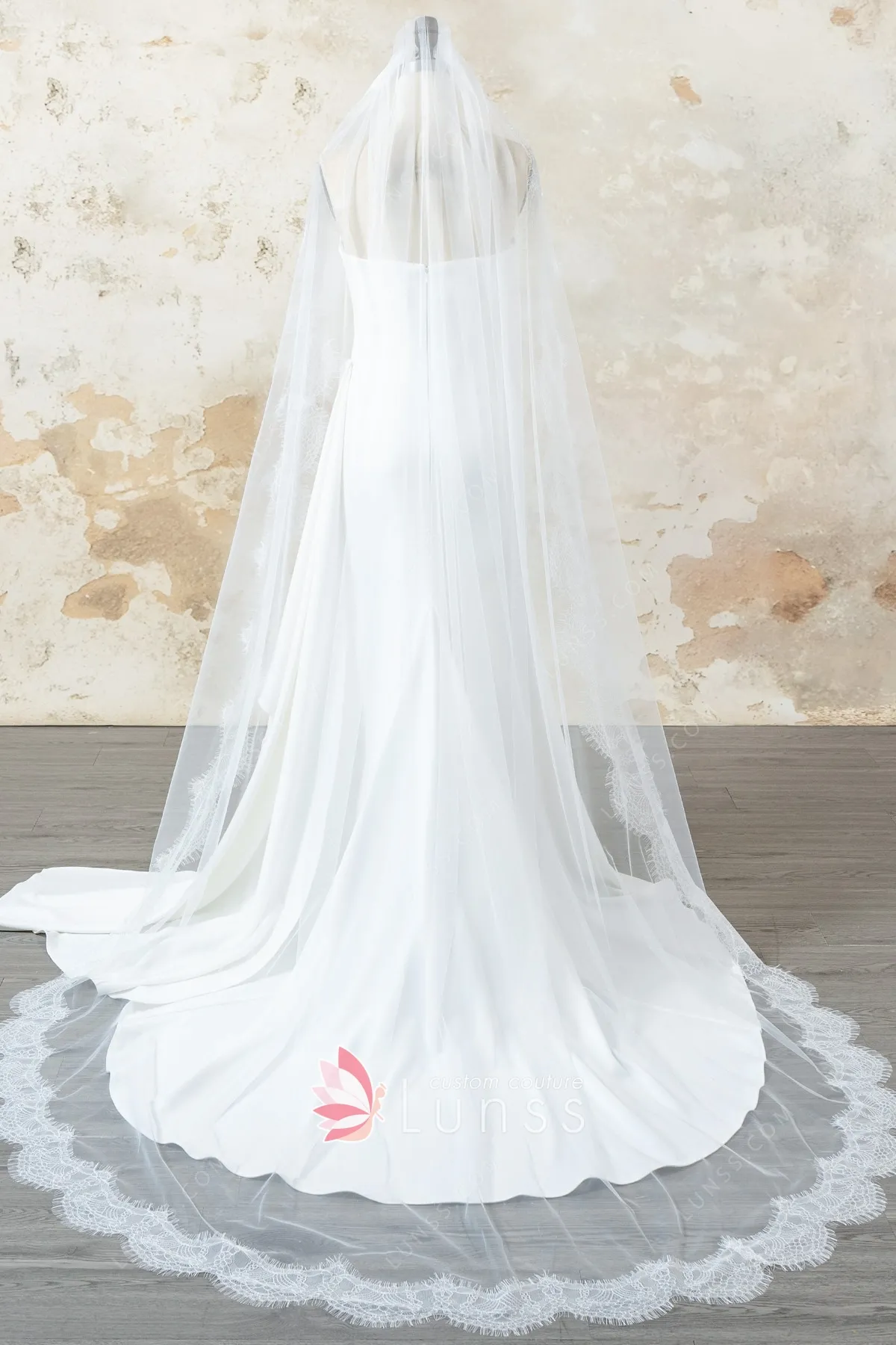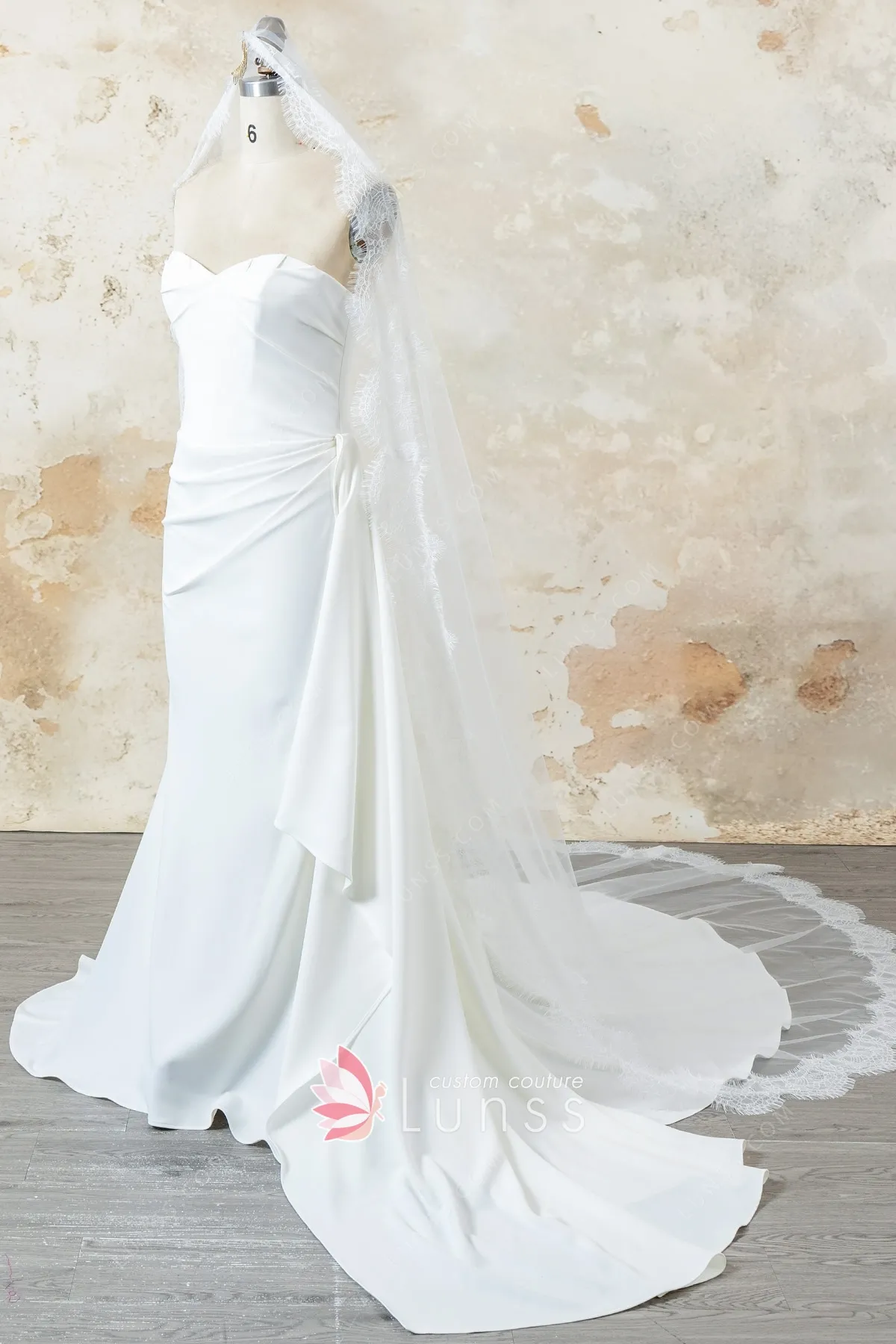 A striking strapless sweetheart neckline wedding gown with a built-in boned corset, crafted from luxurious crepe satin with artfully draped sides. The sleek, figure-hugging mermaid silhouette effortlessly accentuates your curves, creating a stunning and unforgettable look for your special day. This modern bridal shower gown features an elegant chapel train and can be paired with an optional lace-trimmed bridal veil for a touch of classic romance.