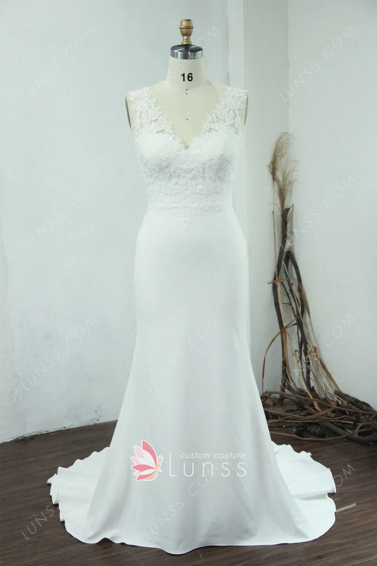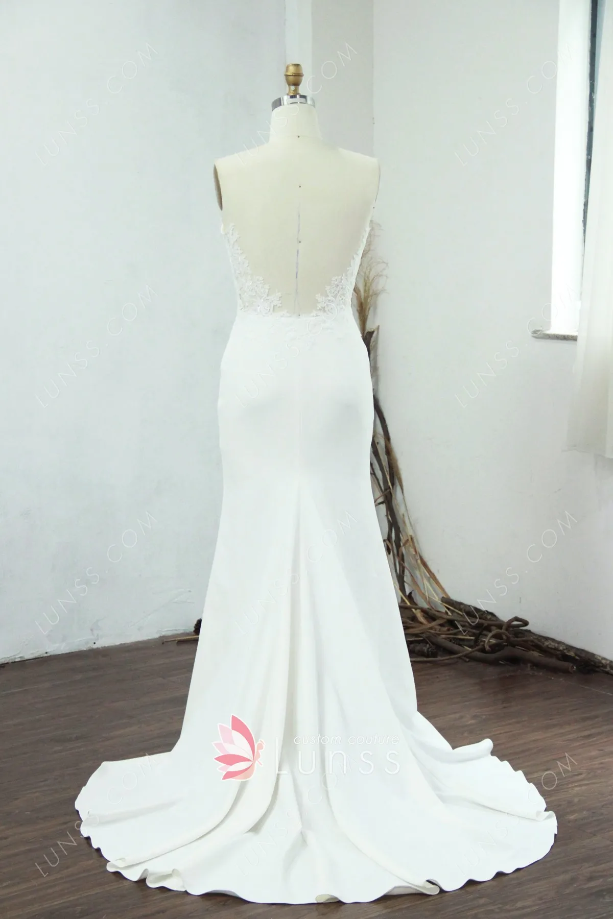 Subtle white lace and satin V neckline with illusion sweetheart wide straps long mermaid spring/summer wedding dress, sheer low back and court train.