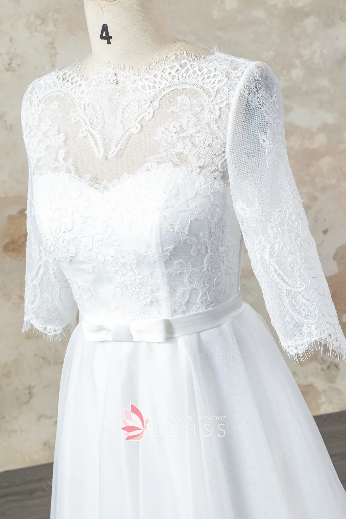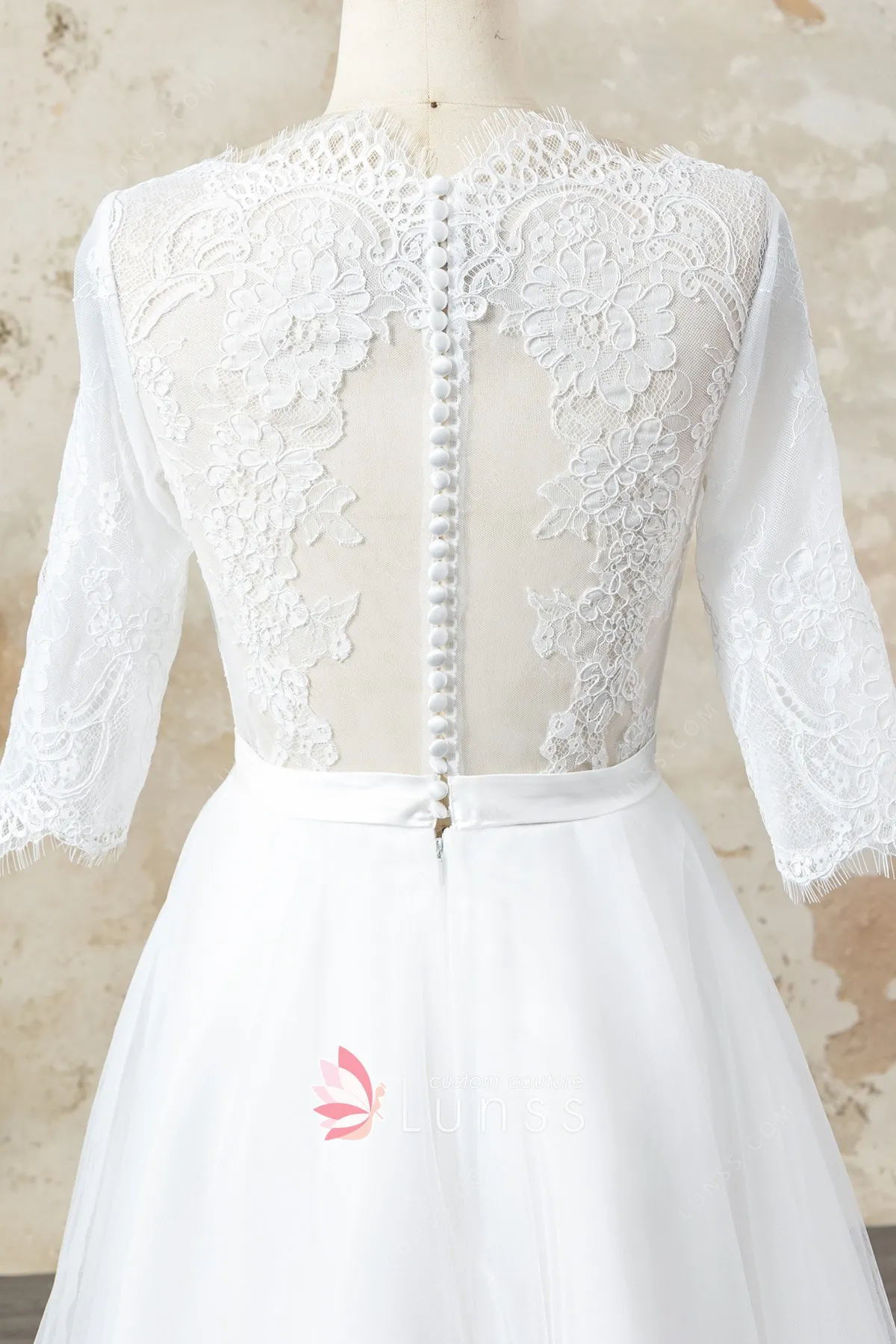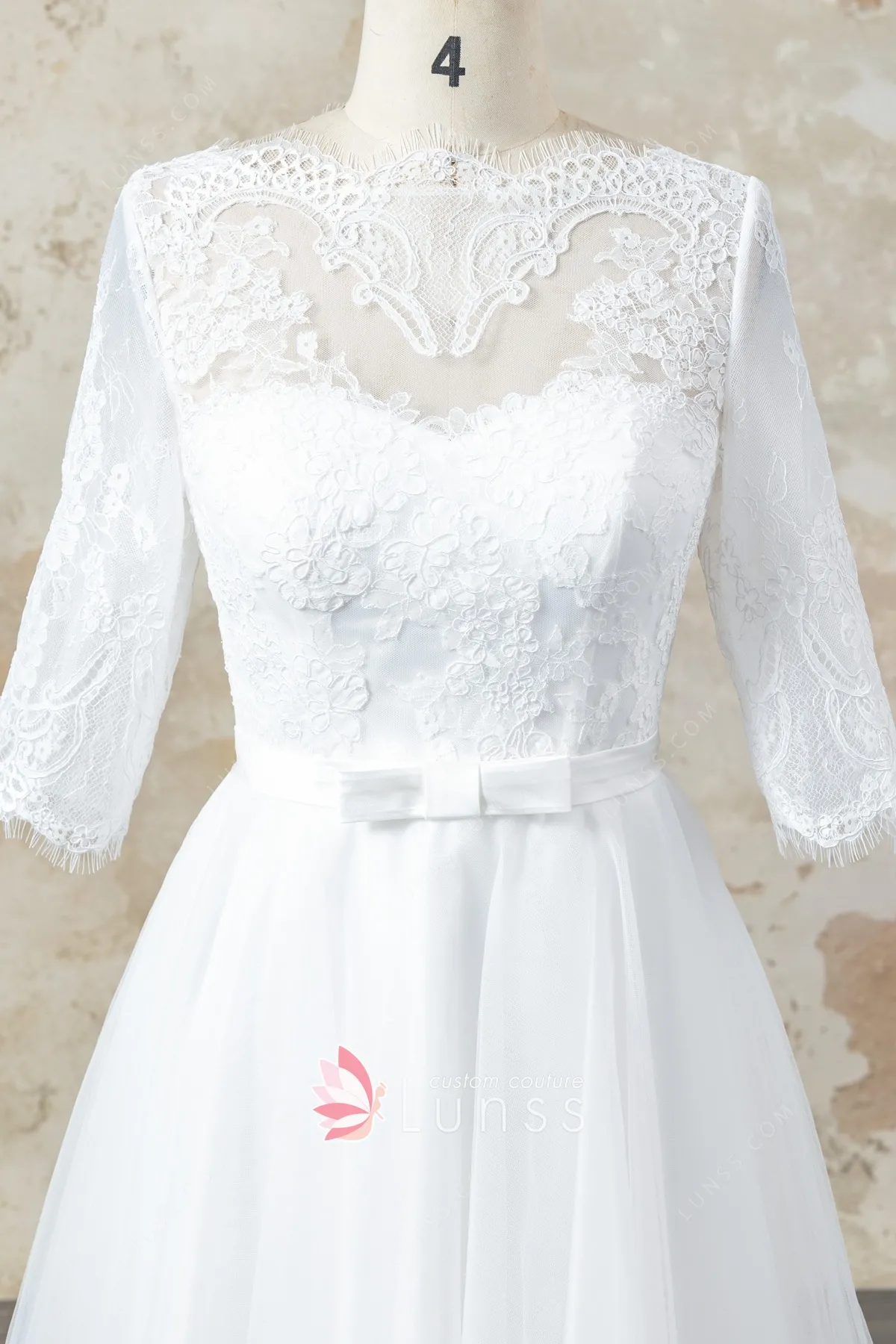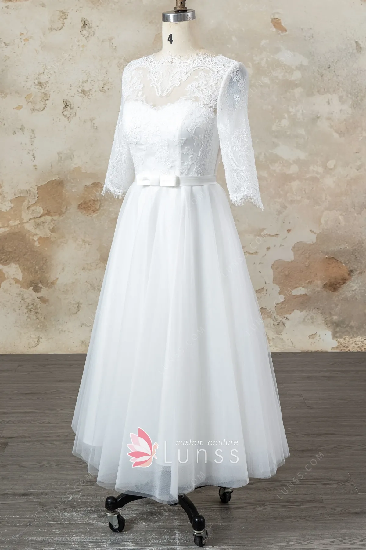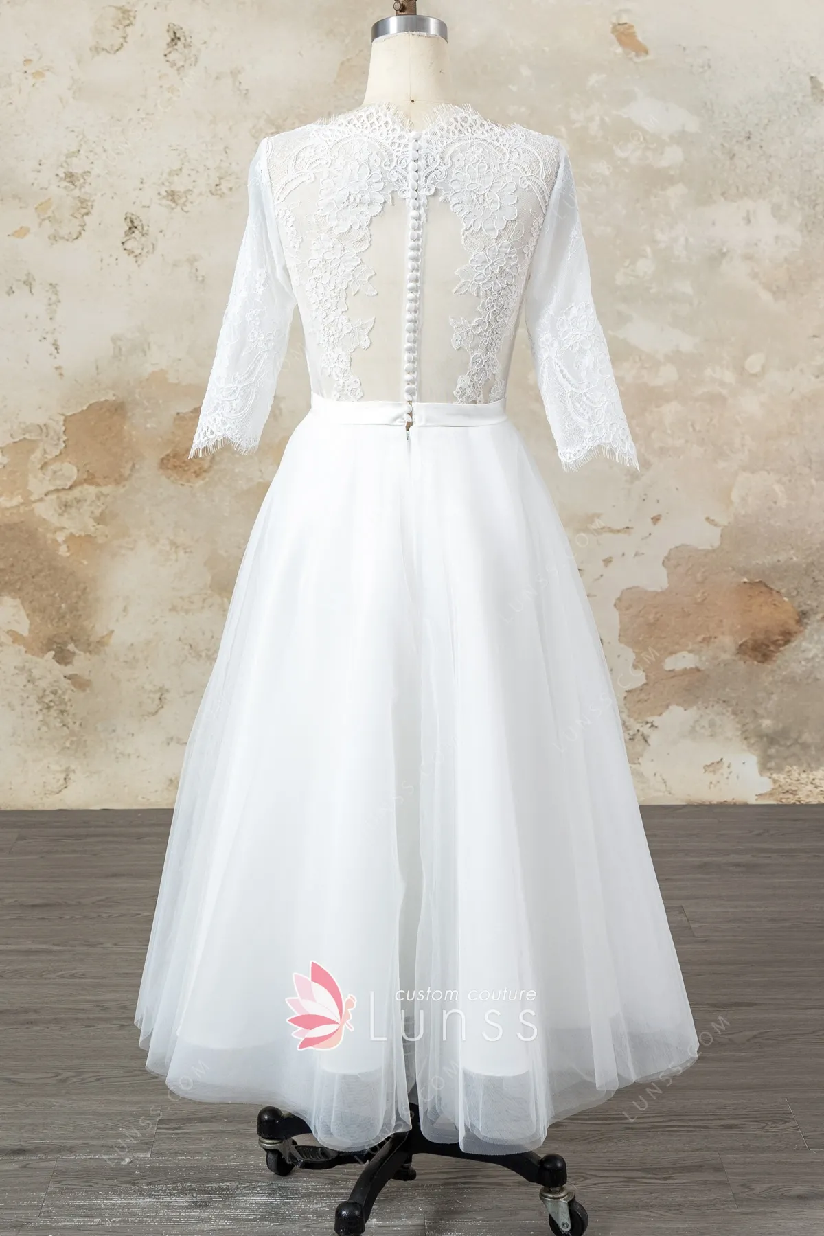 This vintage-inspired bridal dress features a delicate lace bodice with a sheer jewel neckline that flows into elegant half-sleeves, and a sweetheart neckline underneath. The back is beautifully detailed with buttons running down the spine. A satin ribbon belt cinches the waist, an A-line tulle tea-length skirt adding a whimsical and light-as-air feel. This dress is perfect for a bridal shower, a civil ceremony, reception, anniversary, or a classic garden wedding.