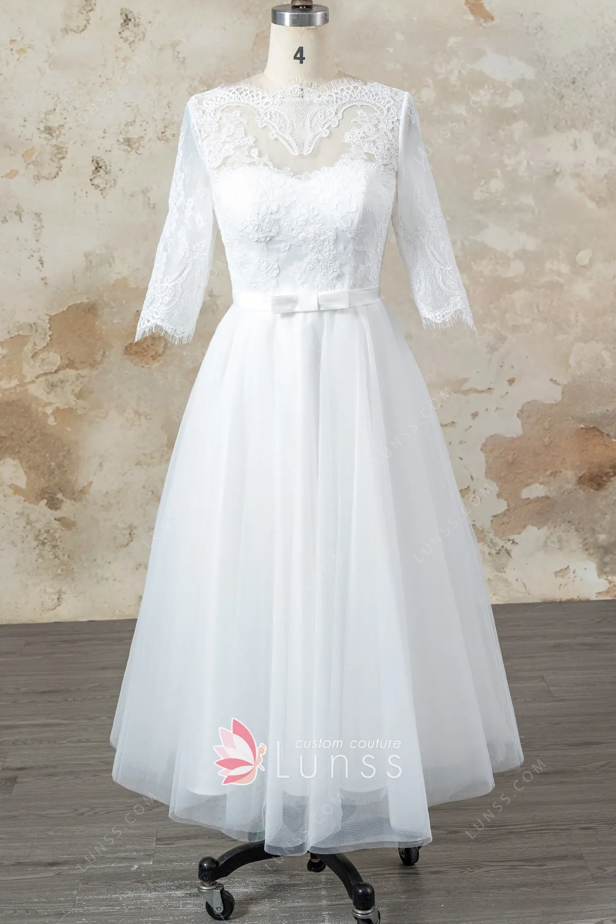 Vintage Tea-length Lace & Tulle Half-sleeve Bridal Dress (2X350)