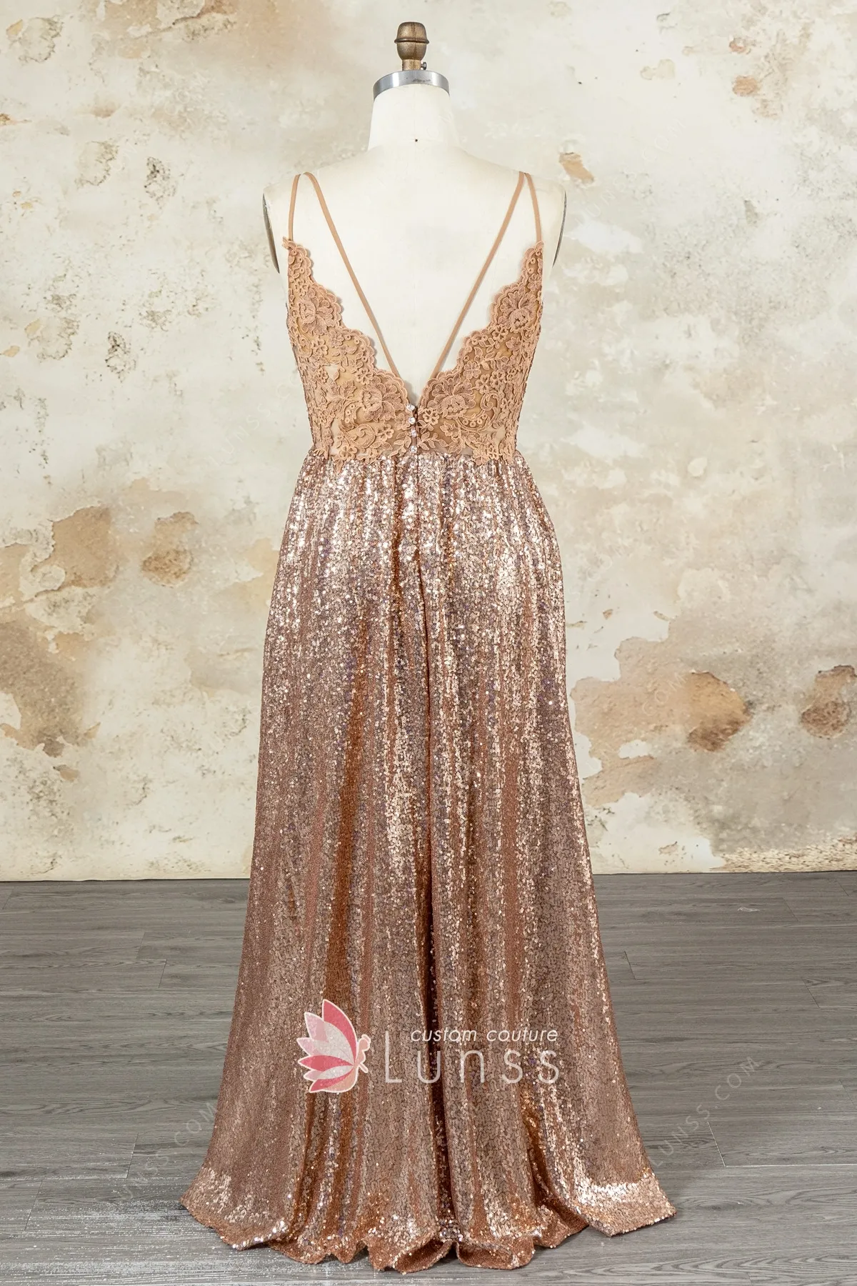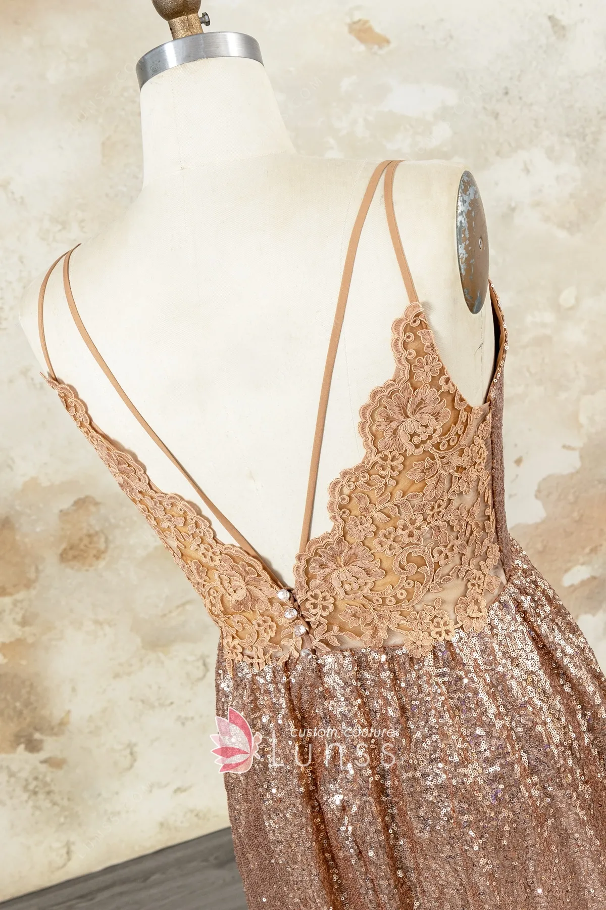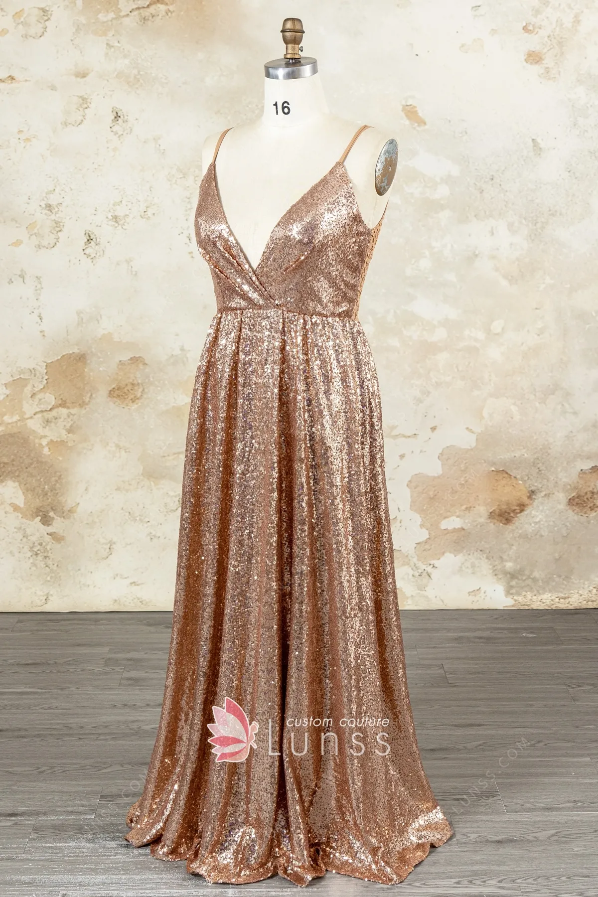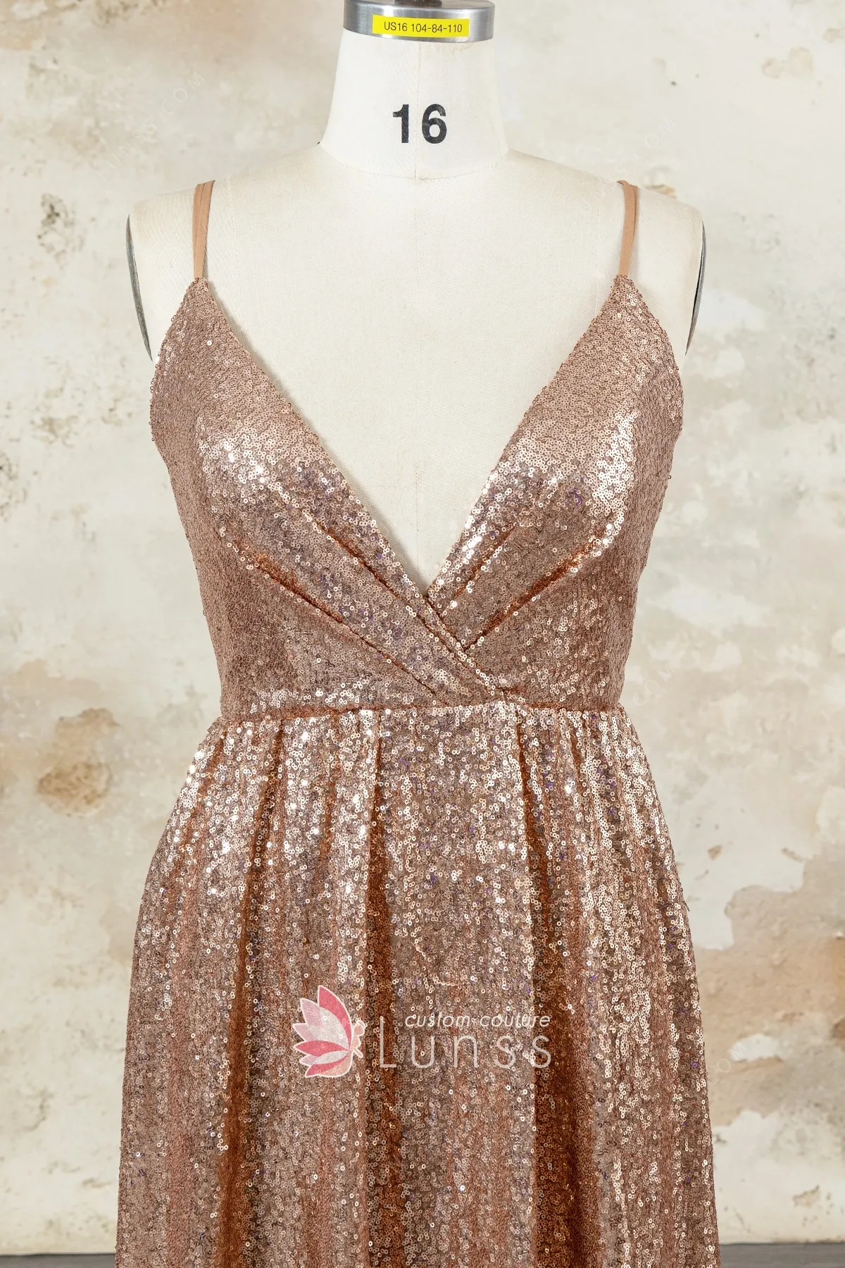 This is a glamorous, full-length A-line bridesmaid dress completely covered in sparkling bronze sequins. The front features a fitted bodice with a deep V-neckline and a ruched, crossover (surplice) design at the bust. It is supported by thin, nude-toned spaghetti straps. The back is open with a deep V-cut, scalloped lace panels. The overall effect is a stunning and eye-catching dress that blends dazzling sparkle with romantic lace details.